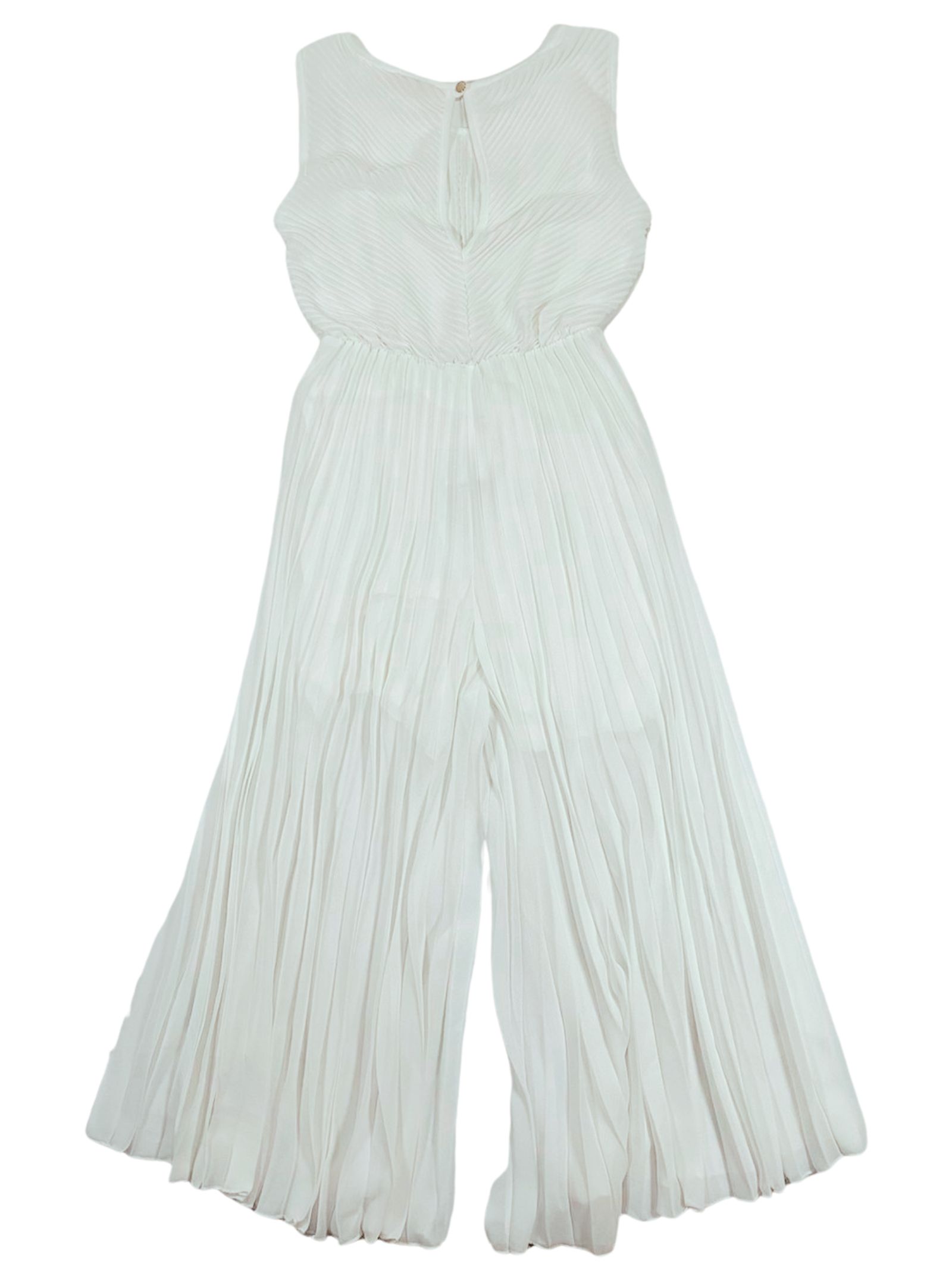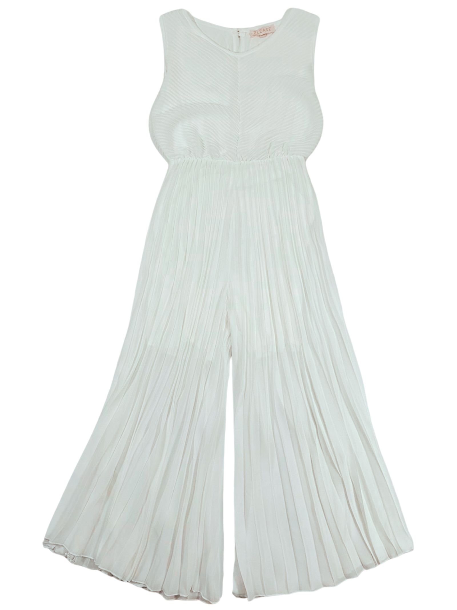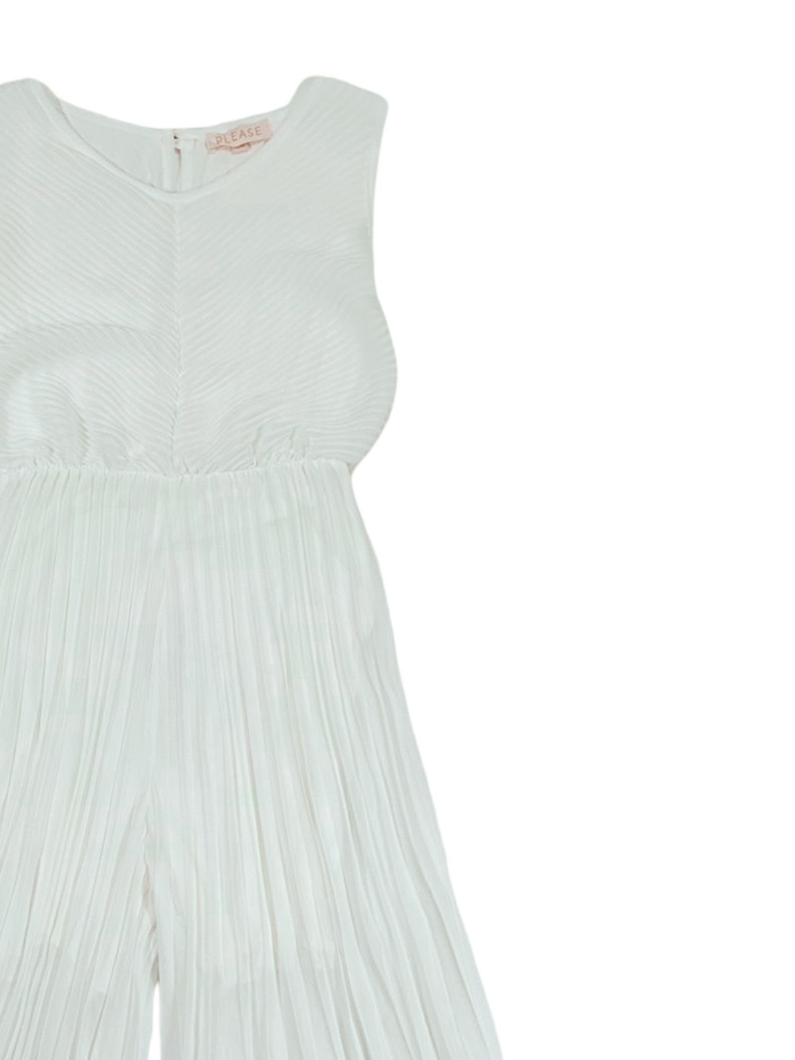 Please Kids abito di colore bianco completamente plissettato, design a tuta, smanicato, girocollo, apertura sul retro con bottone, design con gamba svasata. Composizione: Poliestere 100%. Fodera: 95% viscosa 5% elastan. Made in Italy