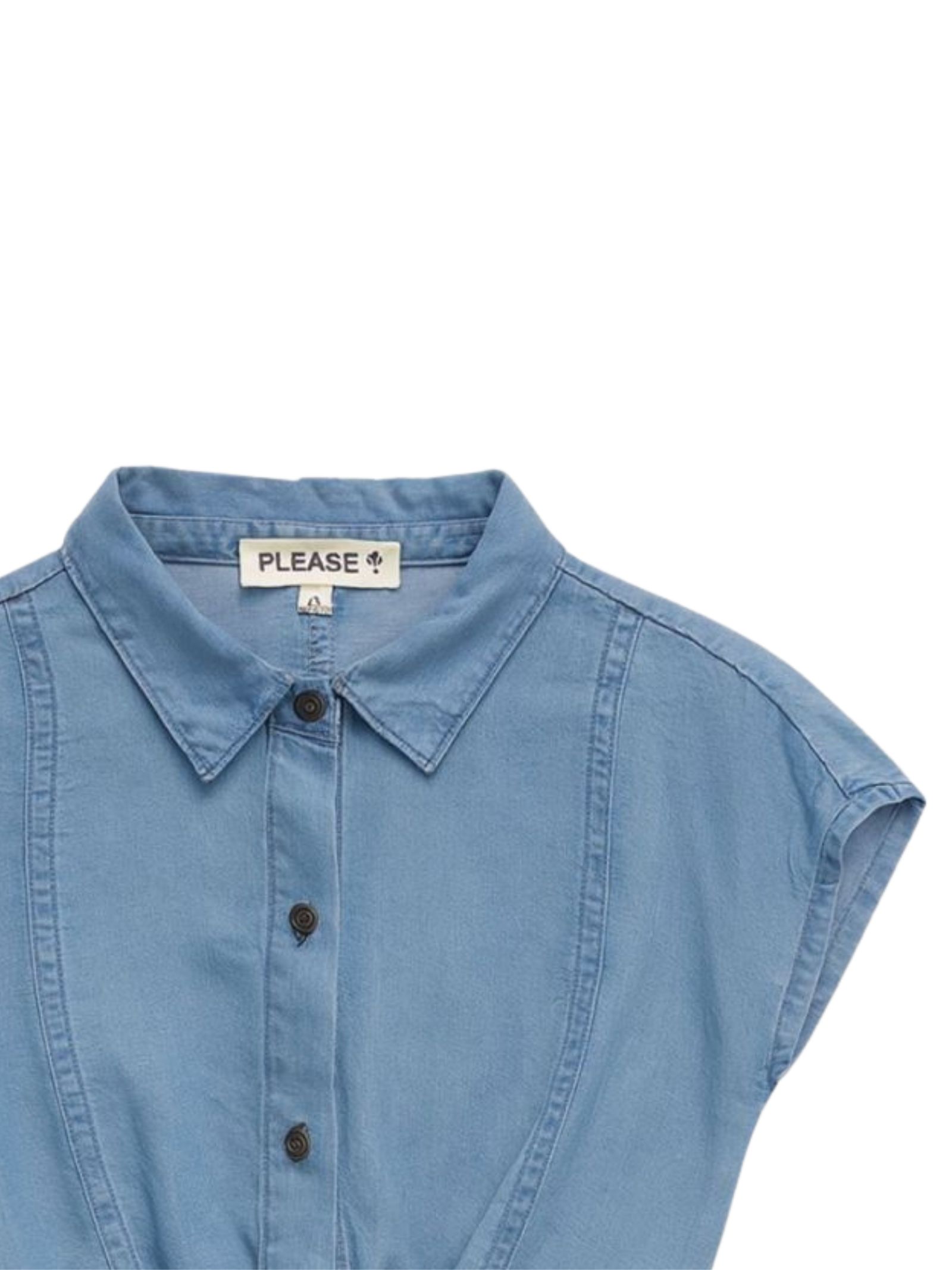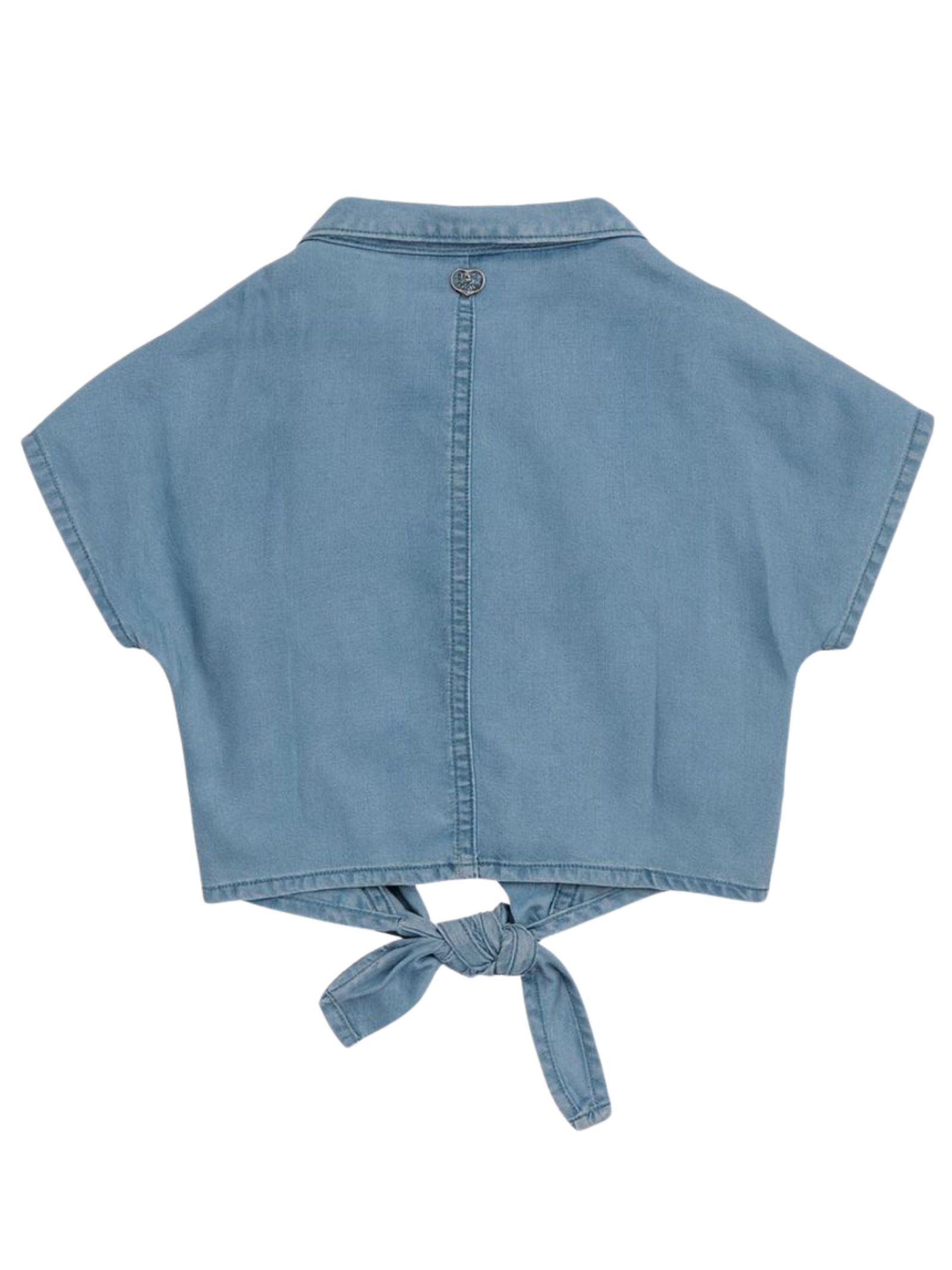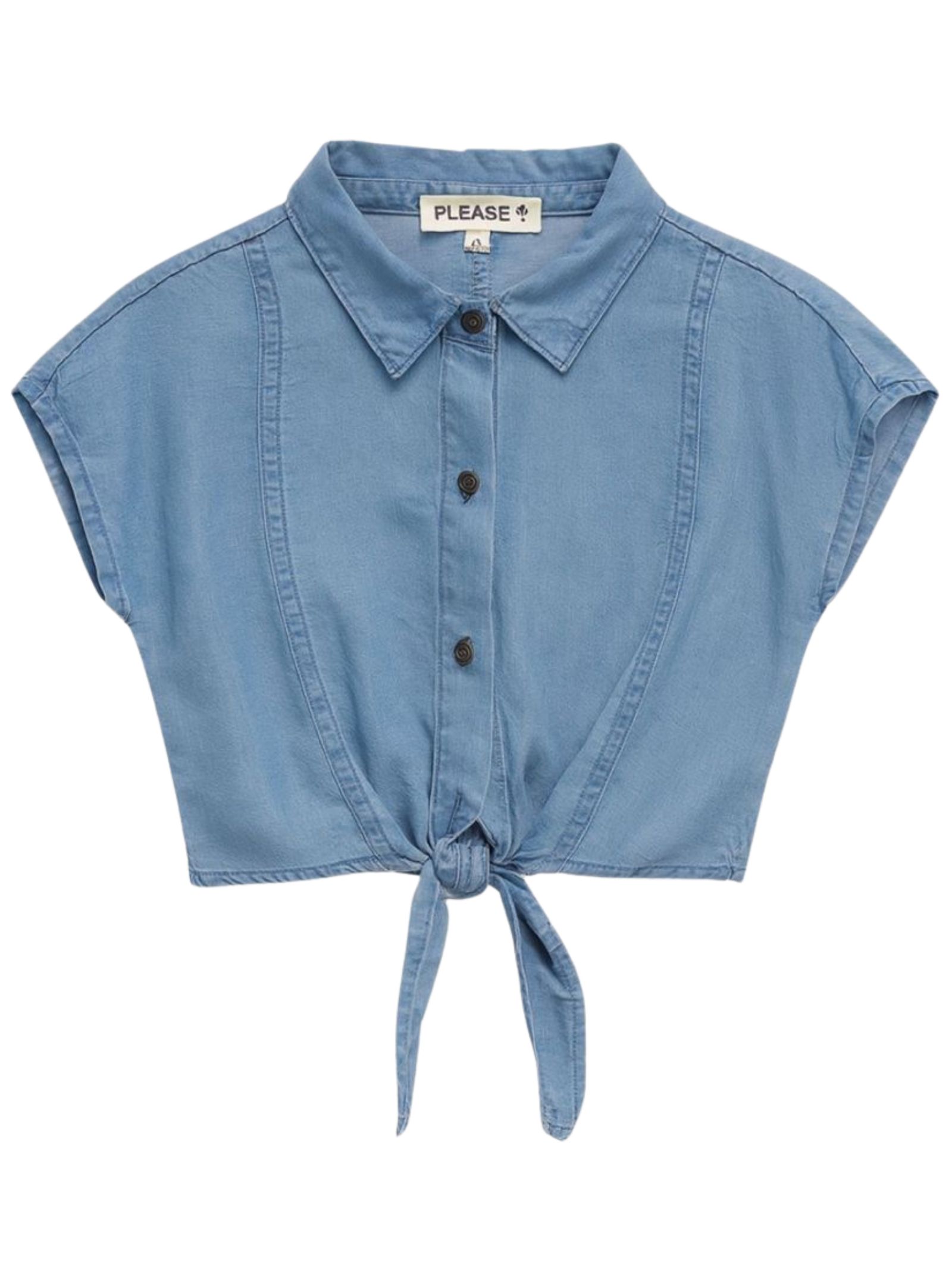 Please Kids blusa bambina realizzata in morbido lyocell di colore azzurro effetto denim, design corto, mezze maniche accennate, nodo centrale. Composizione: 100% lyocell. Made in Italy