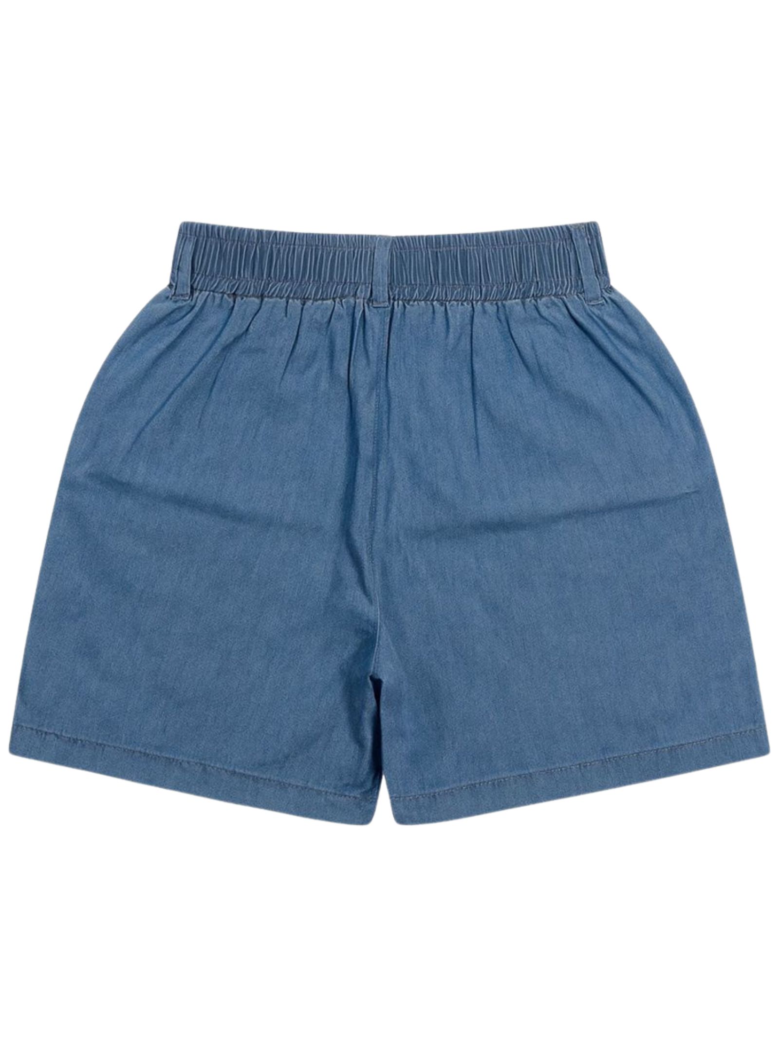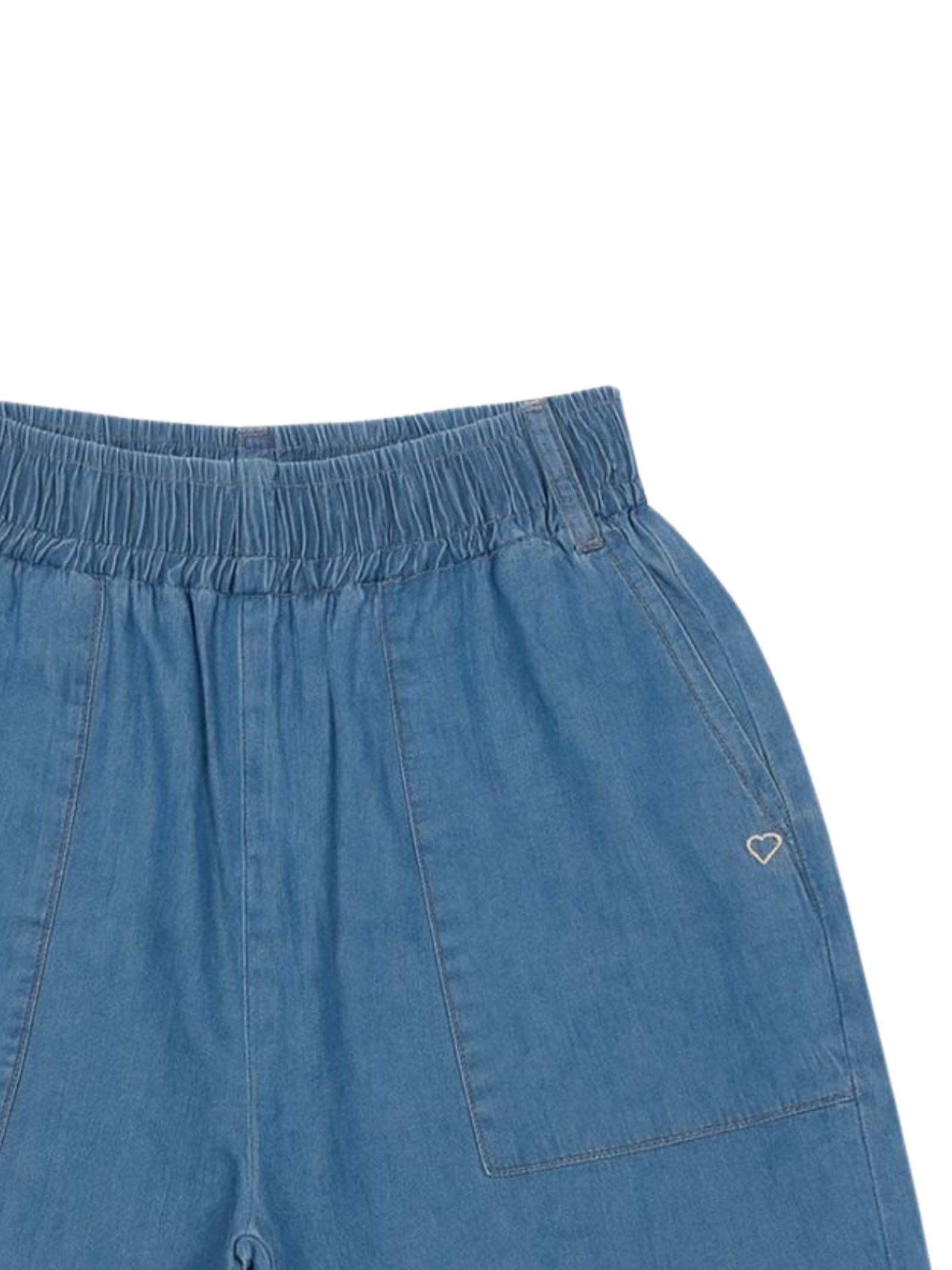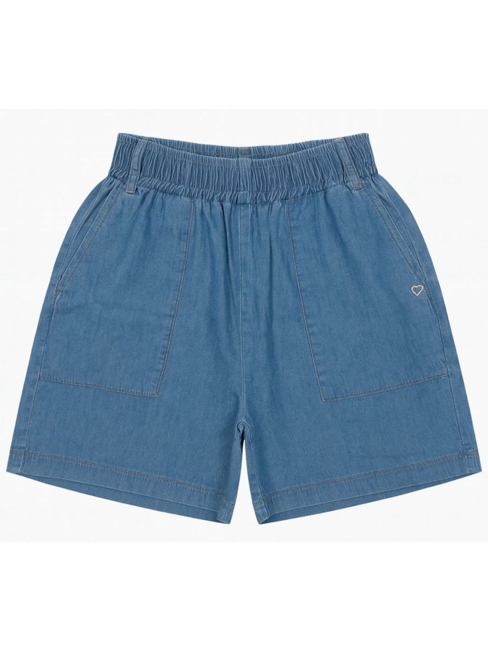 Please Kids shorts realizzato in morbido cotone denim di colore azzurro, design con elastico in vita, due tasche, applicazione logo a forma di cuore, gamba svasata. Composizione: 100% cotone. Made in Italy