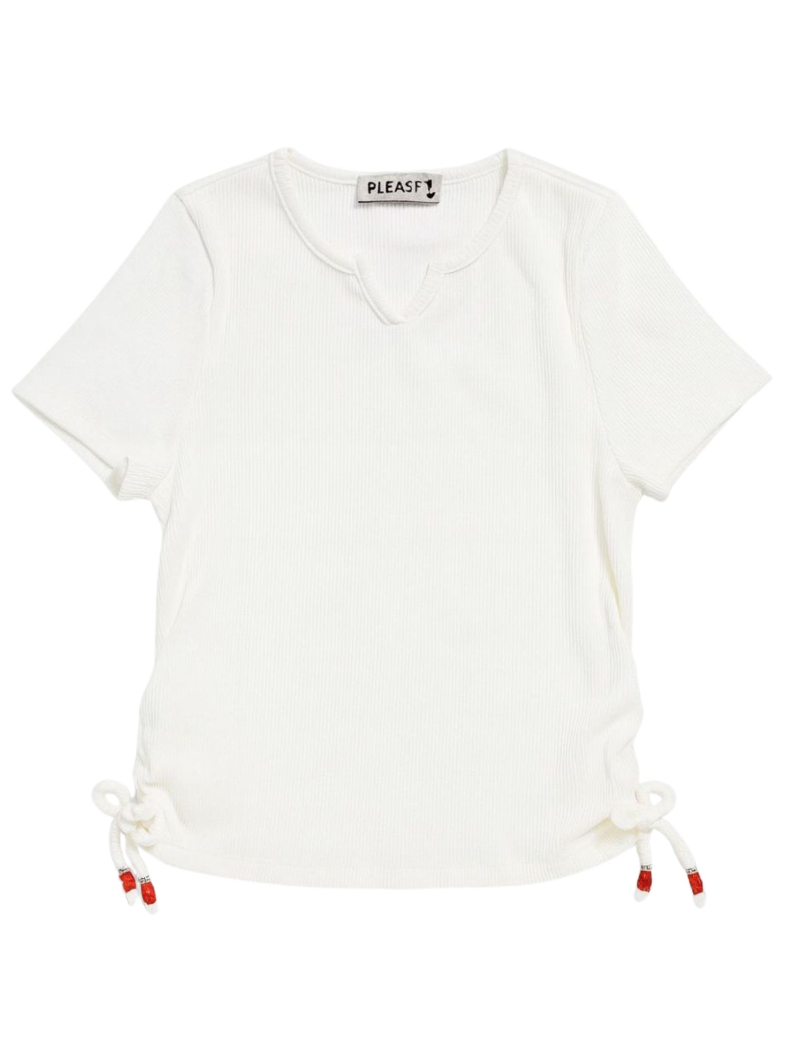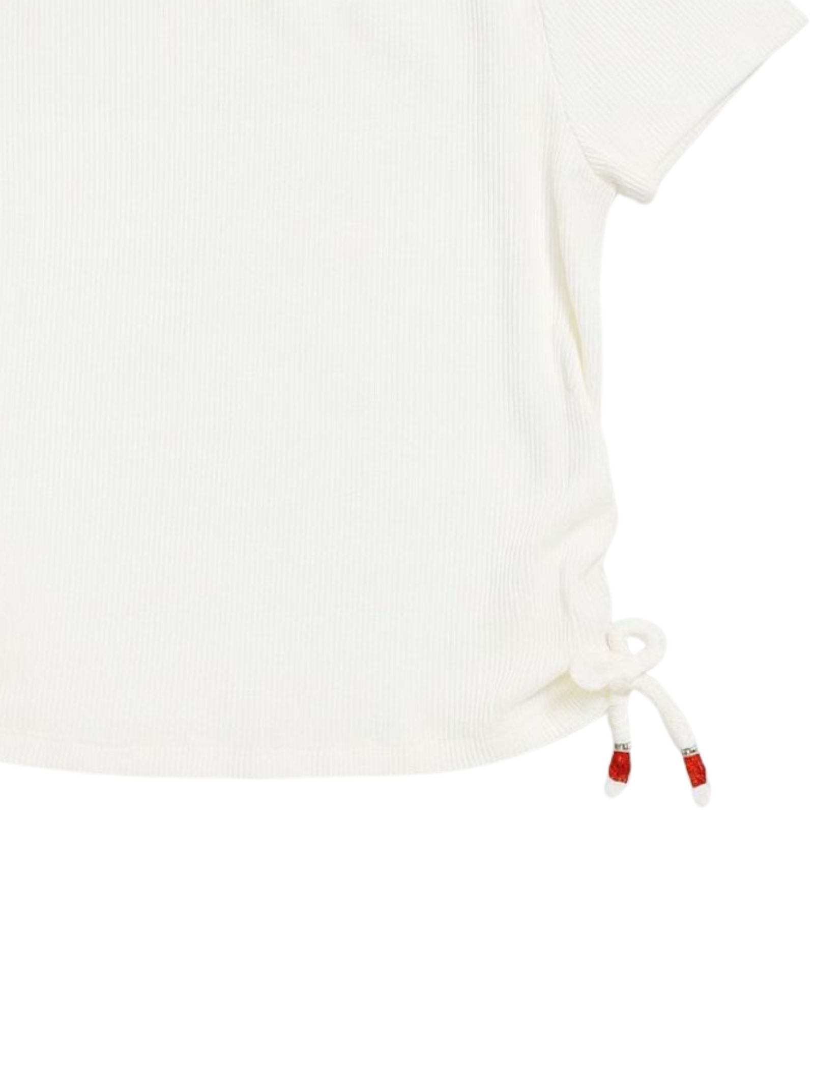 Please Kids t-shirt di colore bianco, realizzata in morbido cotone a costine, modello girocollo, maniche corte, nodi laterali, vestibilità aderente. Composizione: 95% cotone 5% elastan. Made in Italy