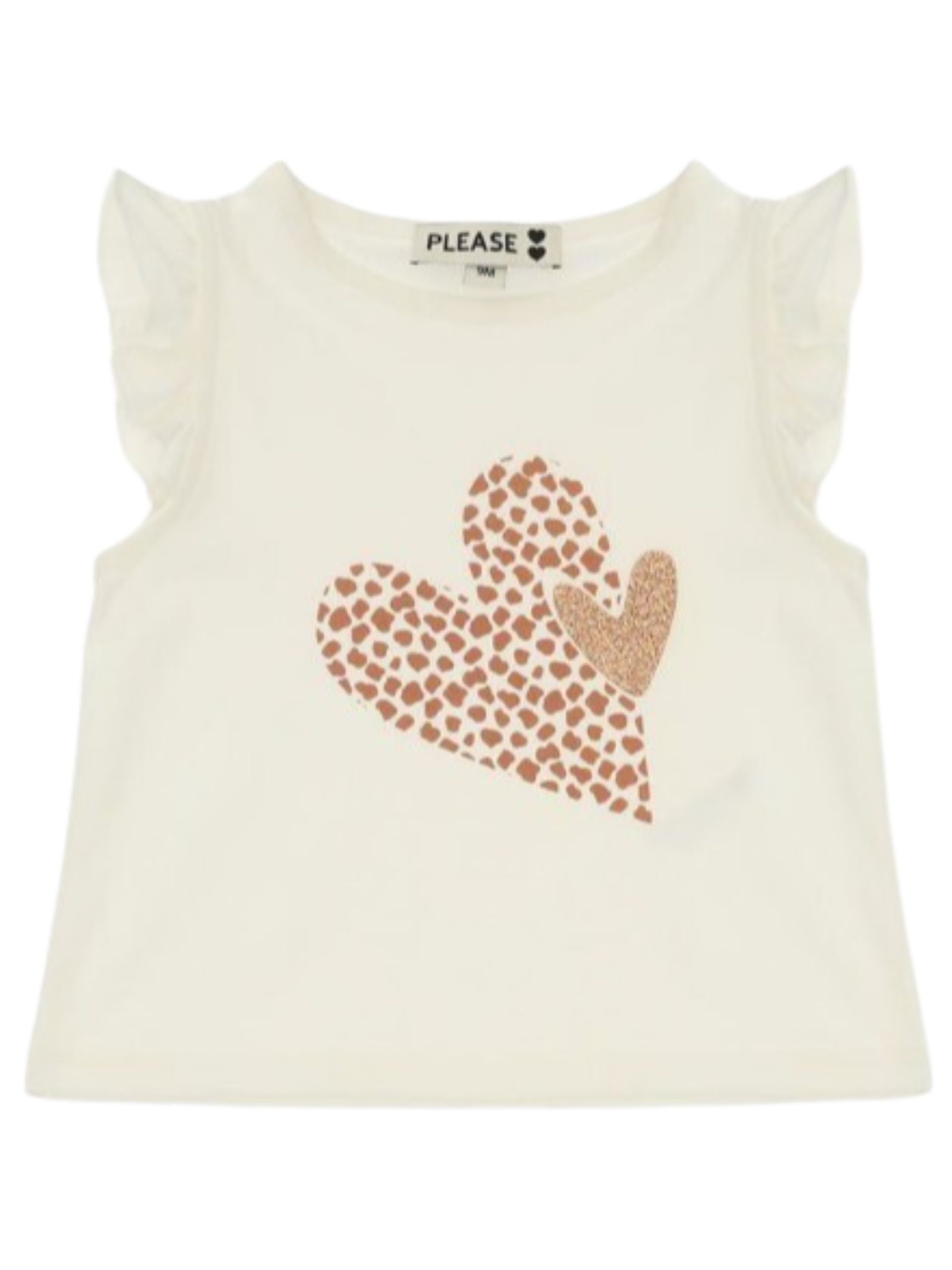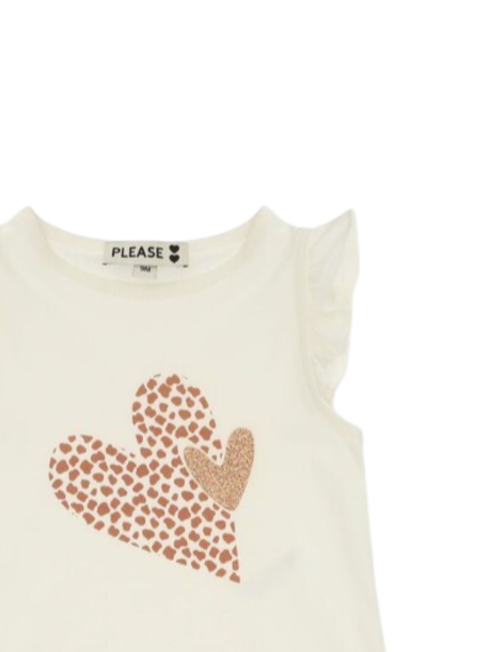 Please Kidst-shirt di colore bianco, modello girocollo, maniche corte ad aletta con rouches, stampa centrale a contrasto, vestibilità regolare. Composizione: 100% cotone. Made in Italy