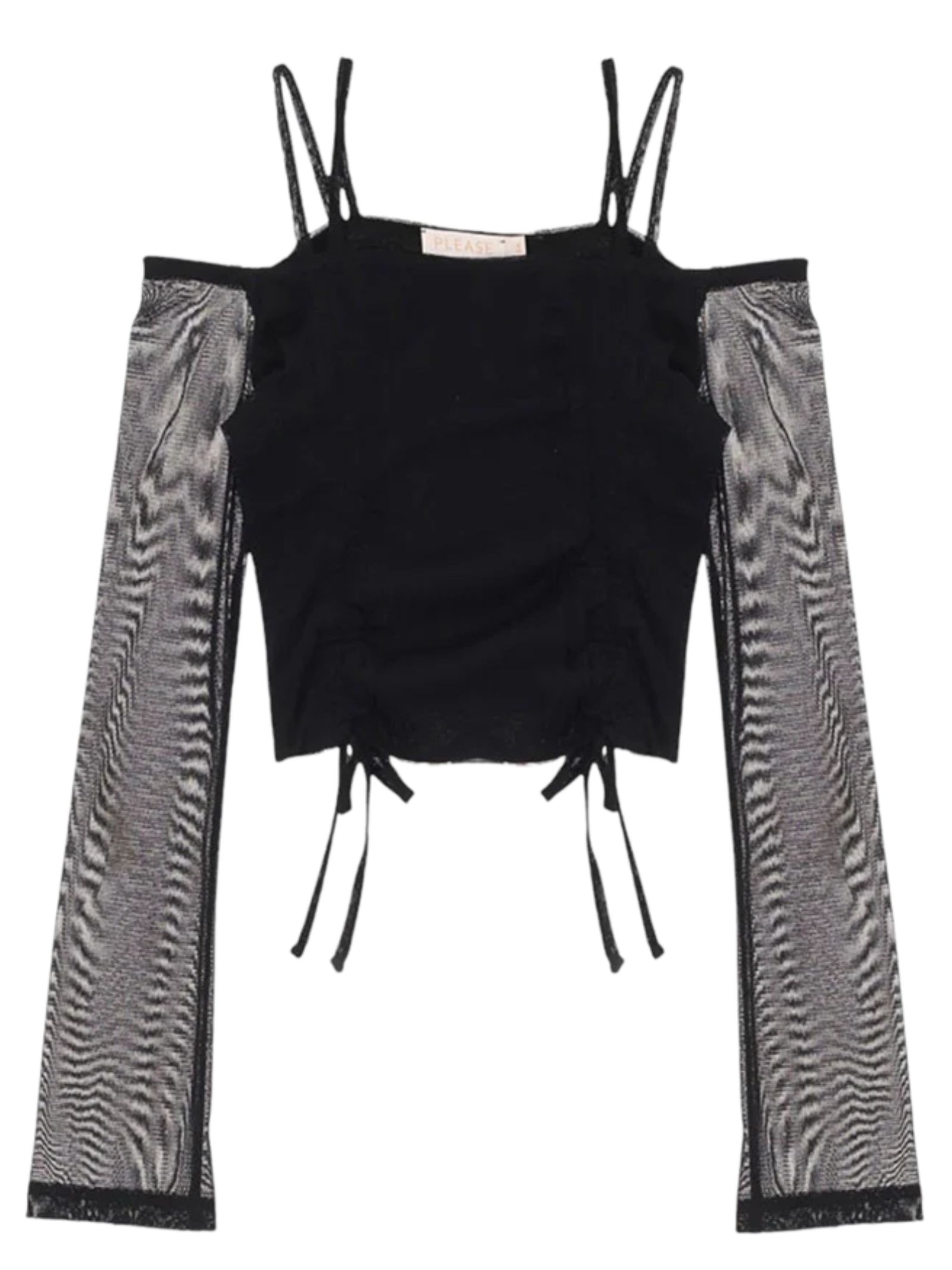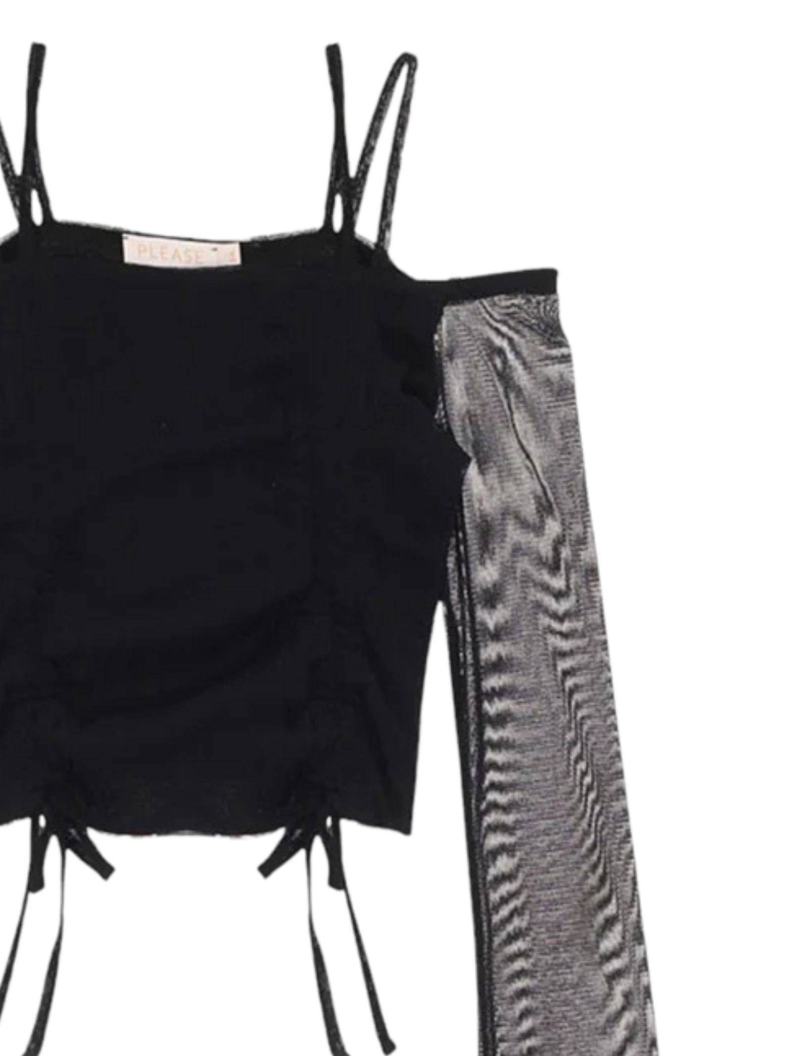 Please Kids top di colore nero, modello cropped con spalline sottili, maniche lunghe in tulle elasticizzato, laccetti decotrativi. Composizione: 68% poliestere 29% viscosa 3% elastan. Made in Italy
