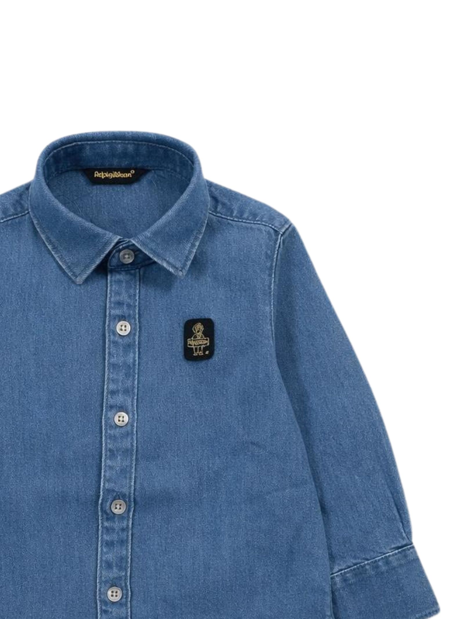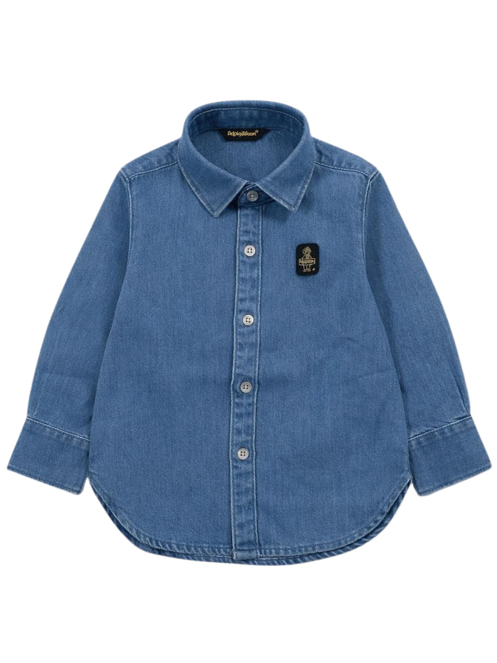 Refrigiwear Kids camicia in cotone denim dal lavaggio medio-chiaro, modello con colletto classico, manica lunga, applicazione logo in rilievo sul petto, orlo curvo, vestibilità regolare. Composizione: 85% cotone 15% poliestere