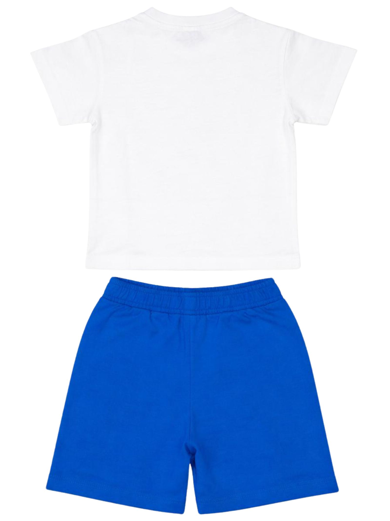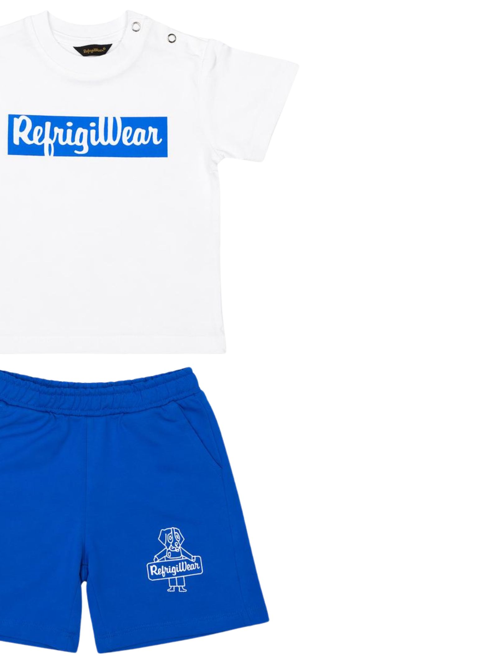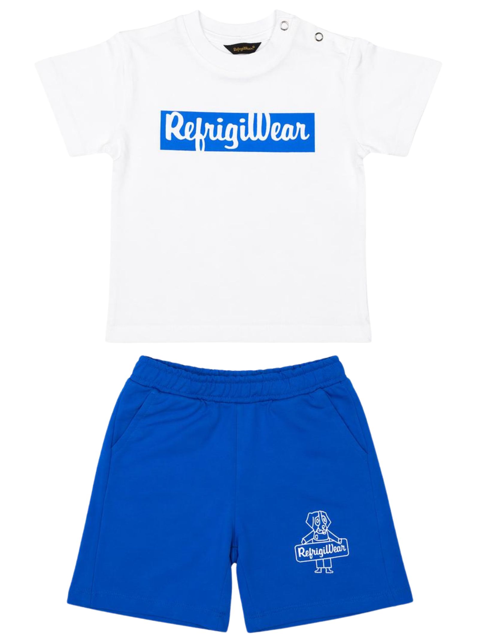 Refrigiwear Kids completo di colore bianco/azzurro, composto da t-shirt girocollo, mezza manica con logo centrale a contrasto e bottoncini a clip sulla spalla, bermuda abbinato con elastico in vita, due tasche a filo laterali, vestibilità regolare. Composizione: 100% cotone