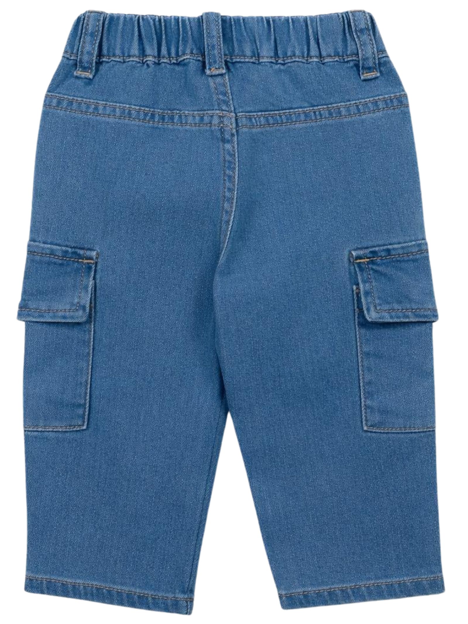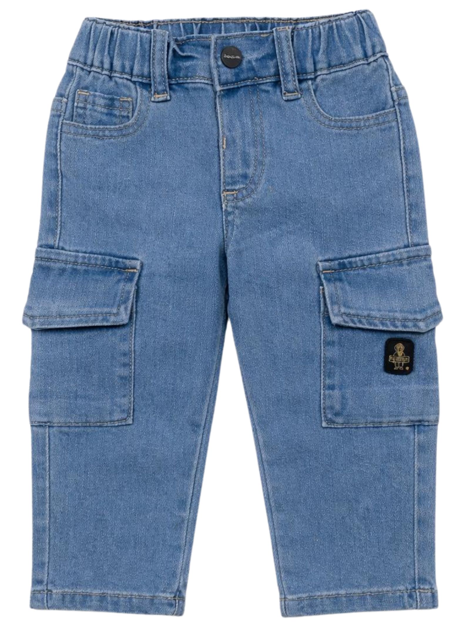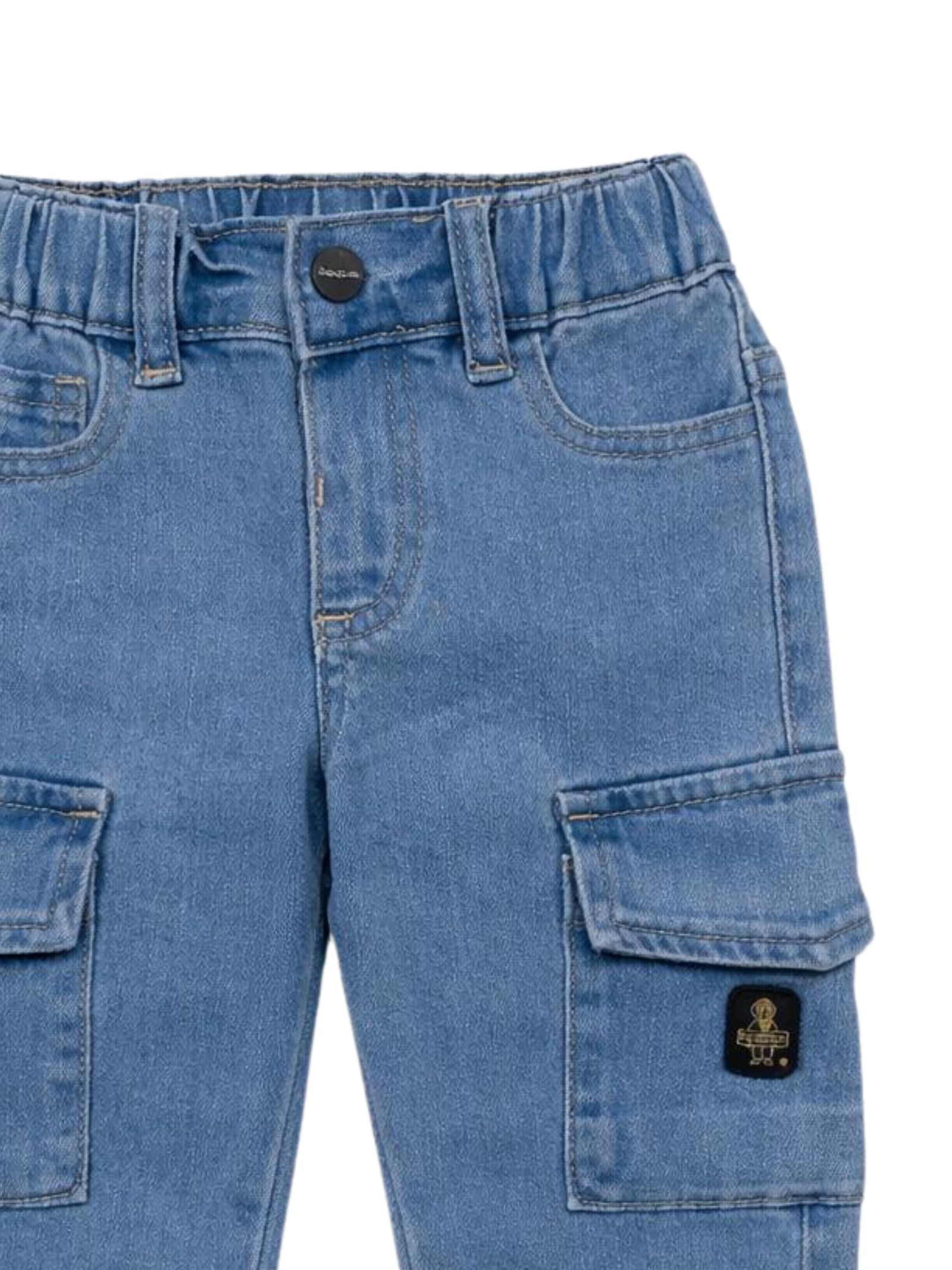 Refrigiwear Kids jeans in cotone denim dal lavaggio medio-chiaro, modello cargo con elastico in vita, chiusura centrale con zip e bottone automatico, passanti, due tasche laterali, due tasconi laterali con patta, applicazione logo in rilievo, vestibilità regolare. Composizione: 70% Cotone 29% poliestere 1% elastan