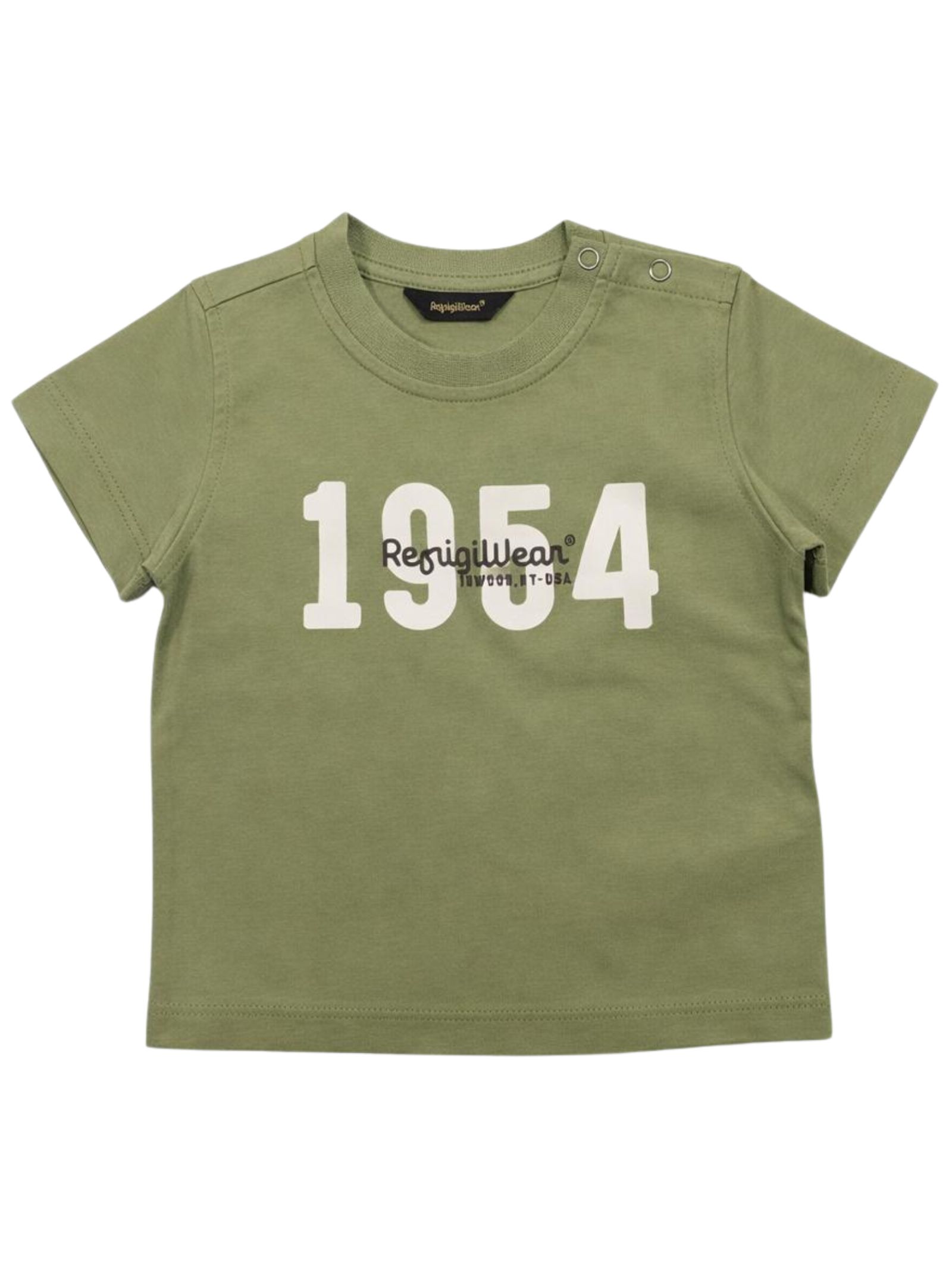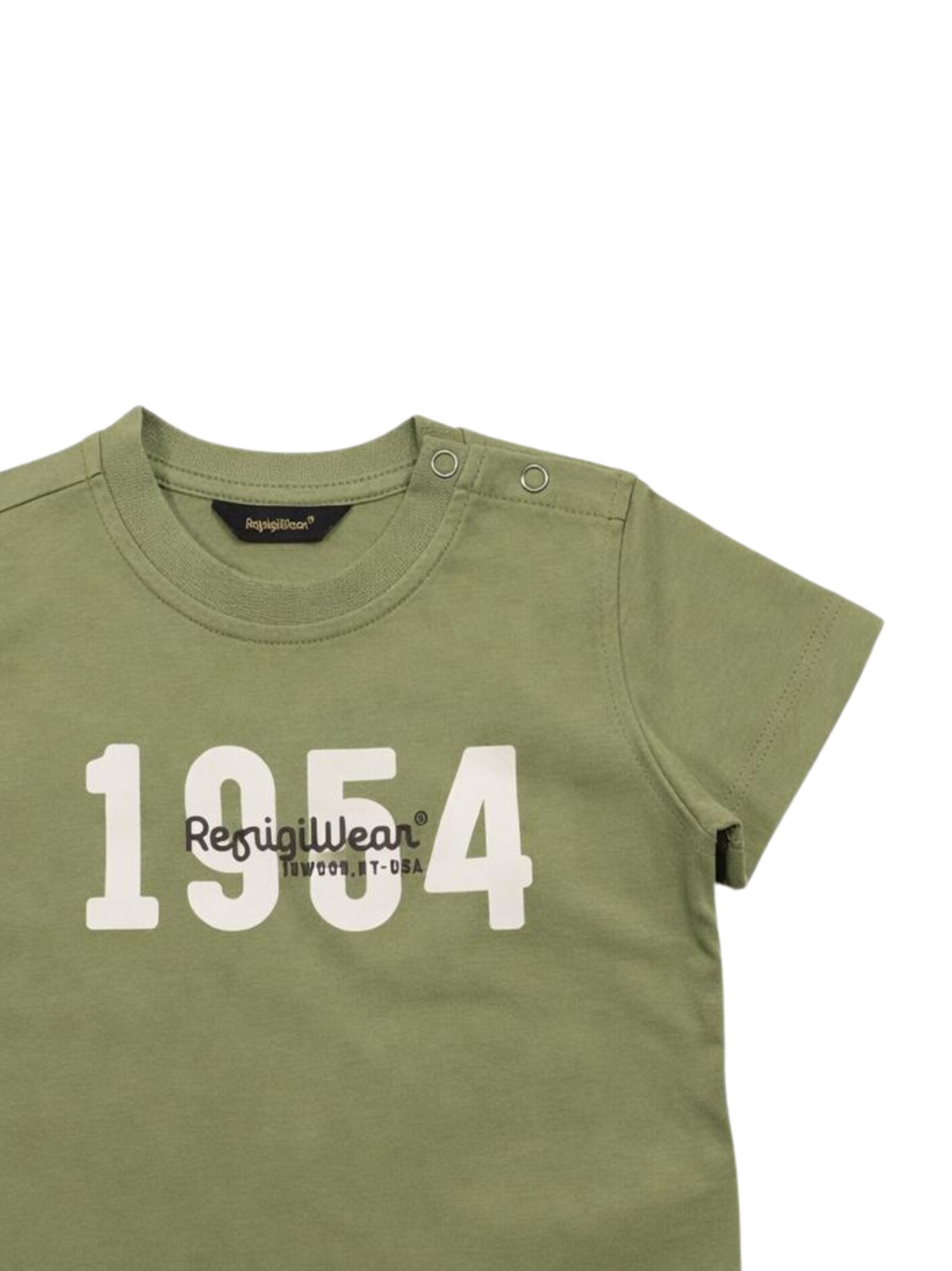 Refrigiwear Kids t-shirt di colore verde, modello girocollo, mezza manica, stampa centrale a contrasto con logo, bottoni automatici sulla spalla, vestibilità regolare. Composizione: cotone 100%