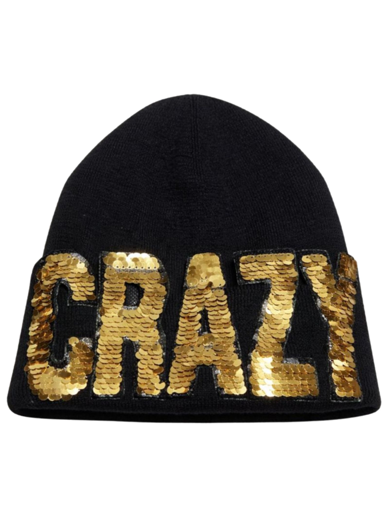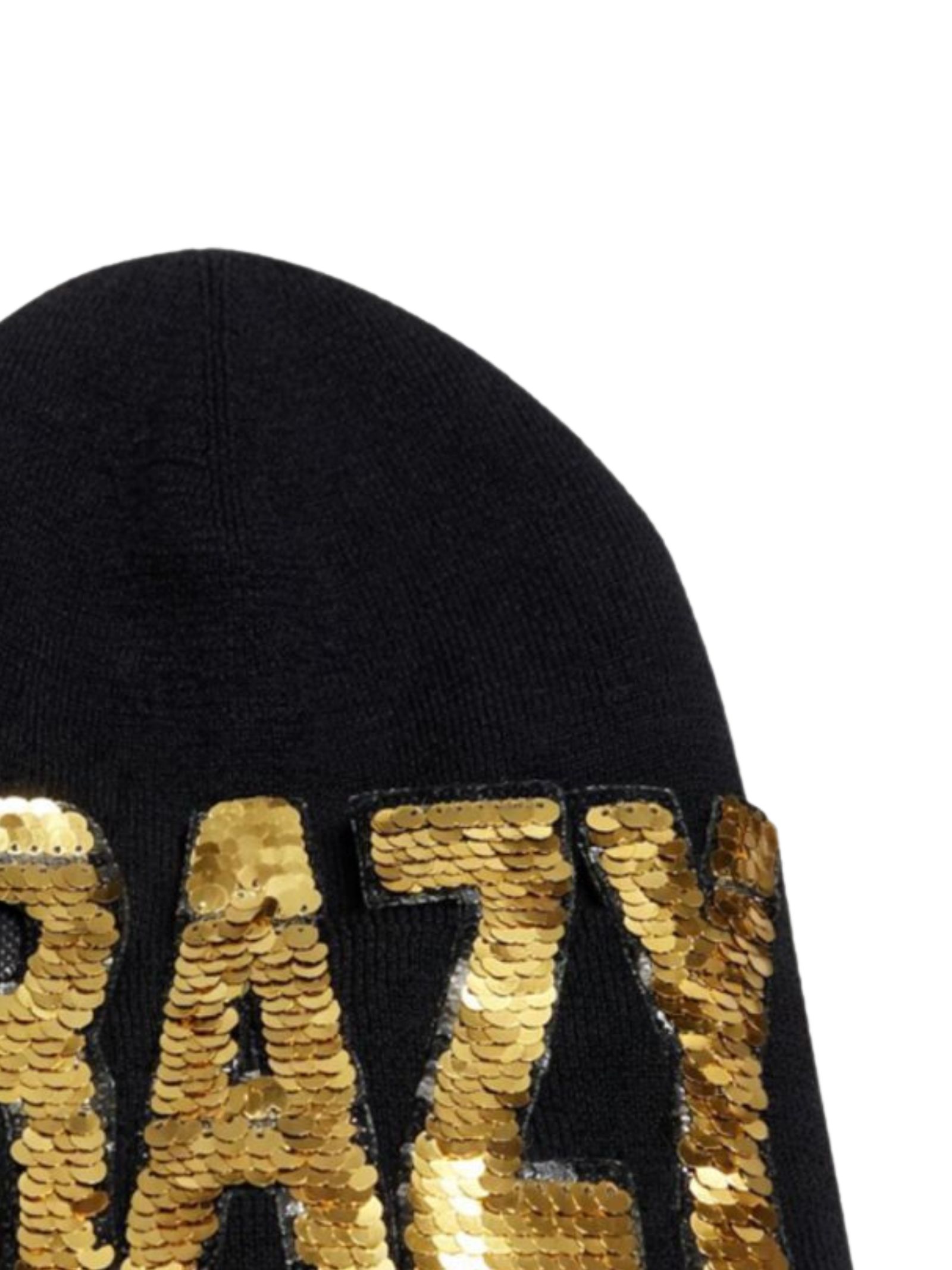 Regina Kids cappello realizzato a maglia di colore nero, design a cuffia, scritta con paillettes a contrasto oro. Composizione: 100% lana. Made in Italy