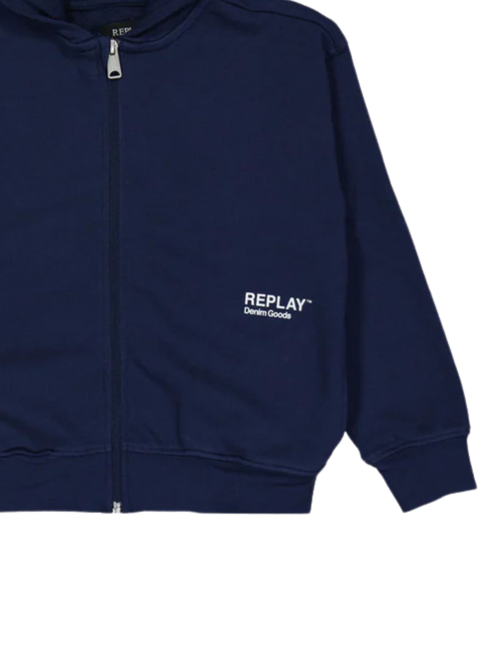 Replay Kids felpa di colore blu, modello con cappuccio, maniche lunghe, stampa logo a contrasto su entrambi i lati, orli a costine, vestibilità regolare. Composizione: 90% cotone 10% poliestere