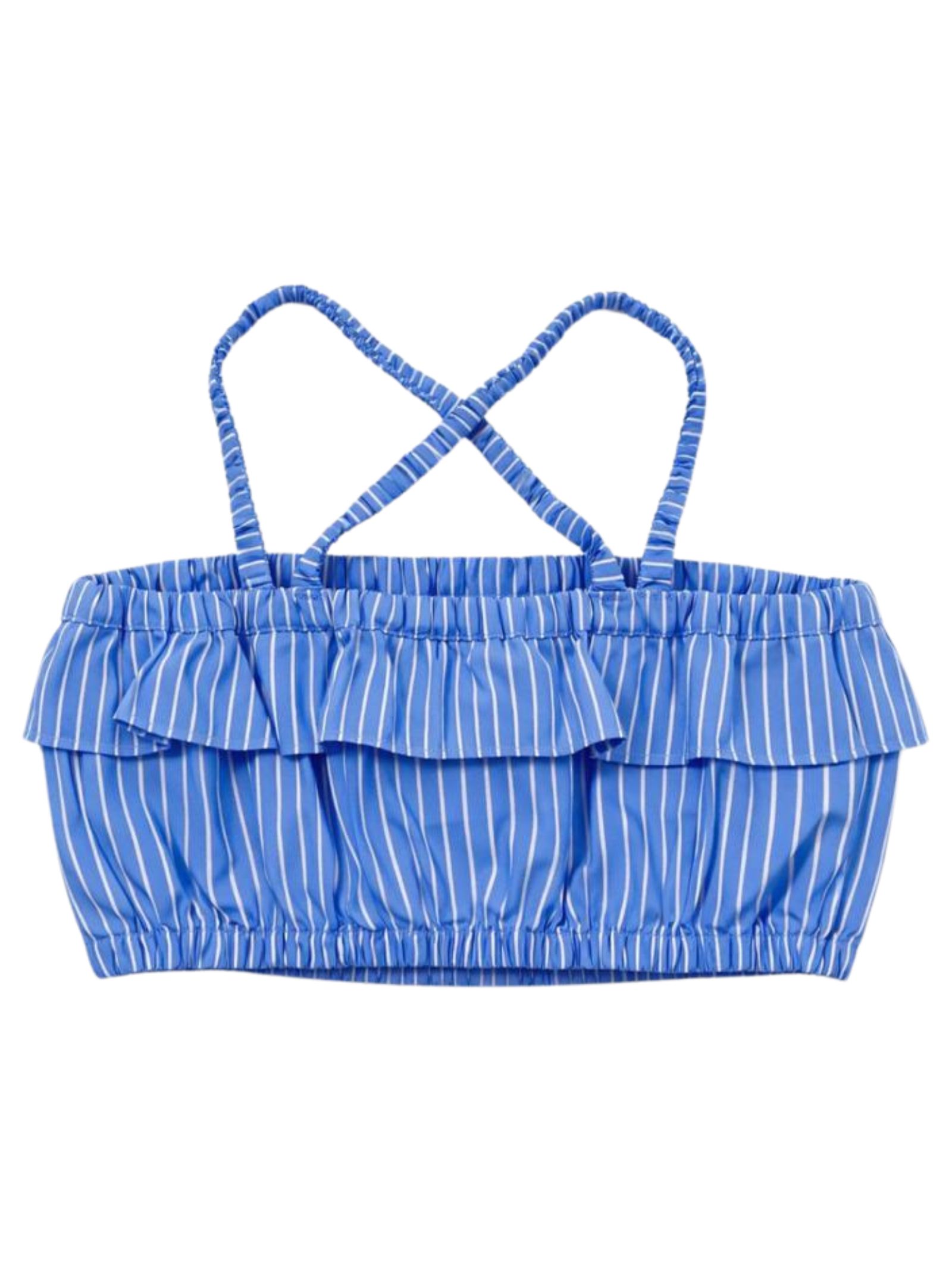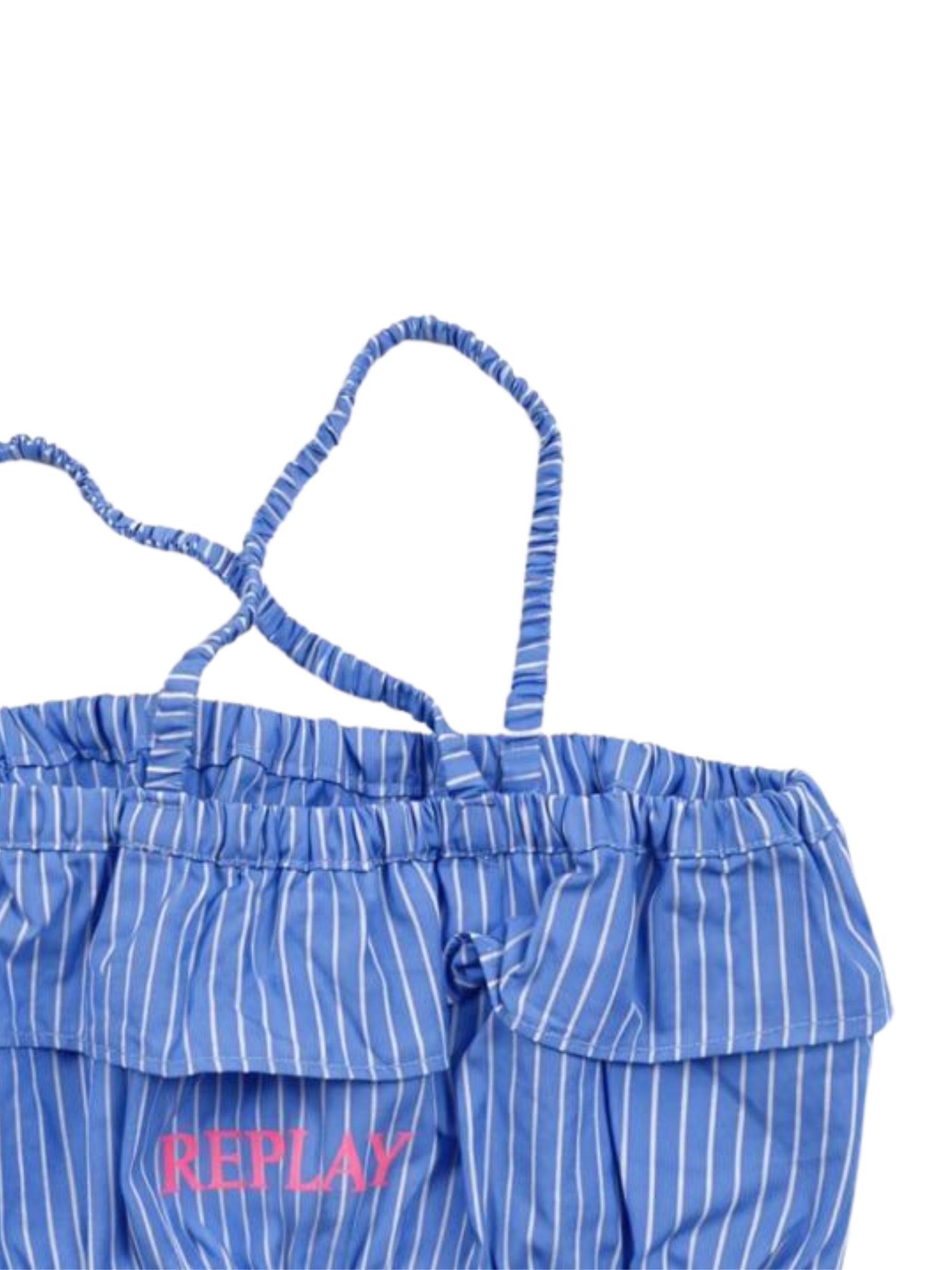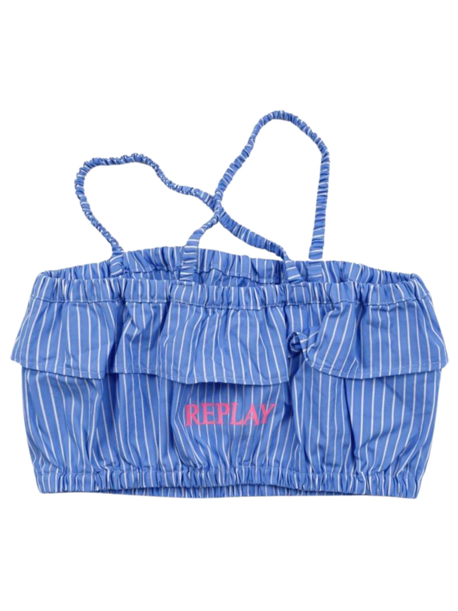 Replay Kids top di colore azzurro in fantasia a righini bianco, modello corto con bretelle e bordo elastico, stampa logo sul retro a contrasto fucsia fluo, dettaglio volant. Composizione: 100% Cotone