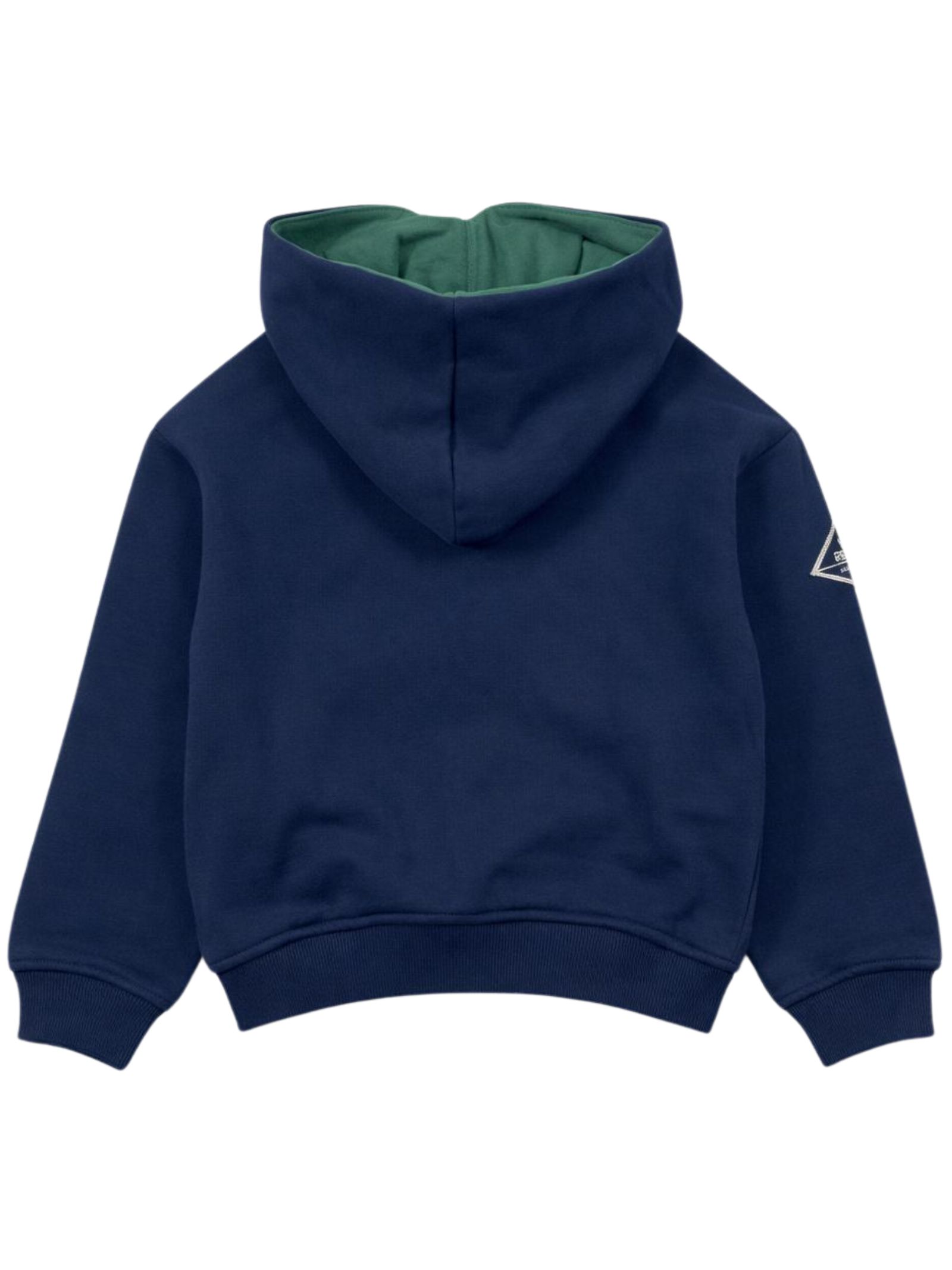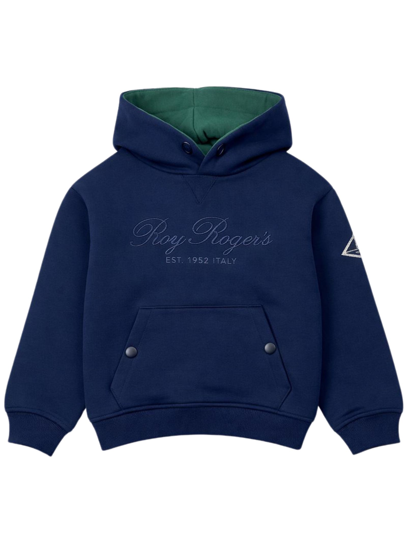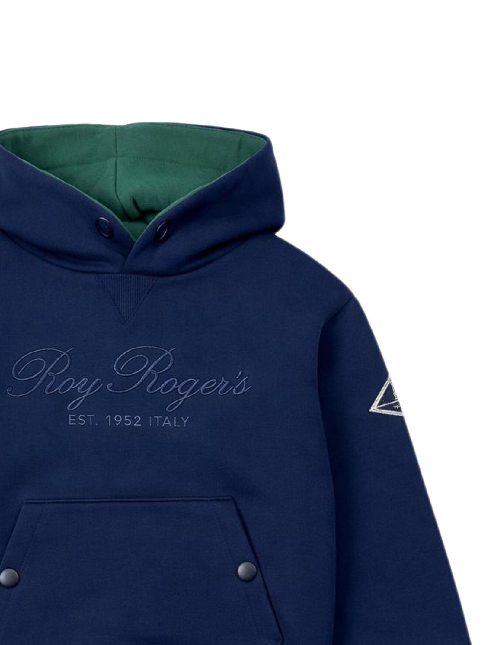 Roy Roger's Kids felpa di colore blu, dettagli a contrasto verde, modello con cappuccio, ricamo logo sul petto, due tasche con bottoni automatici, orli a costine, vestibilità regolare. Composizione: 100% cotone