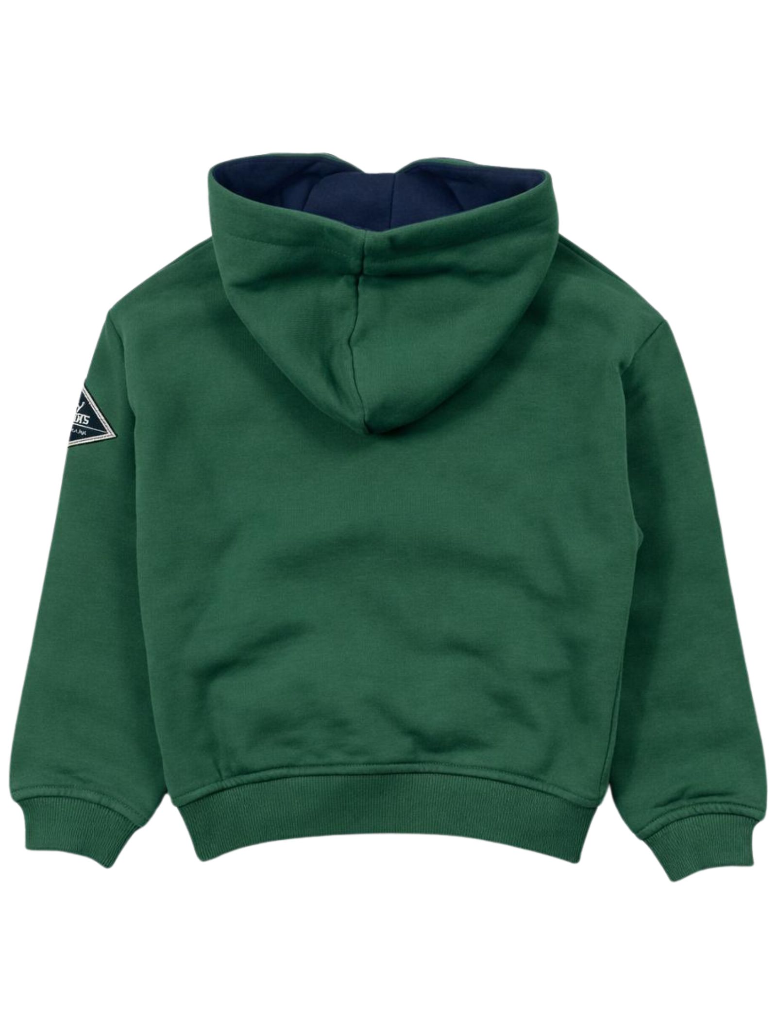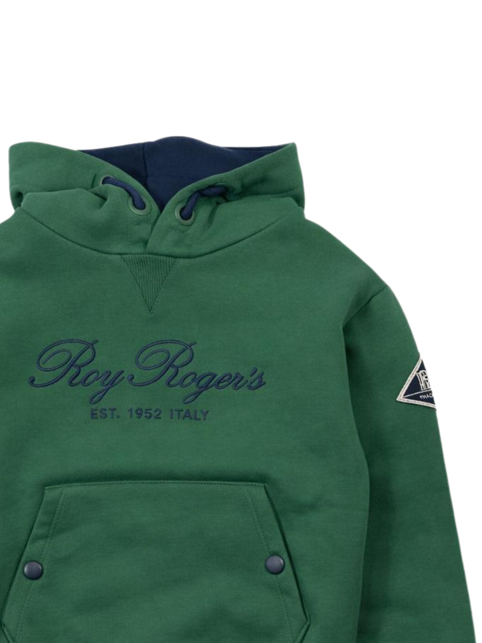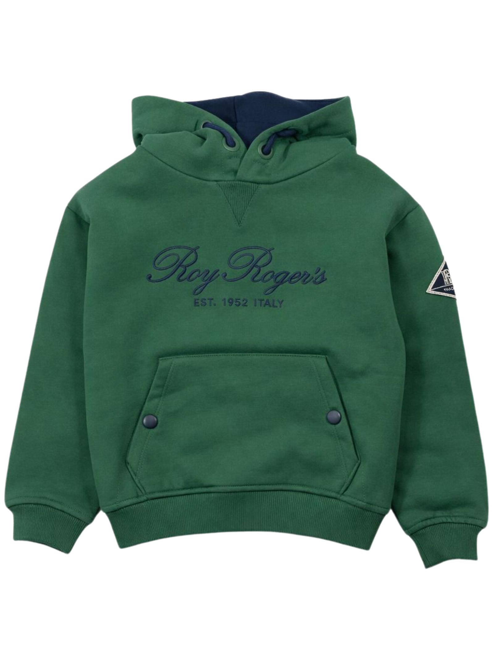 Roy Roger's Kids felpa di colore verde, dettagli a contrasto blu, modello con cappuccio, ricamo logo sul petto, due tasche con bottoni automatici, orli a costine, vestibilità regolare. Composizione: 100% cotone