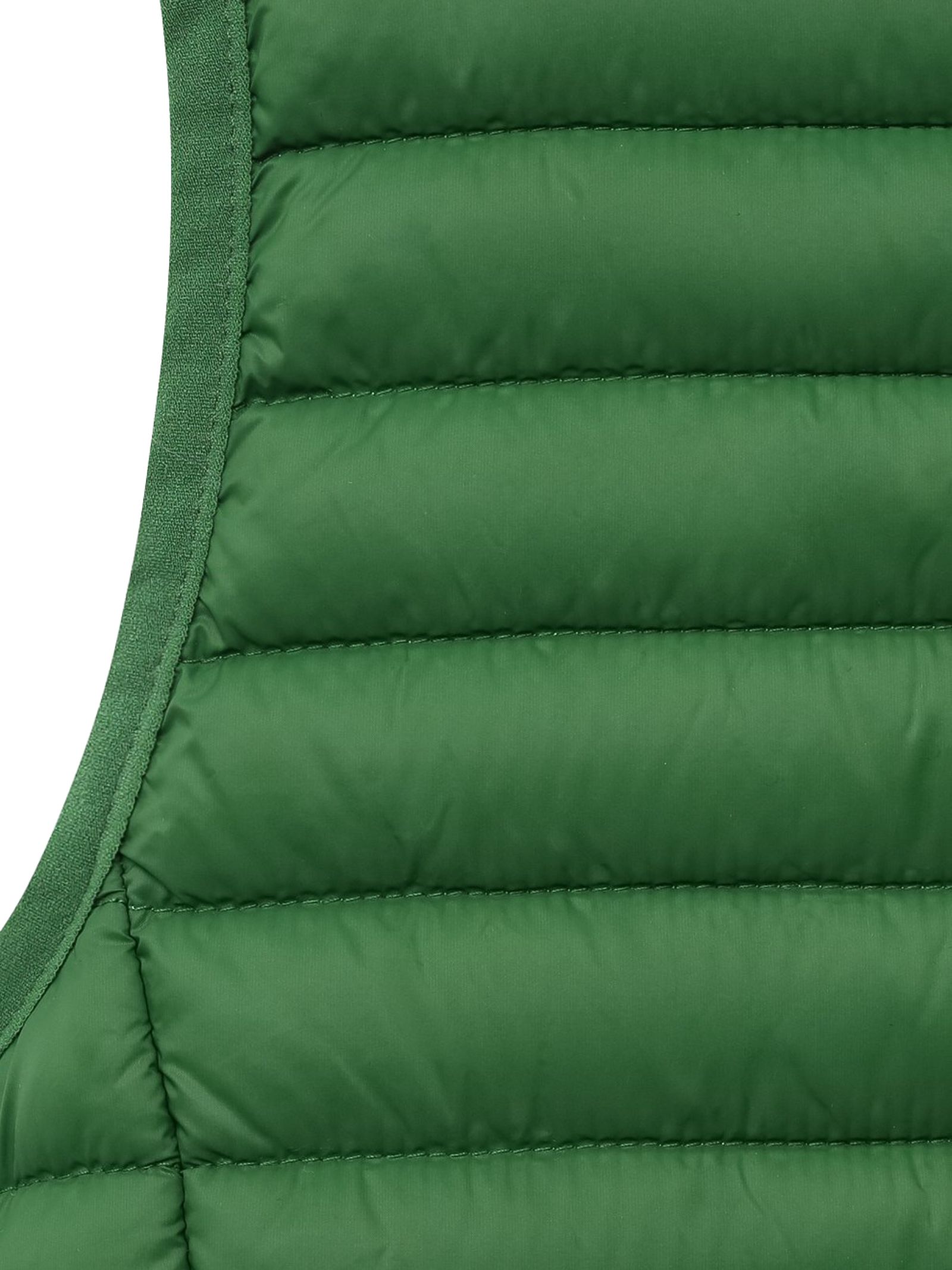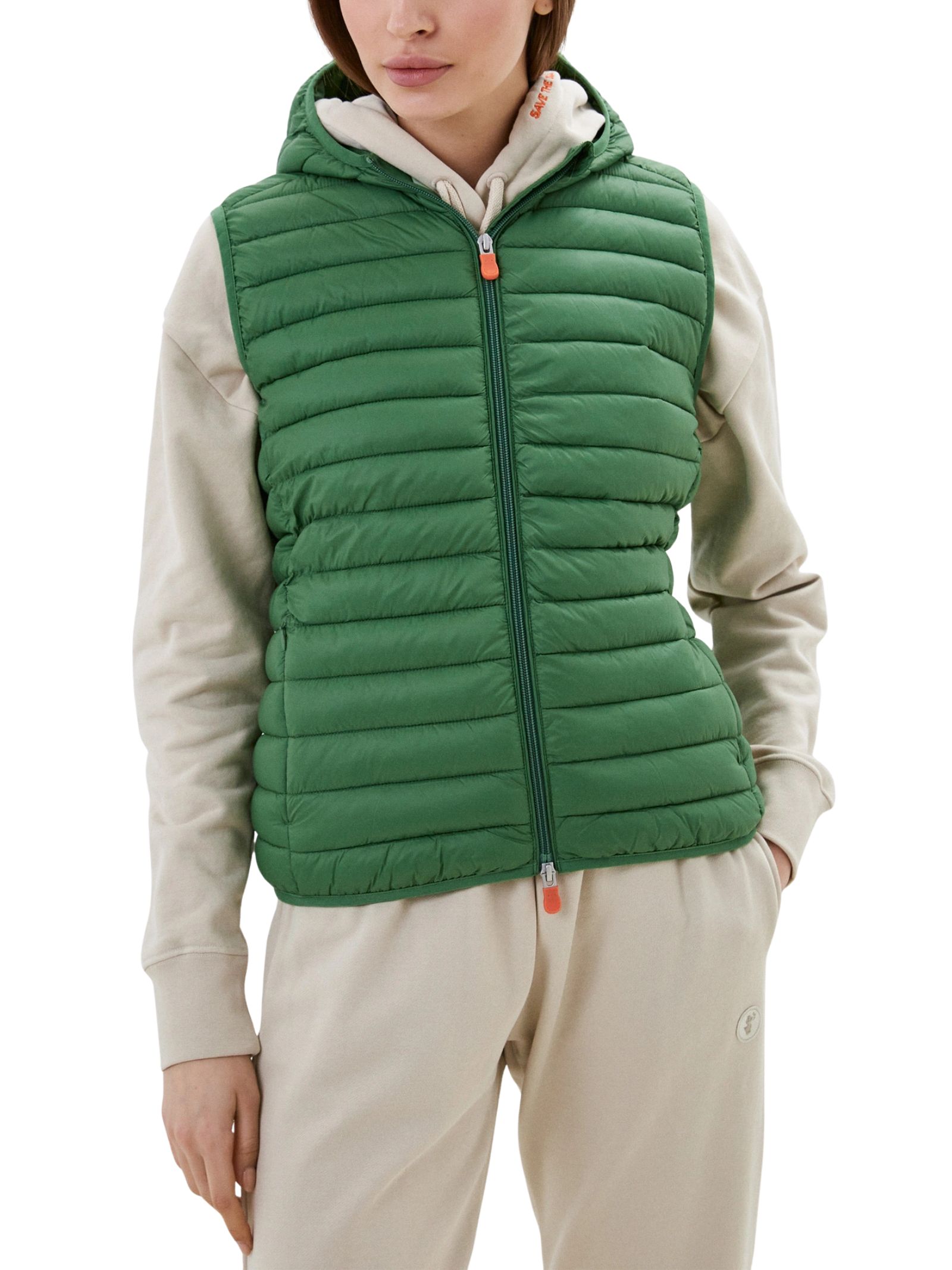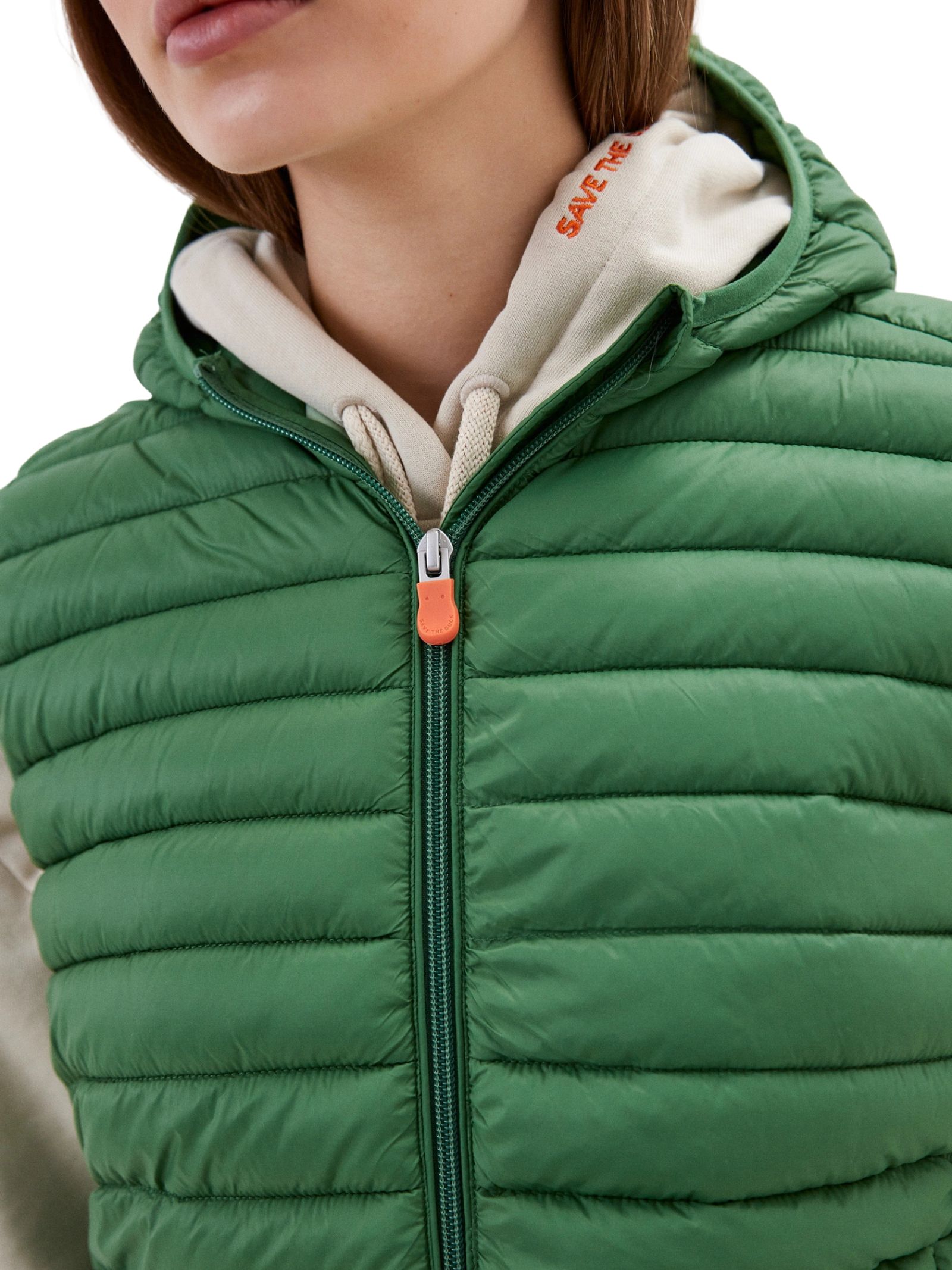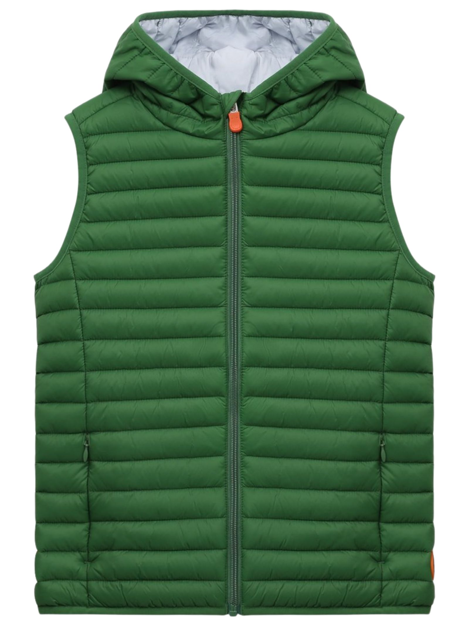 Save The Duck Kids smanicato di colore verde, modello trapuntato, zip centrale, cappuccio, tasche laterali con zip, applicazione logo in silicone, imbottito con Plumtech, un'ovatta termica sintetica realizzata nel rispetto dell'ambiente e degli animali; è traspirante e trattiene il calore. Composizione esterna: 100% nylon. Fodera: 100% nylon. Imbottitura: 100% poliestere. Made in Italy