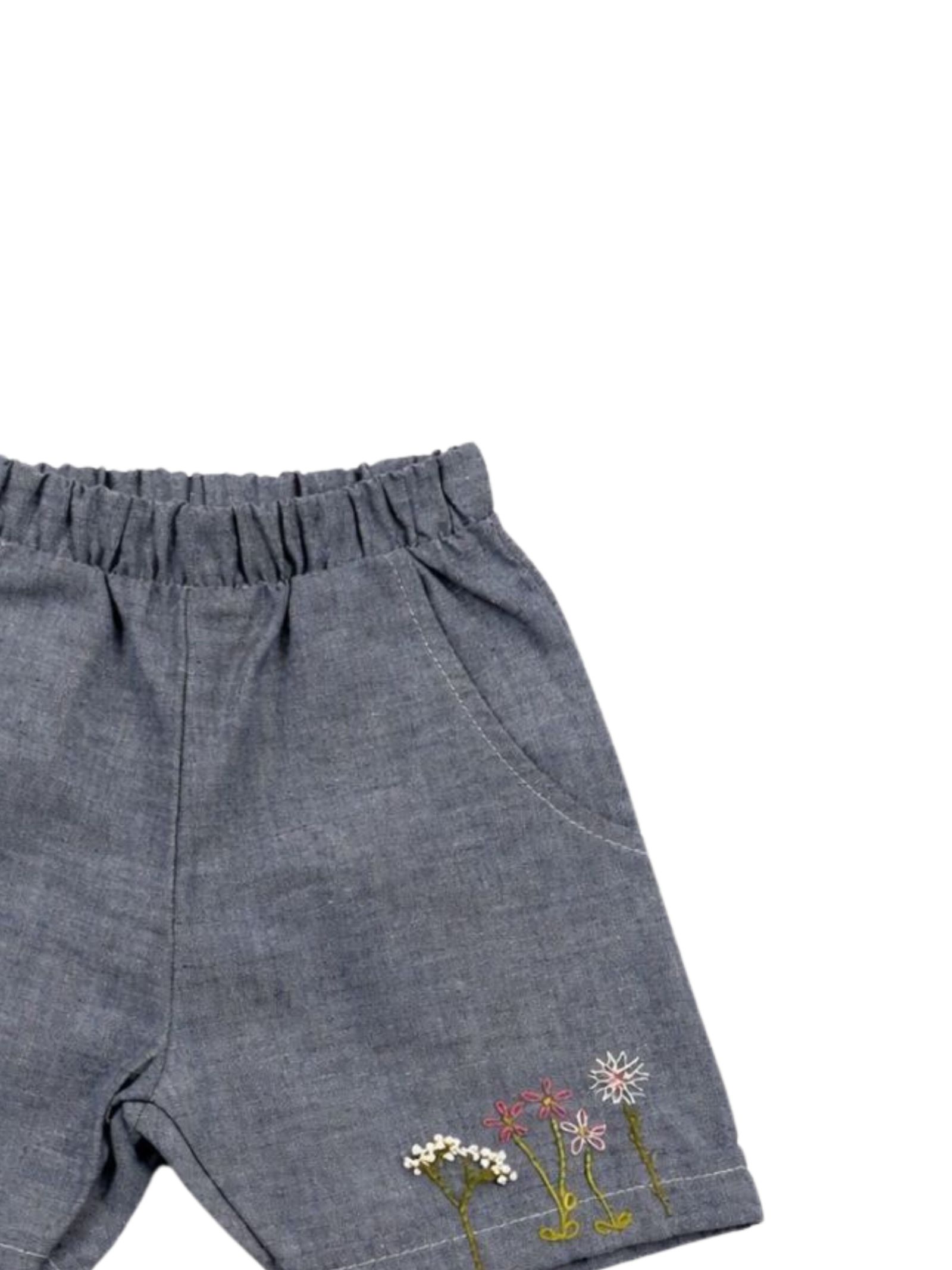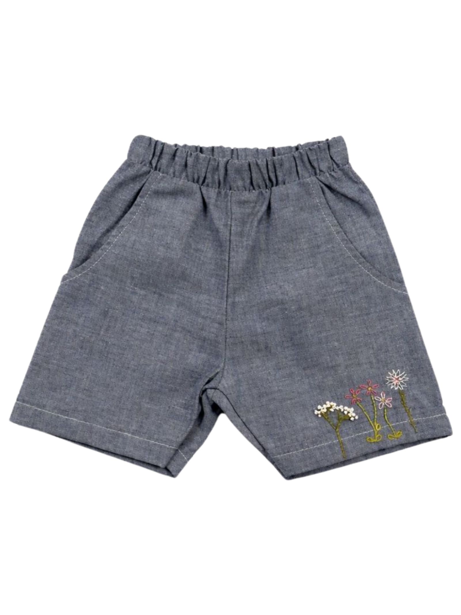 Skikkerli Kids shorts in cotone denim leggero, design con elastico in vita, due tasche laterali, ricamo fiori a contrasto multicolor, vestibilità gamba ampia. Composizione: 100% cotone. Made in Italy