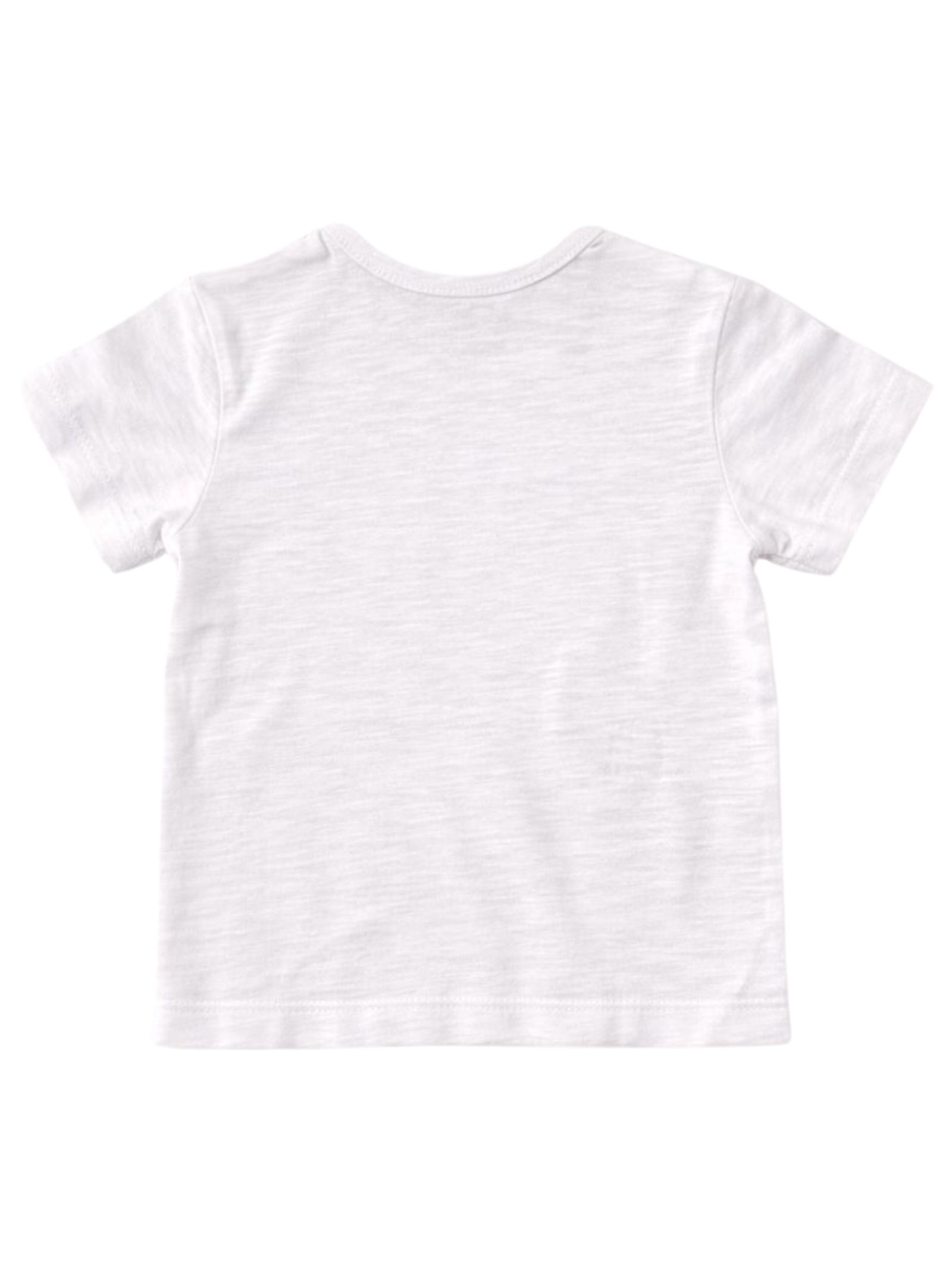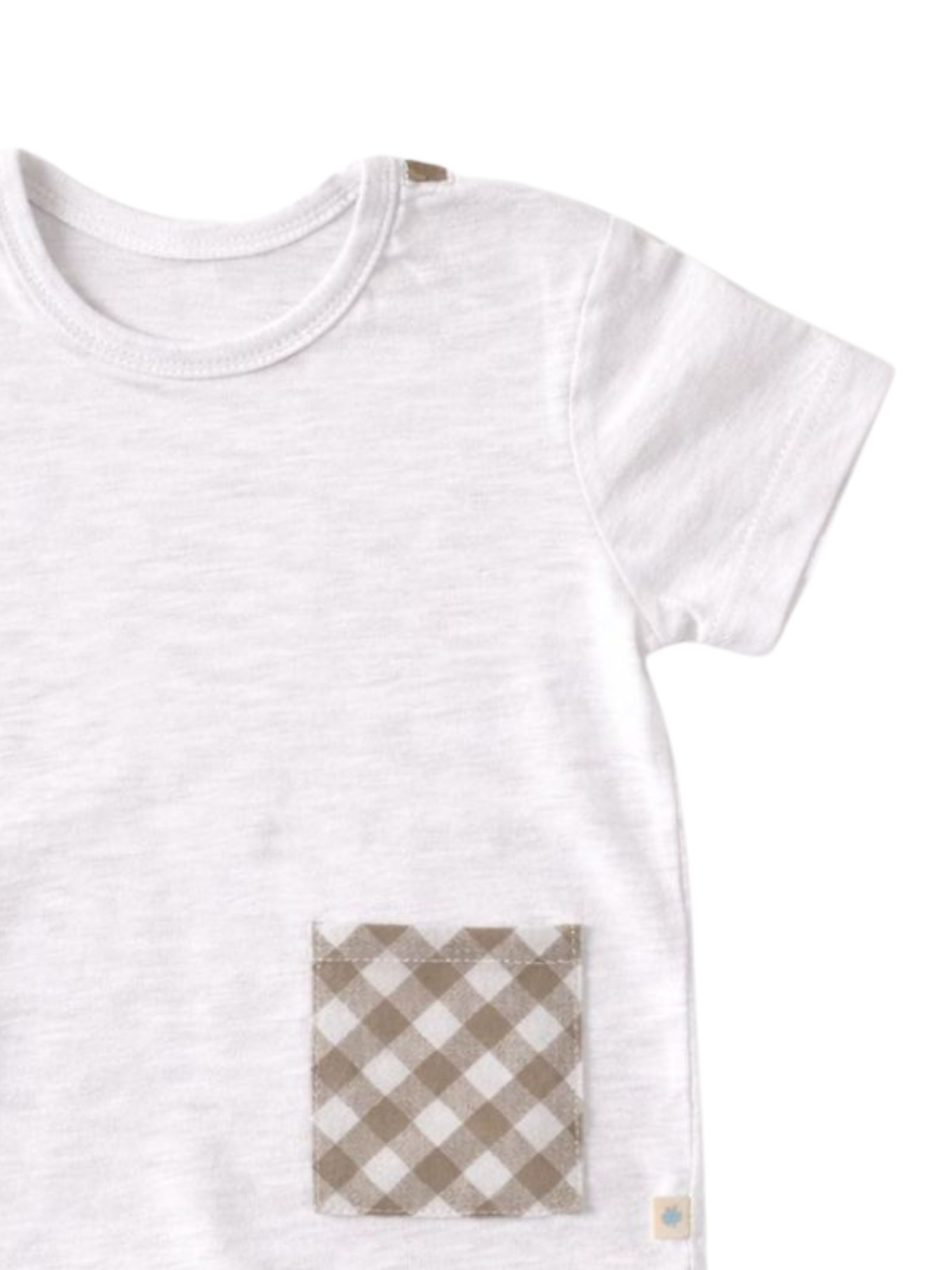 Skikkerli Kids t-shirt di colore bianco, tasca a contrasto beige, modello girocollo, mezze maniche, apertura con bottoni sulla spalla, patch con logo laterale, orlo dritto, vestibilità regolare. Composizione: 70% cotone 30% lino. Made in Italy