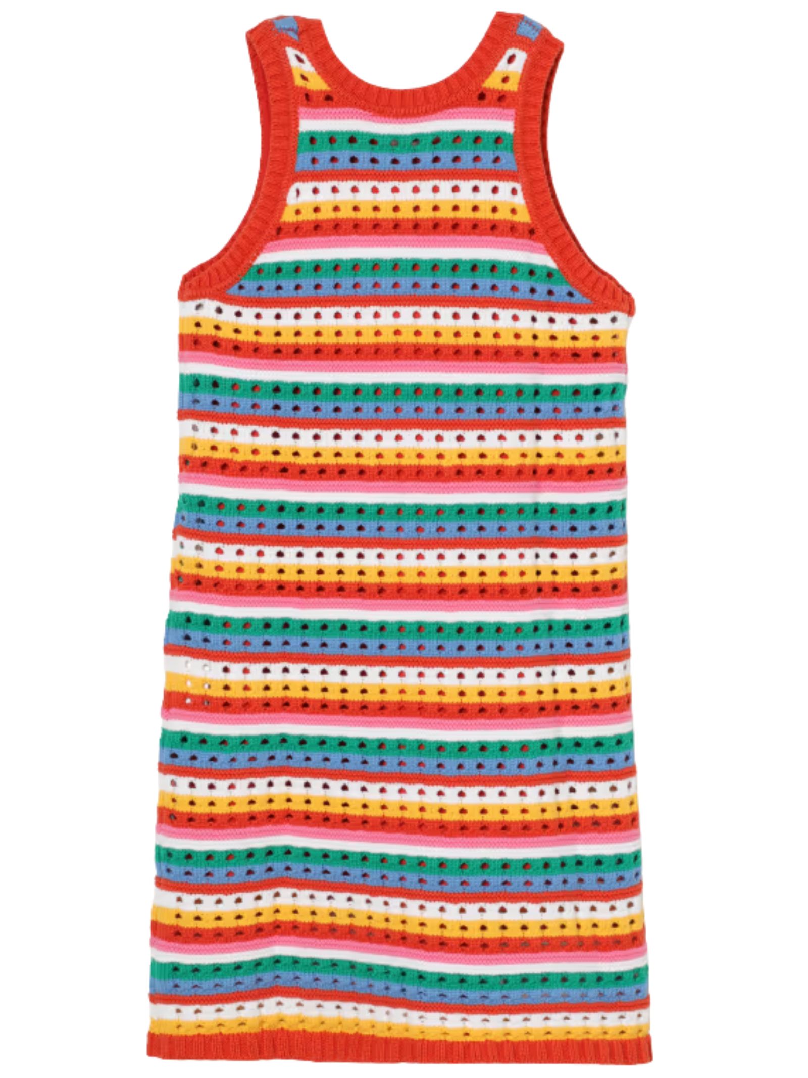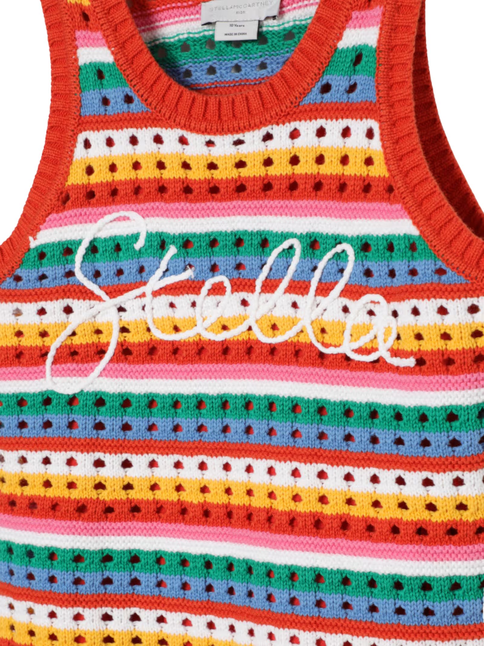 Stella McCartney Kids abito realizzato a maglia traforata in fantasia a righe multicolor, design smanicato, girocollo, finiture a costine, realizzato in cotone organico certificato GOTS, decorato con logo ricamato sulla parte anteriore. Composizione: 100%cotone Organico. Fodera: 100% cotone