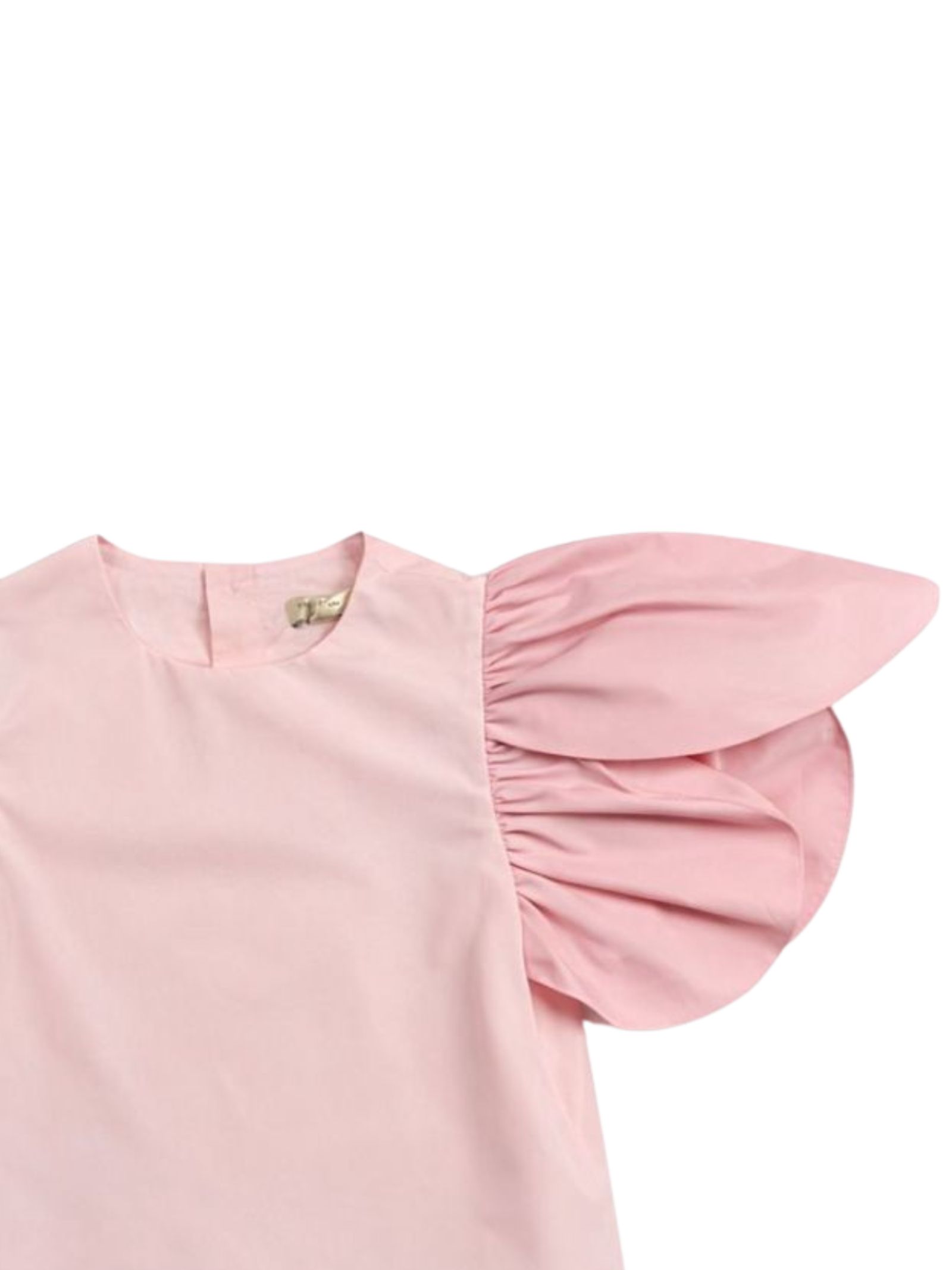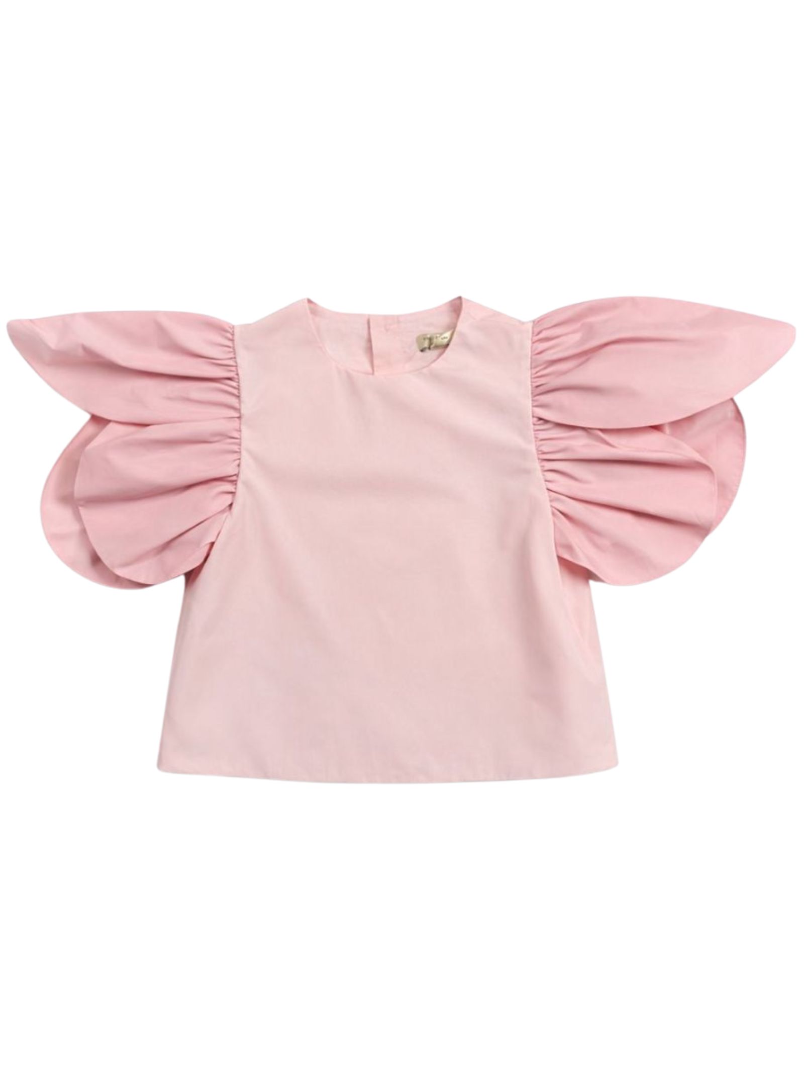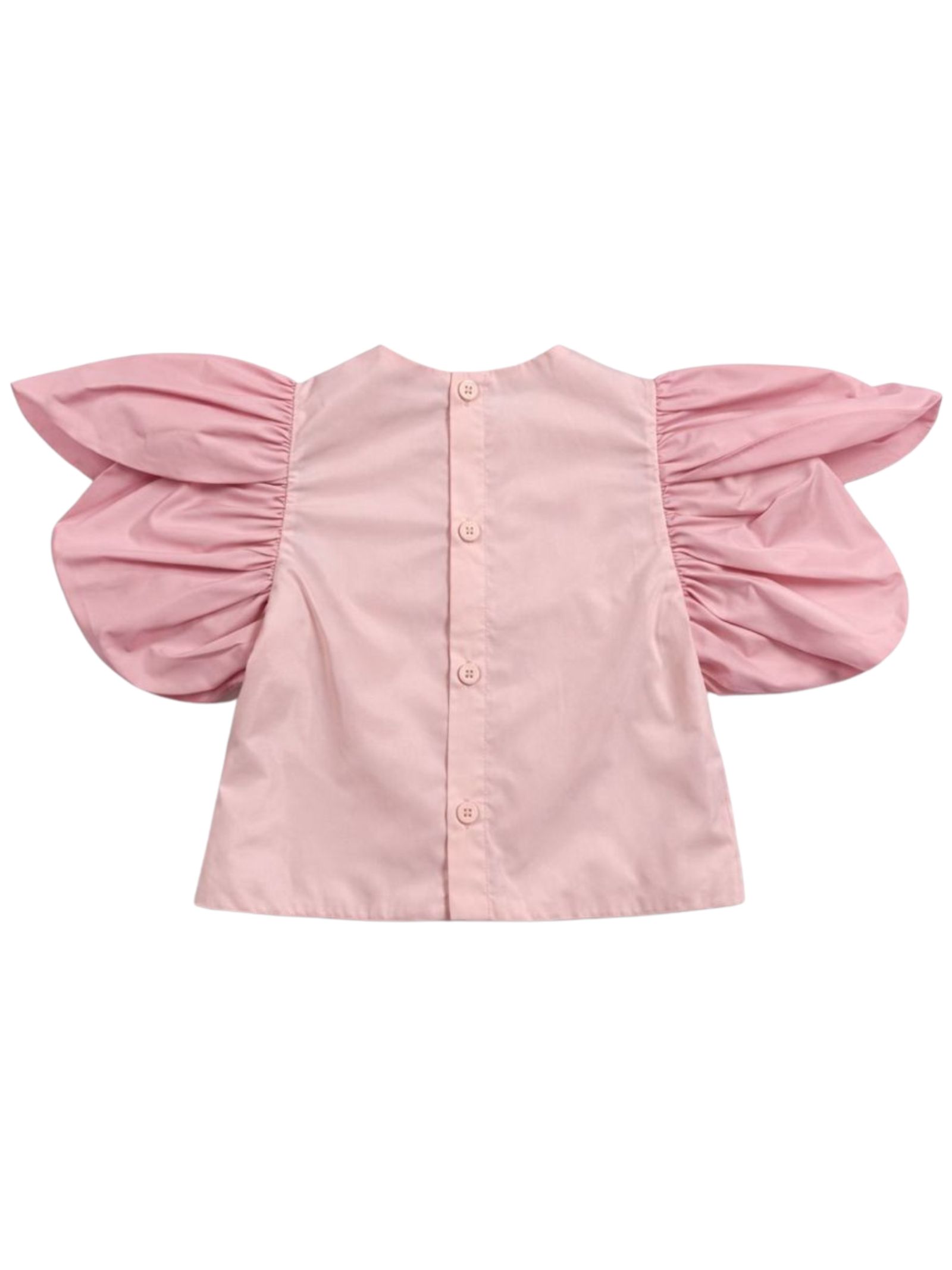 Stella McCartney Kids blusa di colore rosa, modello girocollo, mezza manica con volant, design corto, apertura sul retro. Composizione: 100% poliestere. Fodera: 100% viscosa