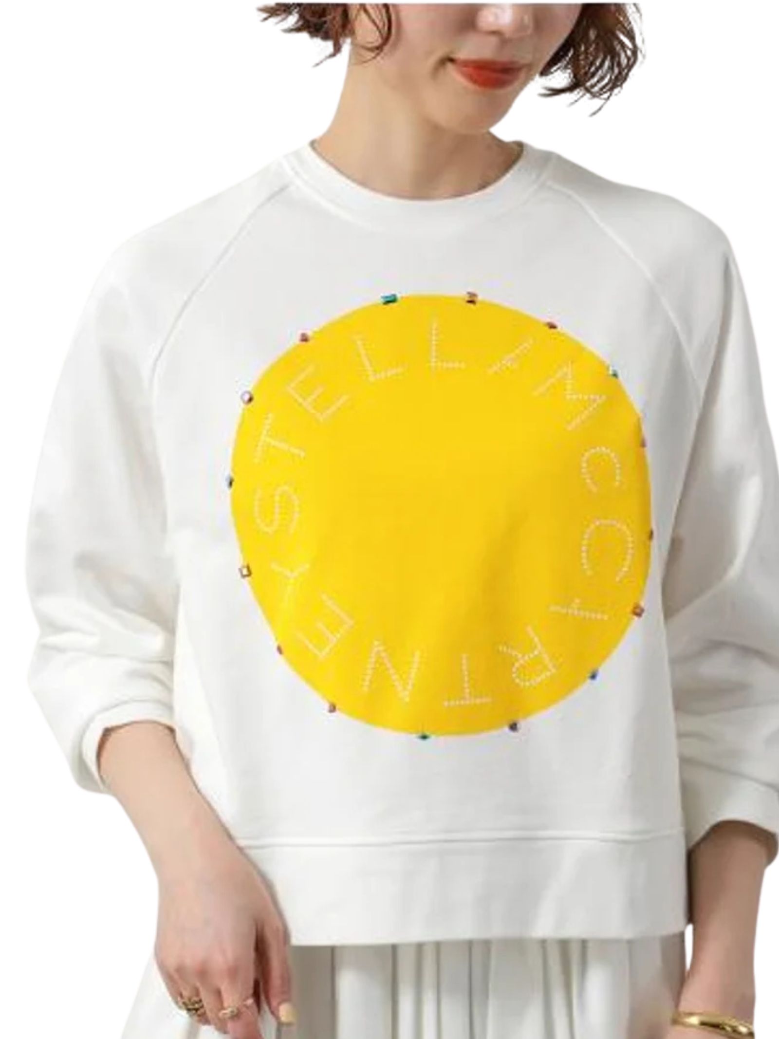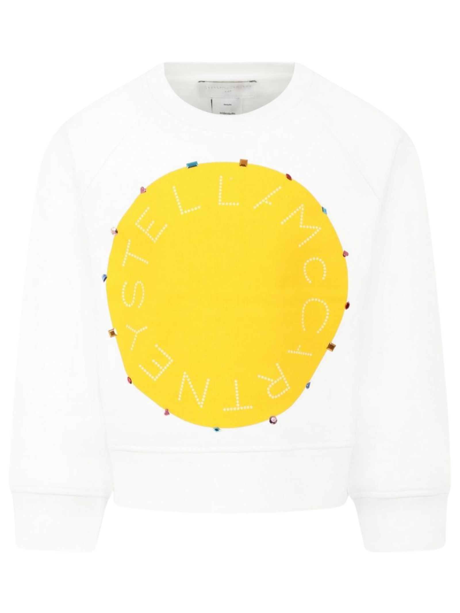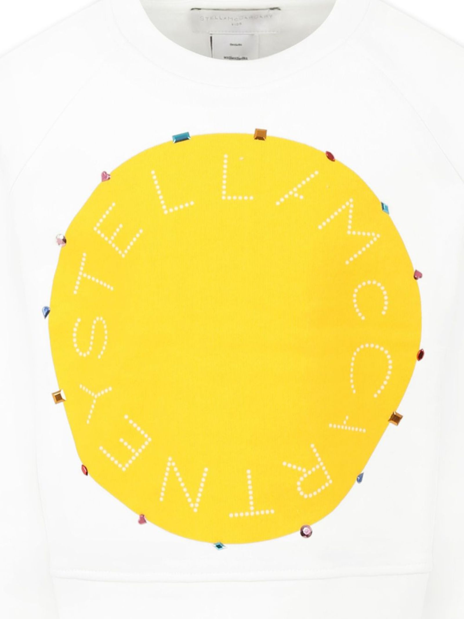 Stella McCartney Kids felpa di colore bianco, modello girocollo, manica lunga, stampa centrale a contrasto giallo con appliczione strass multicolor, vestibilità regolare. Composizione: 100% cotone