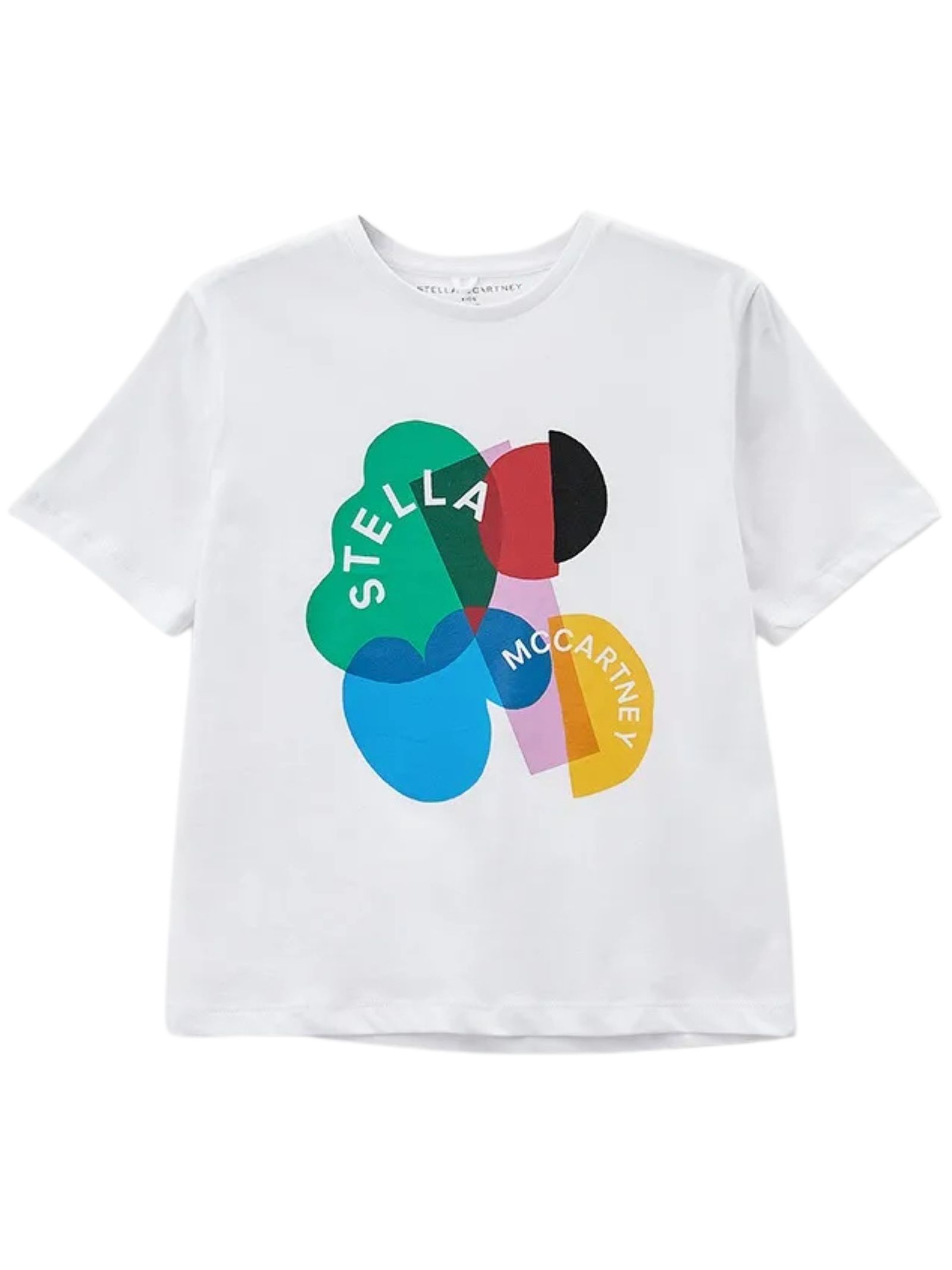 Stella McCartney Kids t-shirt di colore bianco, modello girocollo, mezza manica, stampa centrale a contrasto multicolor con logo, vestibilità regolare. Composizione: 100% cotone