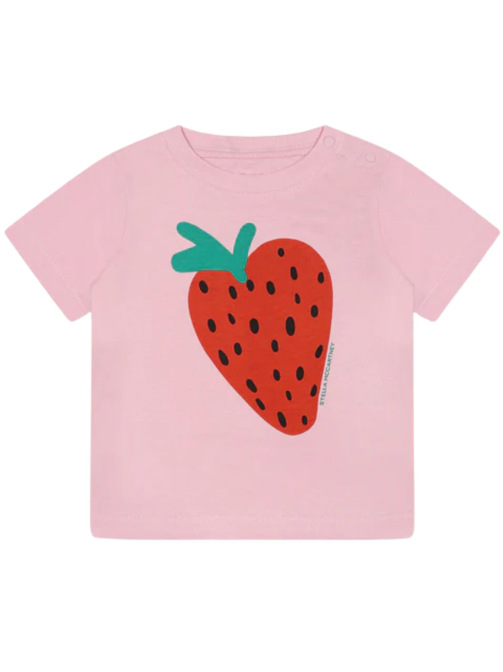 Stella McCartney Kids t-shirt di colore rosa, modello girocollo, mezza manica, stampa centrale a contrasto con logo, apertura con bottoni a clip sulla spalla, vestibilità regolare. Composizione: 100% cotone