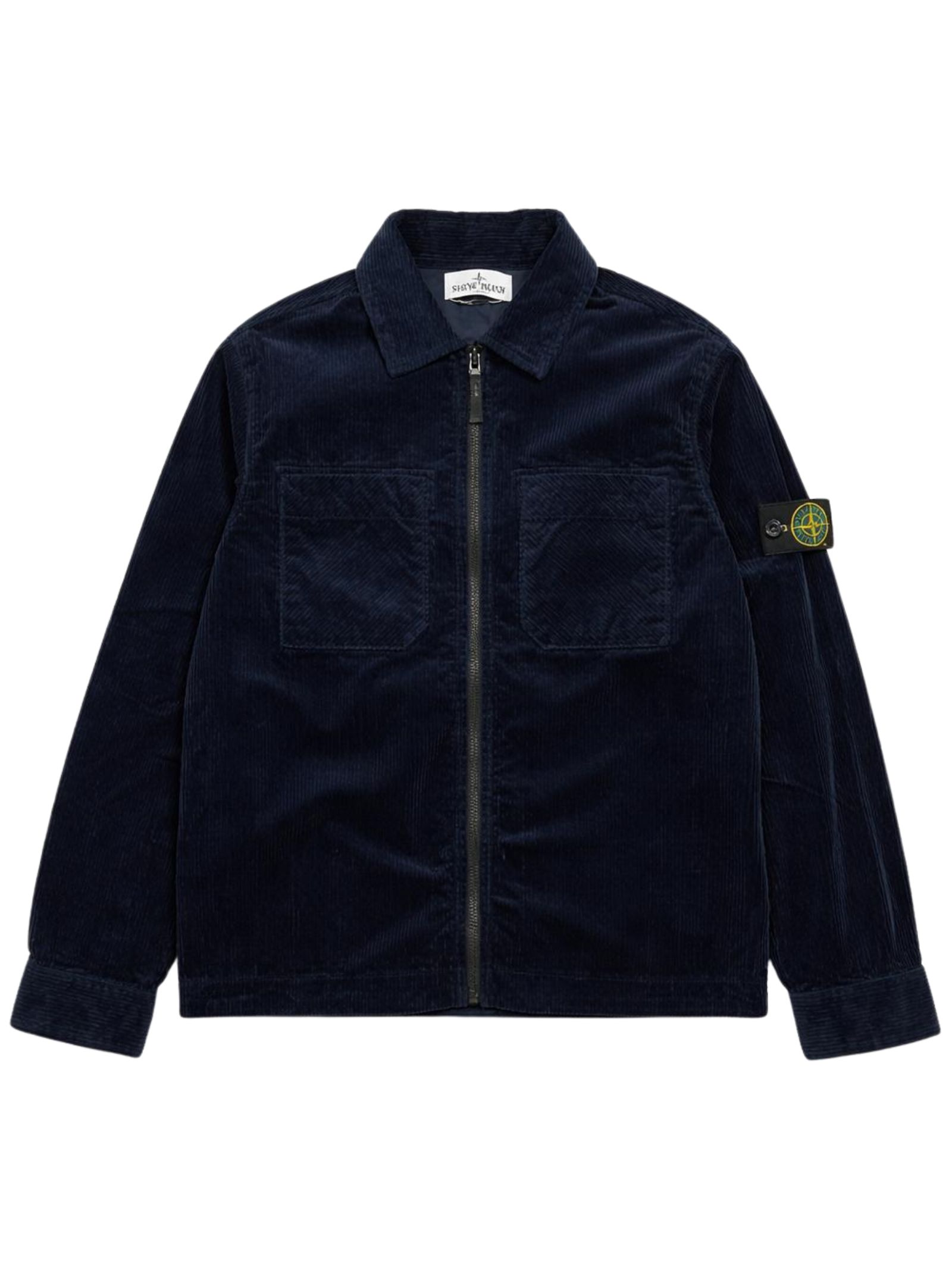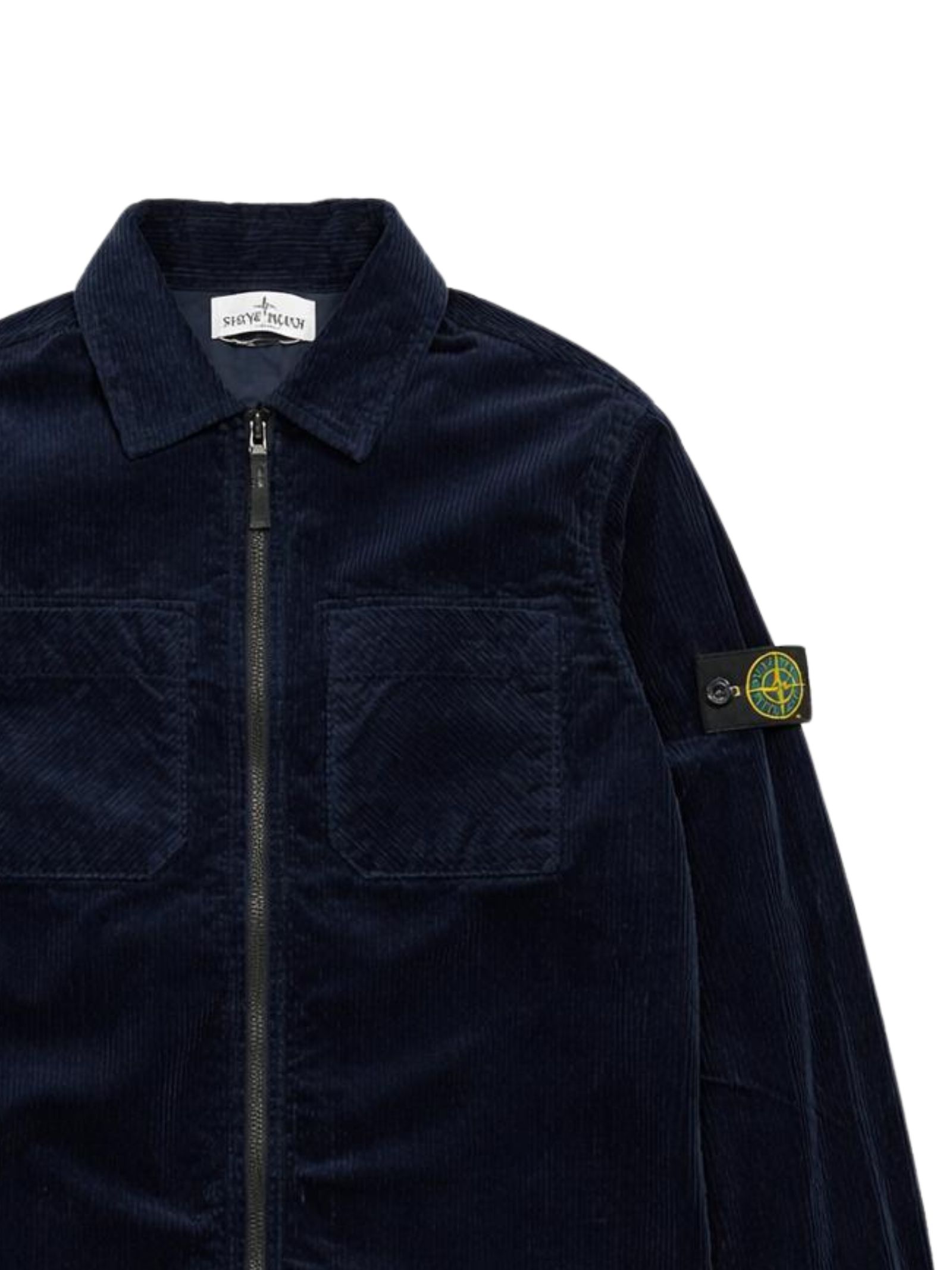 Stone Island Kids camicia di colore blu, realizzato in tessuto vellutato a costine, modello con colletto classico, due tasche sul petto, zip centrale, applicazione logo sul braccio, vestibiltà regolare. Composizione: 75% cotone 24% lyocell 1% elastan
