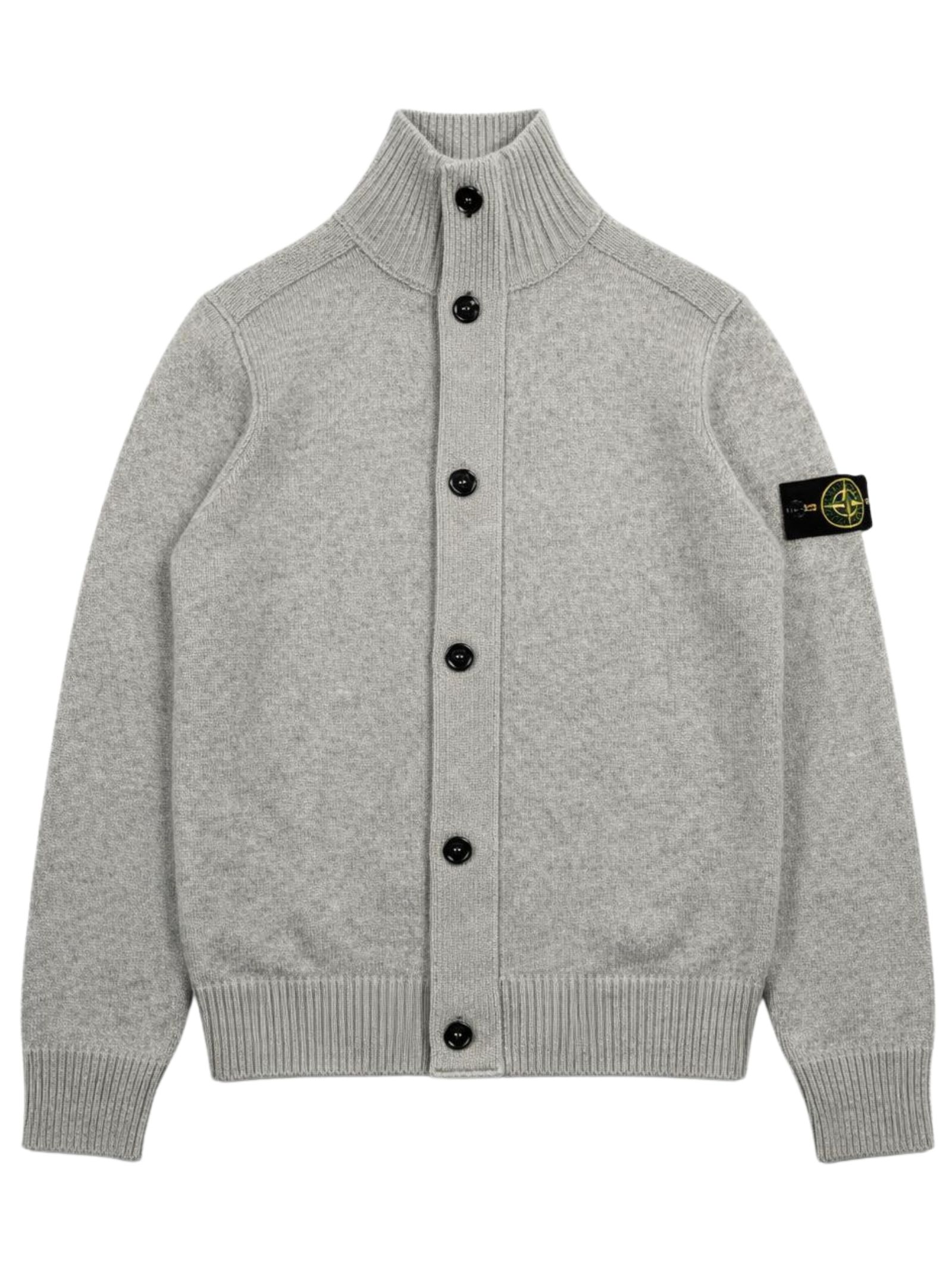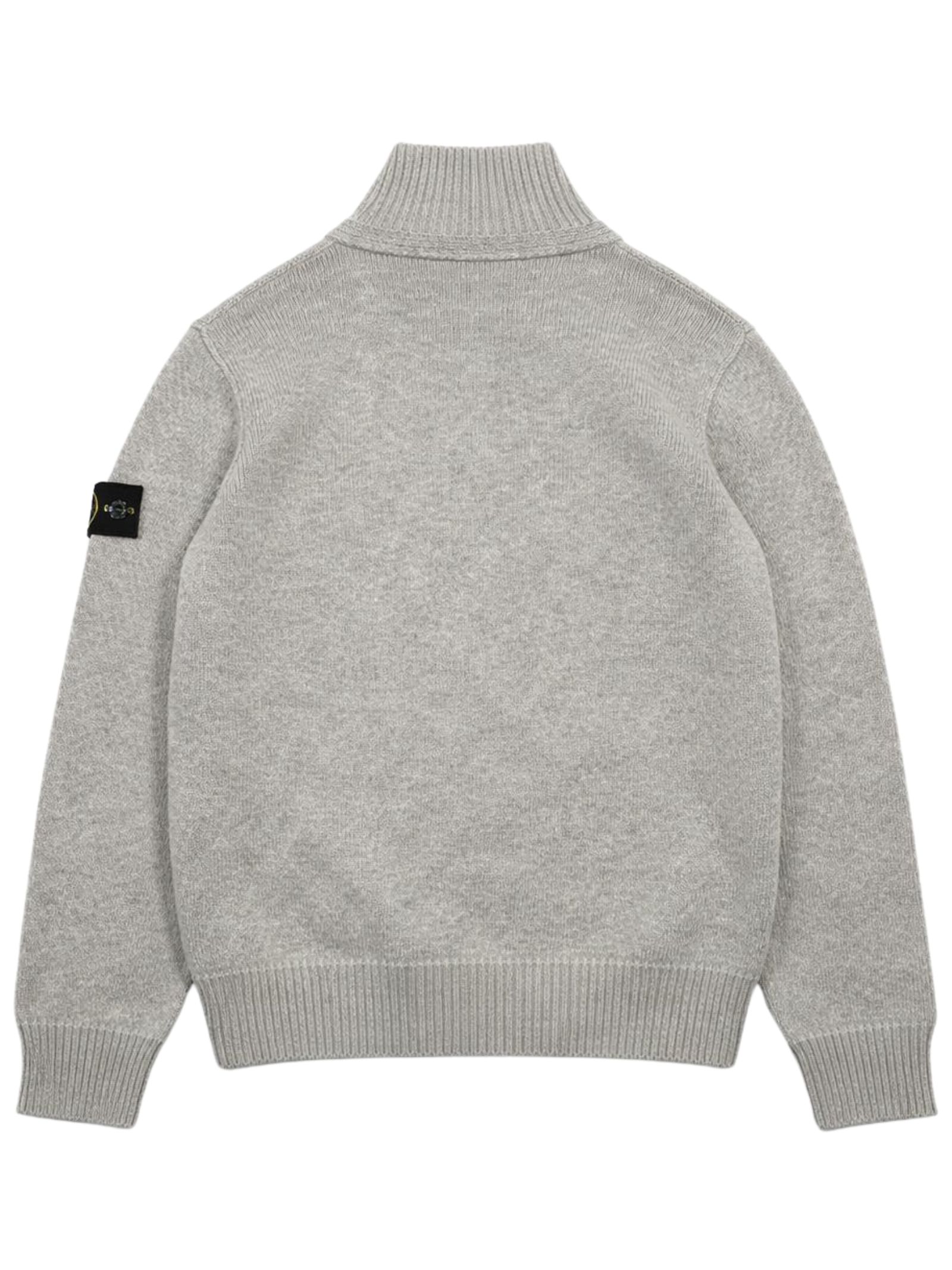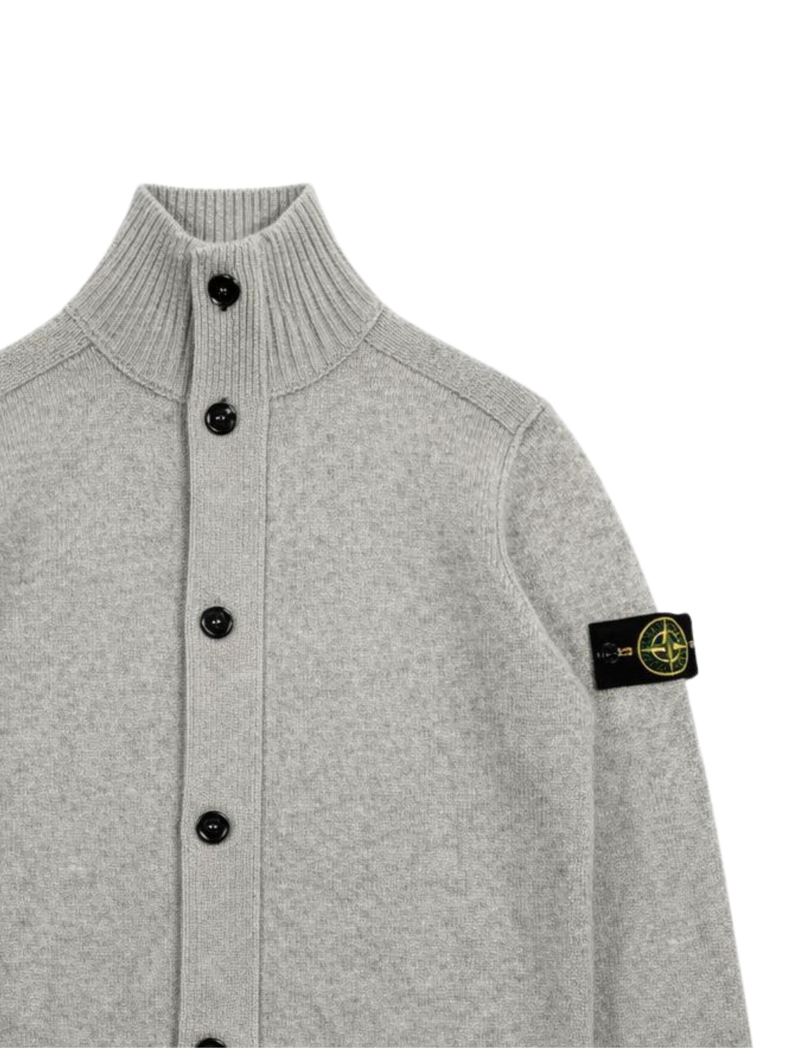 STONE ISLAND Junior cardigan di colore grigio, modello con colletto rialzato, maniche lunghe, applicazione logo sul braccio, orli a coste, vestibiltà regolare. Composizione: 40% lana 30% viscosa 20% nylon 10% cashmere