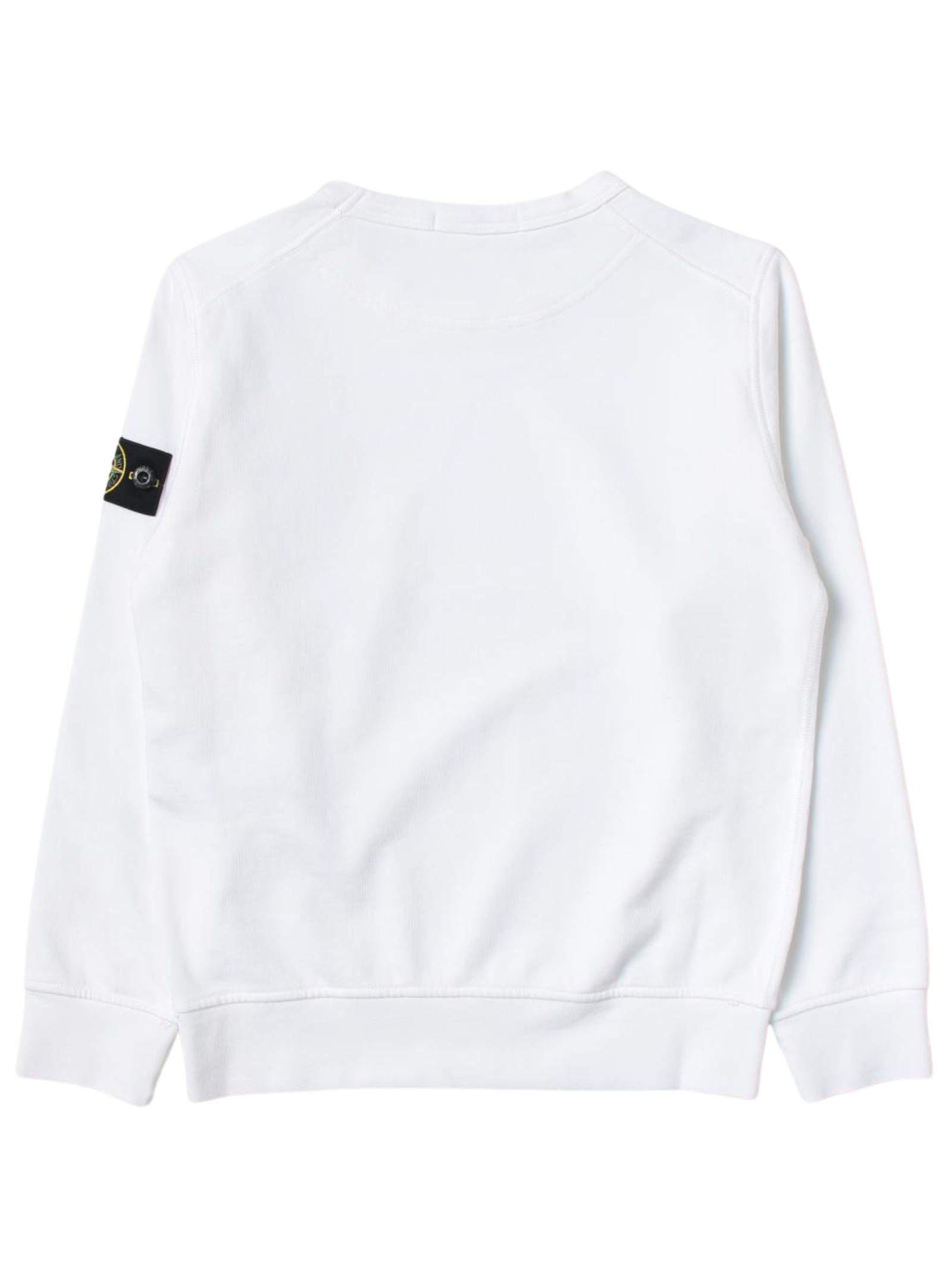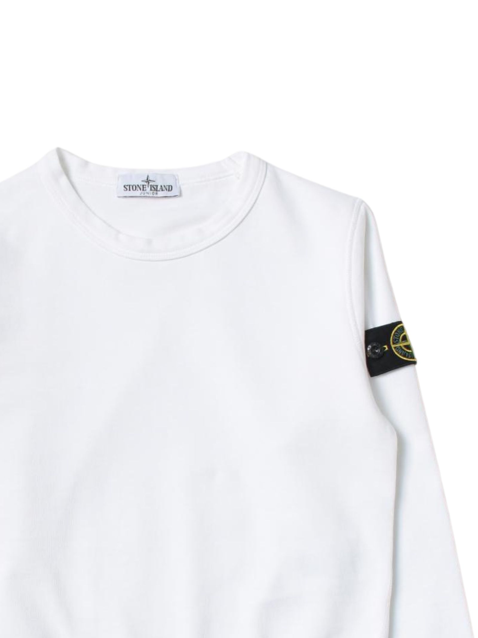 Felpa STONE ISLAND Junior di colore bianco, applicazione sulla manica con logo, girocollo, maniche lunghe, orli a costine, vestibilità regolare. Composizione: Cotone 100%