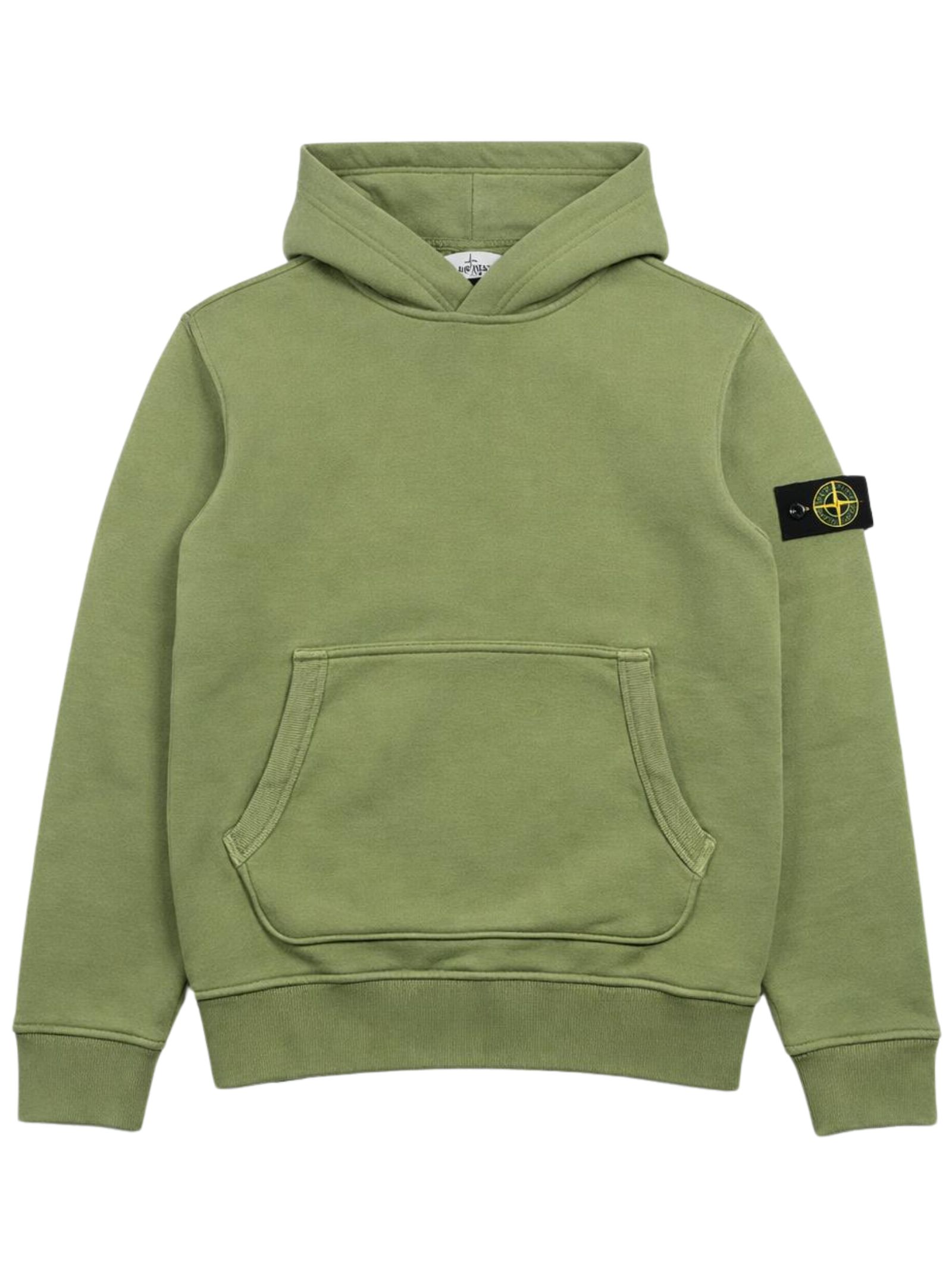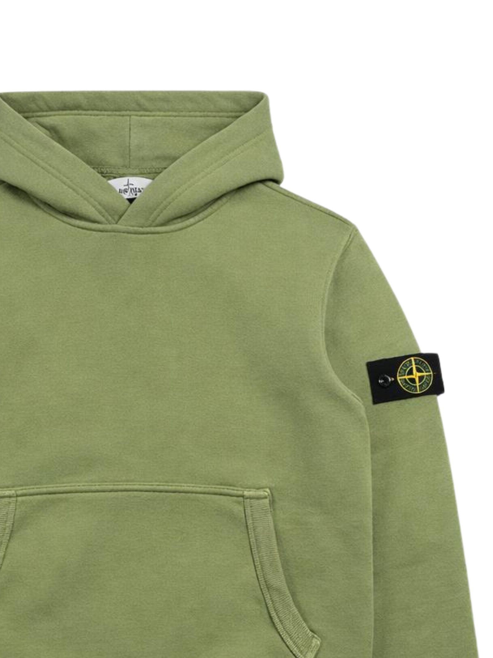 STONE ISLAND Junior felpa di colore verde, applicazione sulla manica con logo, cappuccio, maniche lunghe, orlo dritto, due tasche a marsupio, orli a costine. Composizione: Cotone 100%. Made in Italy