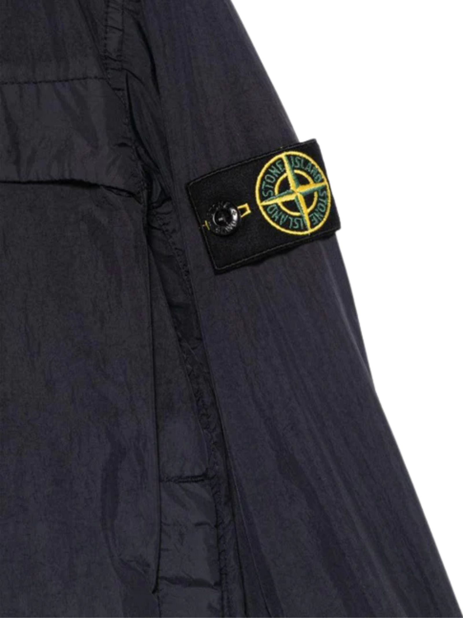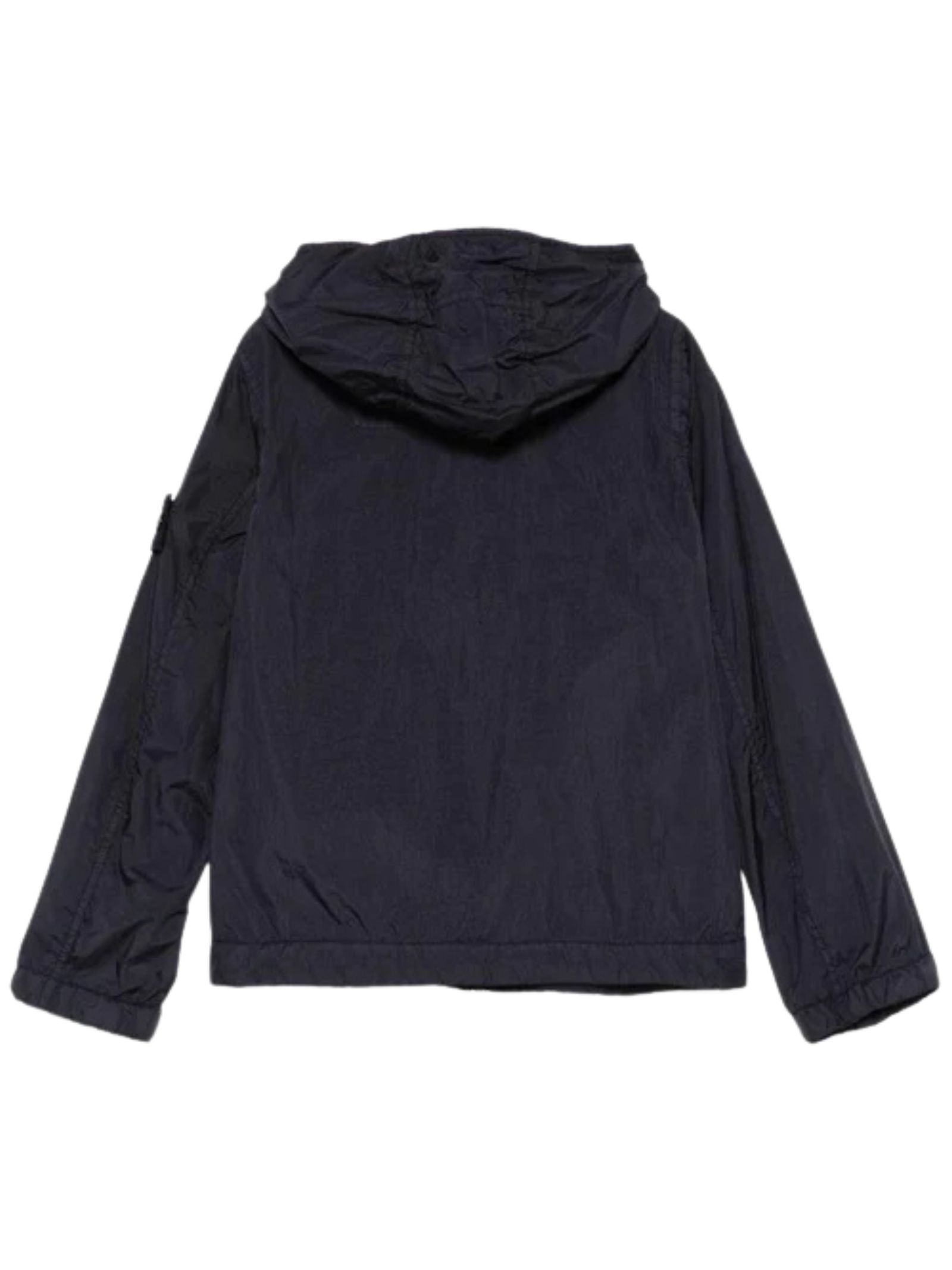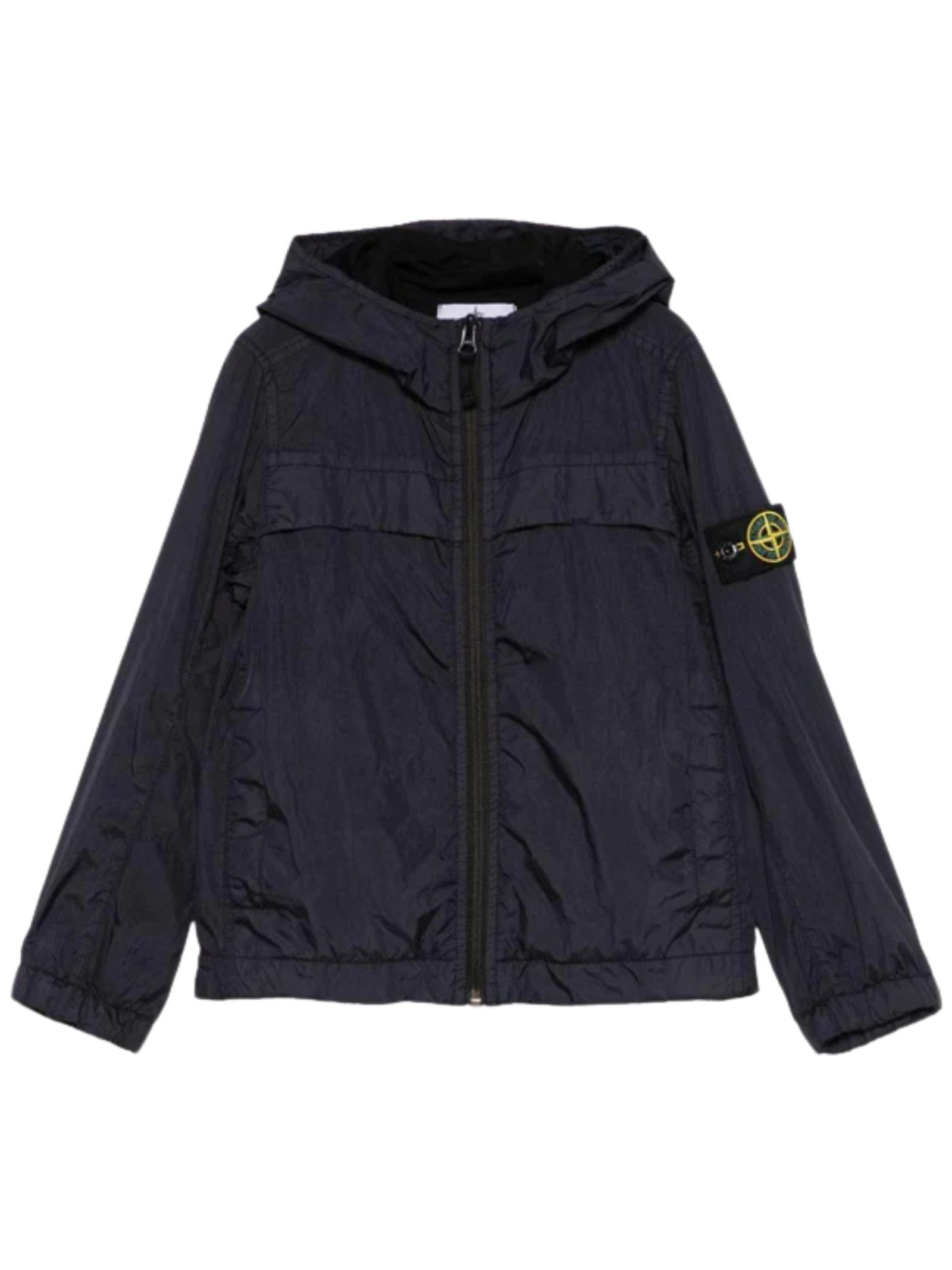Stone Island Kids giubbino antivento di colore blu, modello con chiusura centrale con zip, cappuccio, due tasche laterali con bottoni automatici, applicazione sulla manica con logo, polsini elastici. Composizione: poliammide 100%