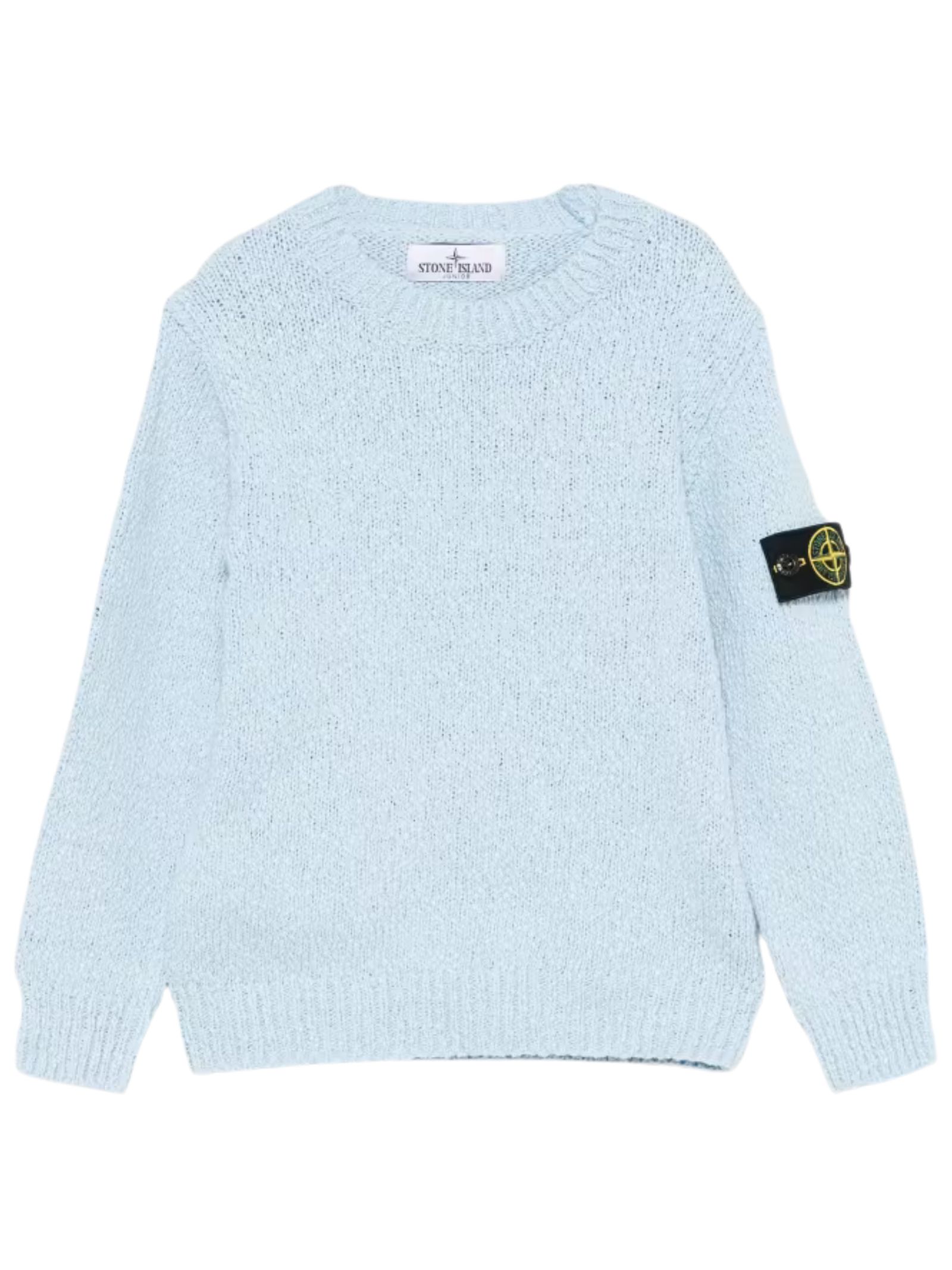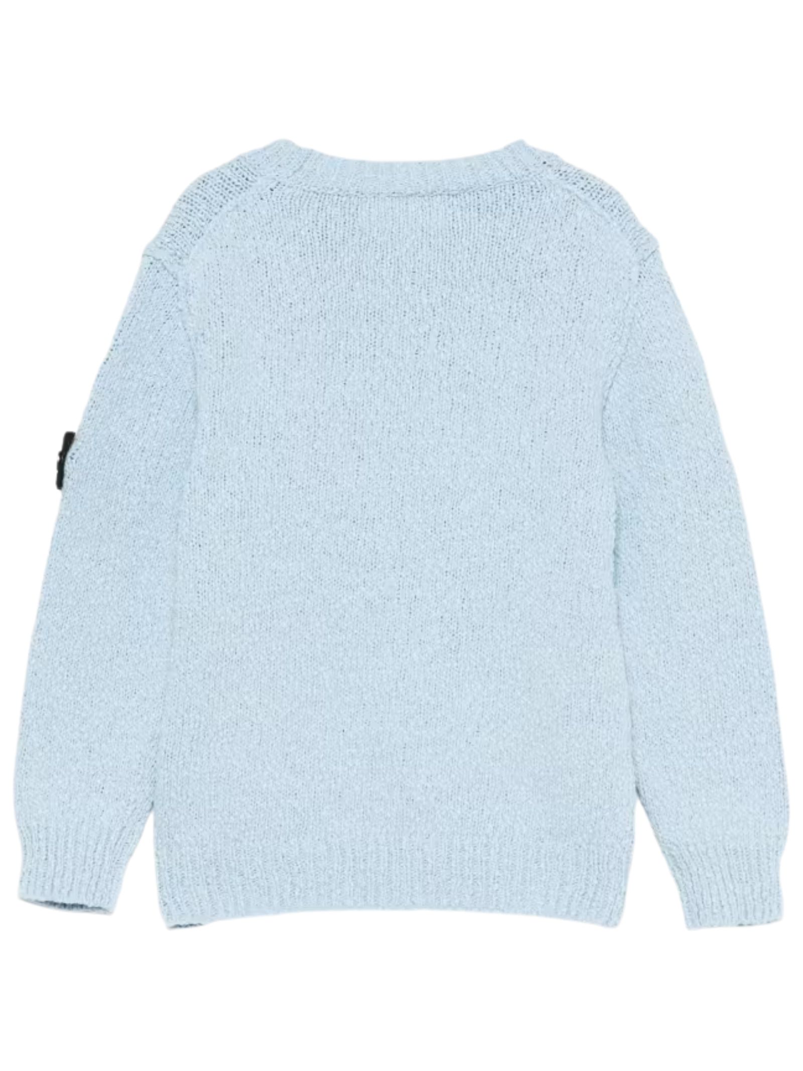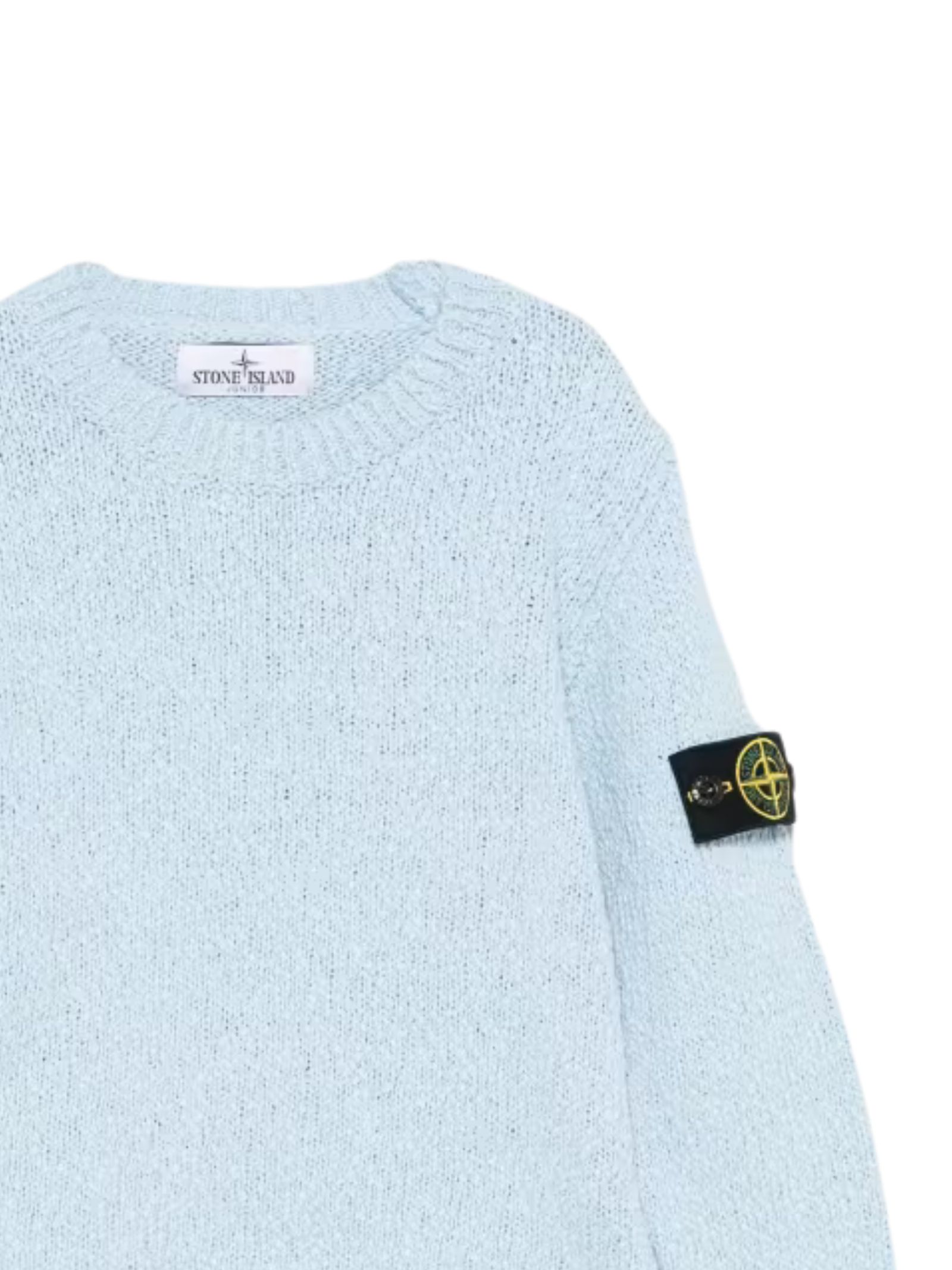 STONE ISLAND Junior maglione di colore azzurro, maglia intrecciata, modello girocollo, maniche lunghe, applicazione logo sul braccio, orli a coste, vestibiltà regolare. Composizione: cotone 100%. Made in Italy