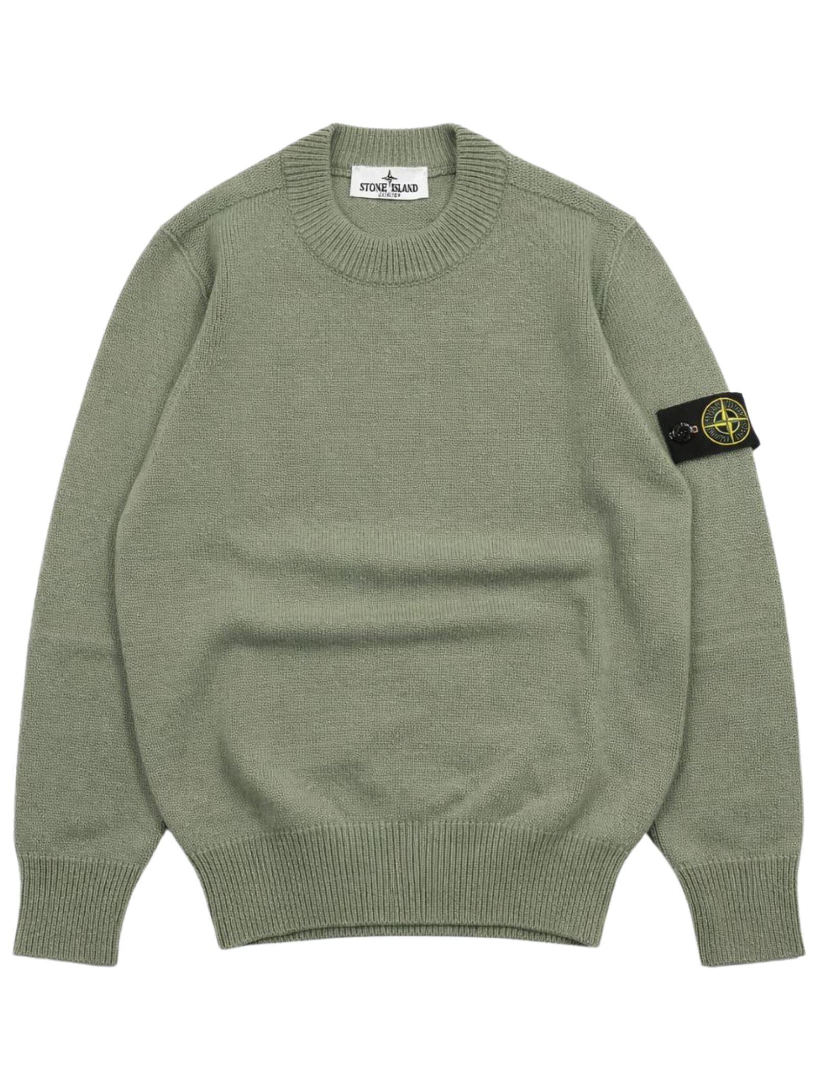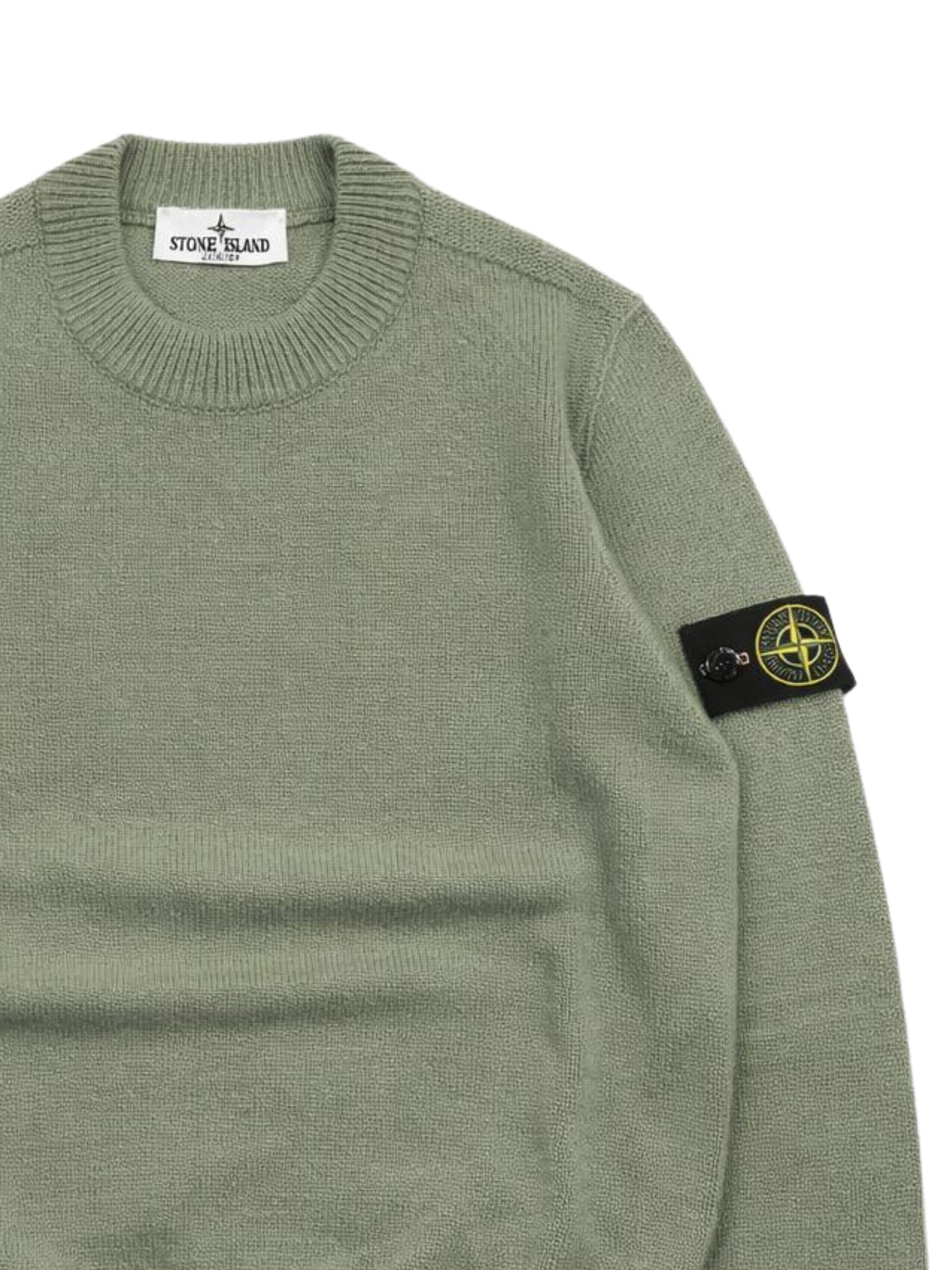 STONE ISLAND Junior maglione di colore verde, modello girocollo, maniche lunghe, applicazione logo sul braccio, orli a coste, vestibiltà regolare. Composizione: 40% lana 30% viscosa 20% nylon 10% cashmere