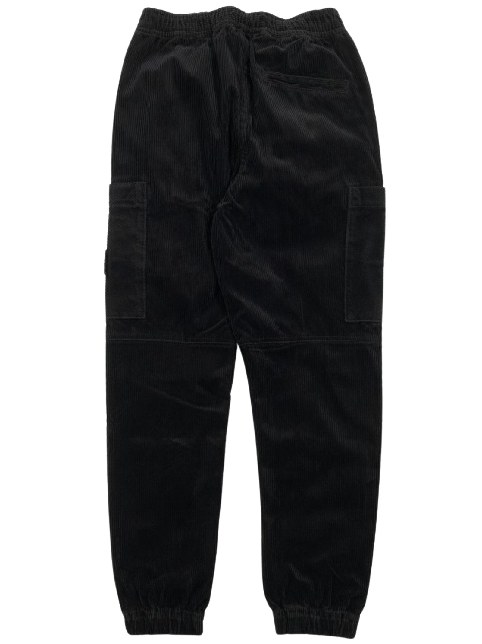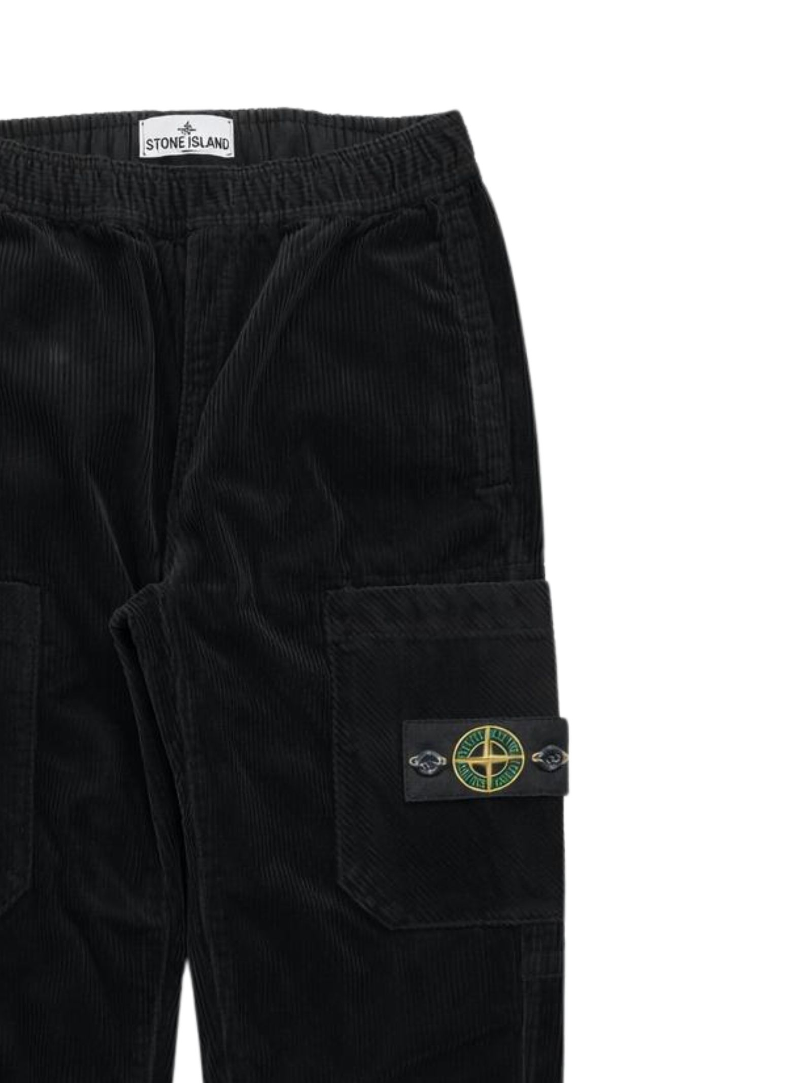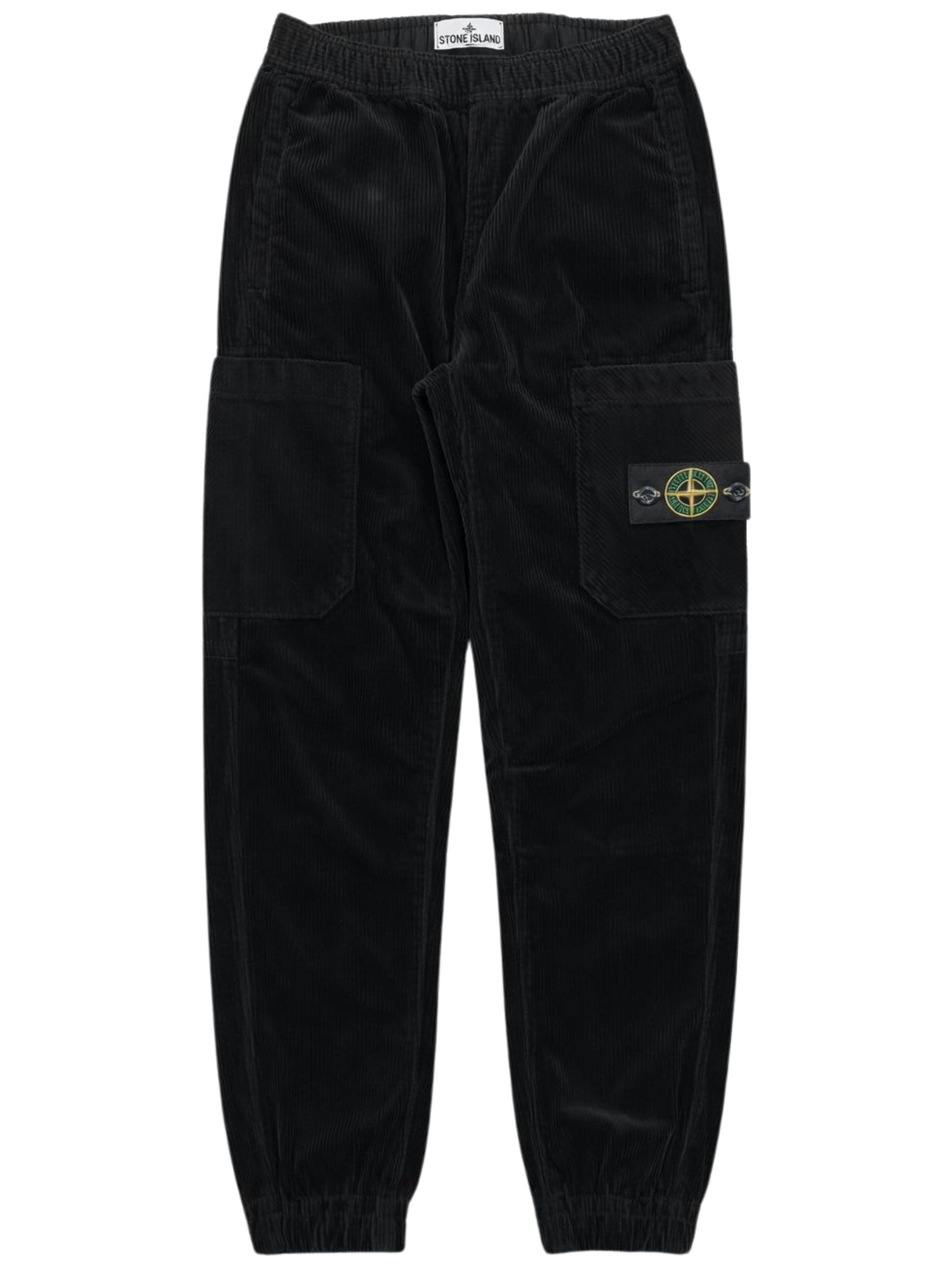 Stone Island Kids pantalone di colore nero, realizzato in tessuto vellutato a costine, modello con elastico in vita e coulisse interna, due tasche laterali, due tasconi applicati, caviglie elastiche, vestibilità regolare. Composizione: 75% cotone 24% lyocell 1% elastan. Made in Italy