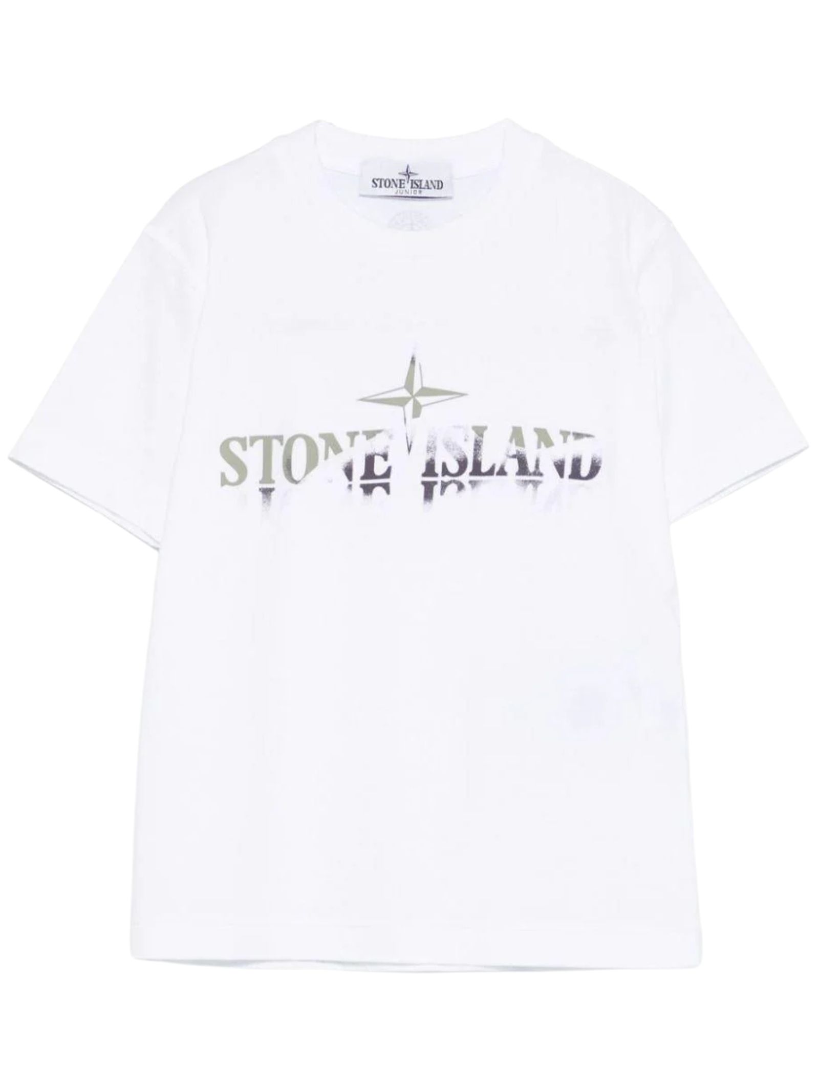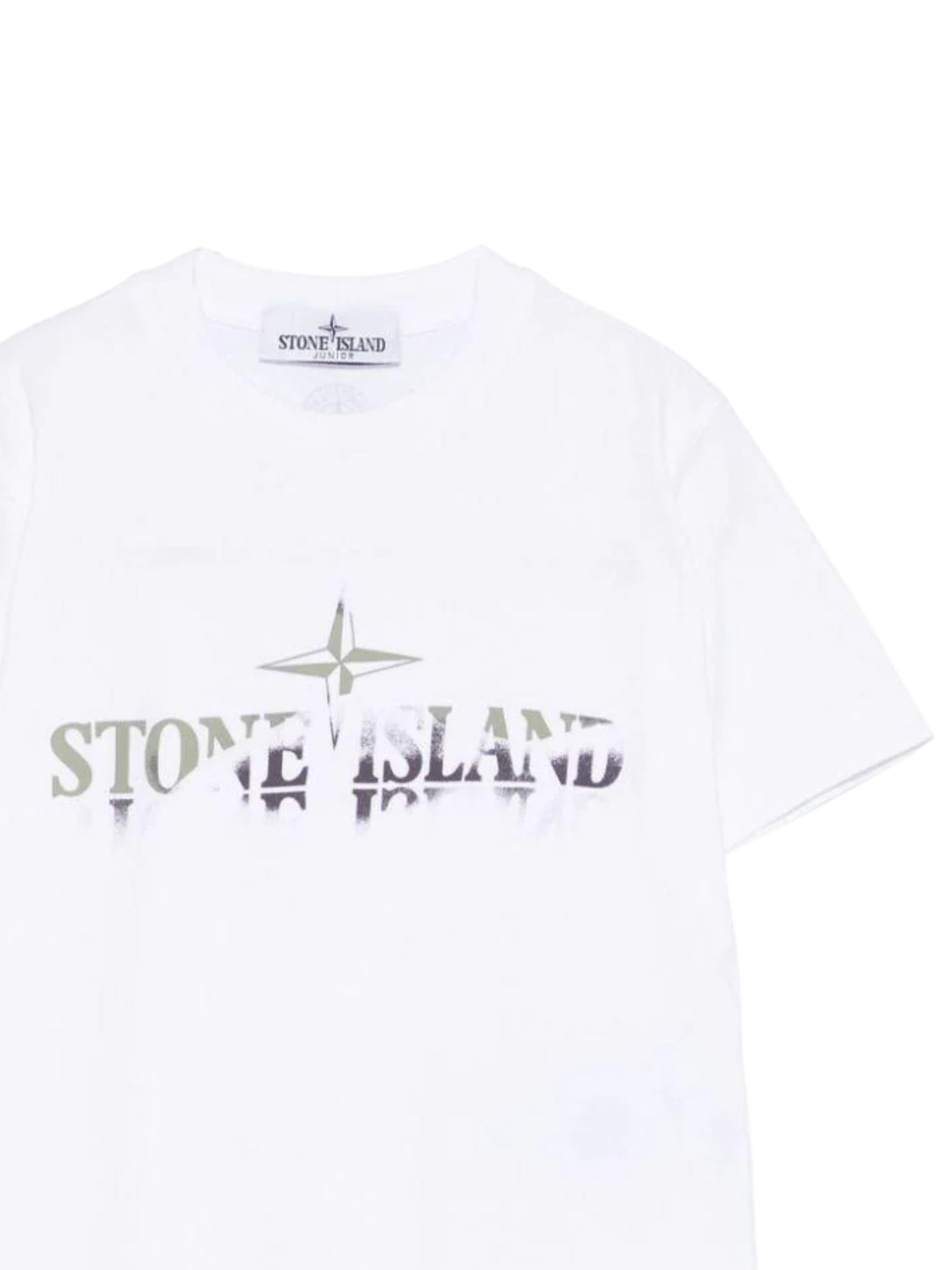 Stone Island Kids t-shirt di colore bianco, modello girocollo, mezza manica, caratterizzata da stampa logo posteriore e stampa anteriore a contrasto, orlo dritto, vestibilità regolare. Composizione: 100% cotone