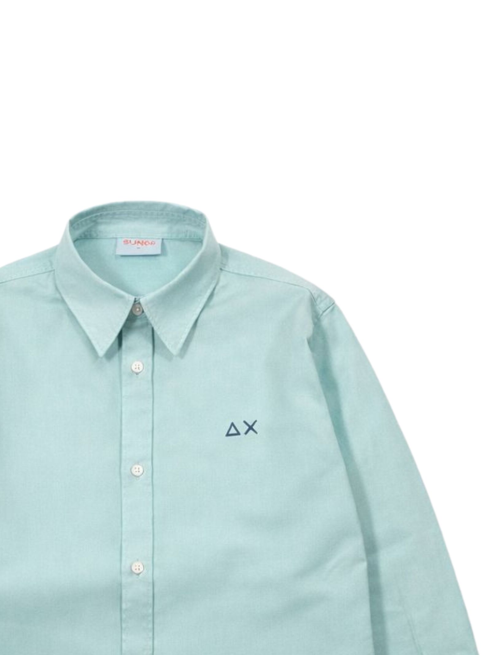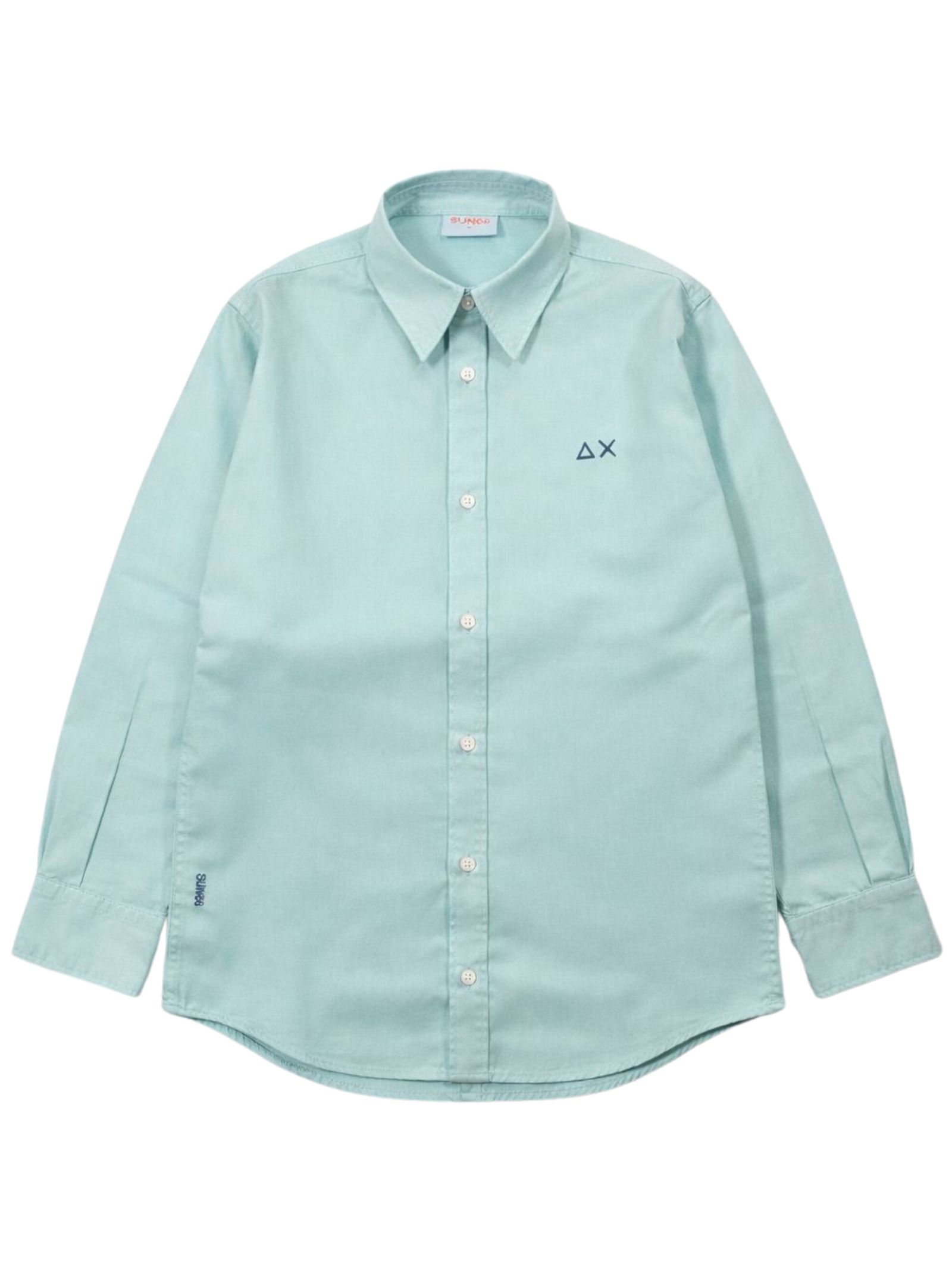 Sun68 Kids camicia di colore verde acqua, colletto classico, maniche lunghe con polsini, ricamo logo sul petto, orlo curvo, vestibilità regolare. Composizione: 100% cotone