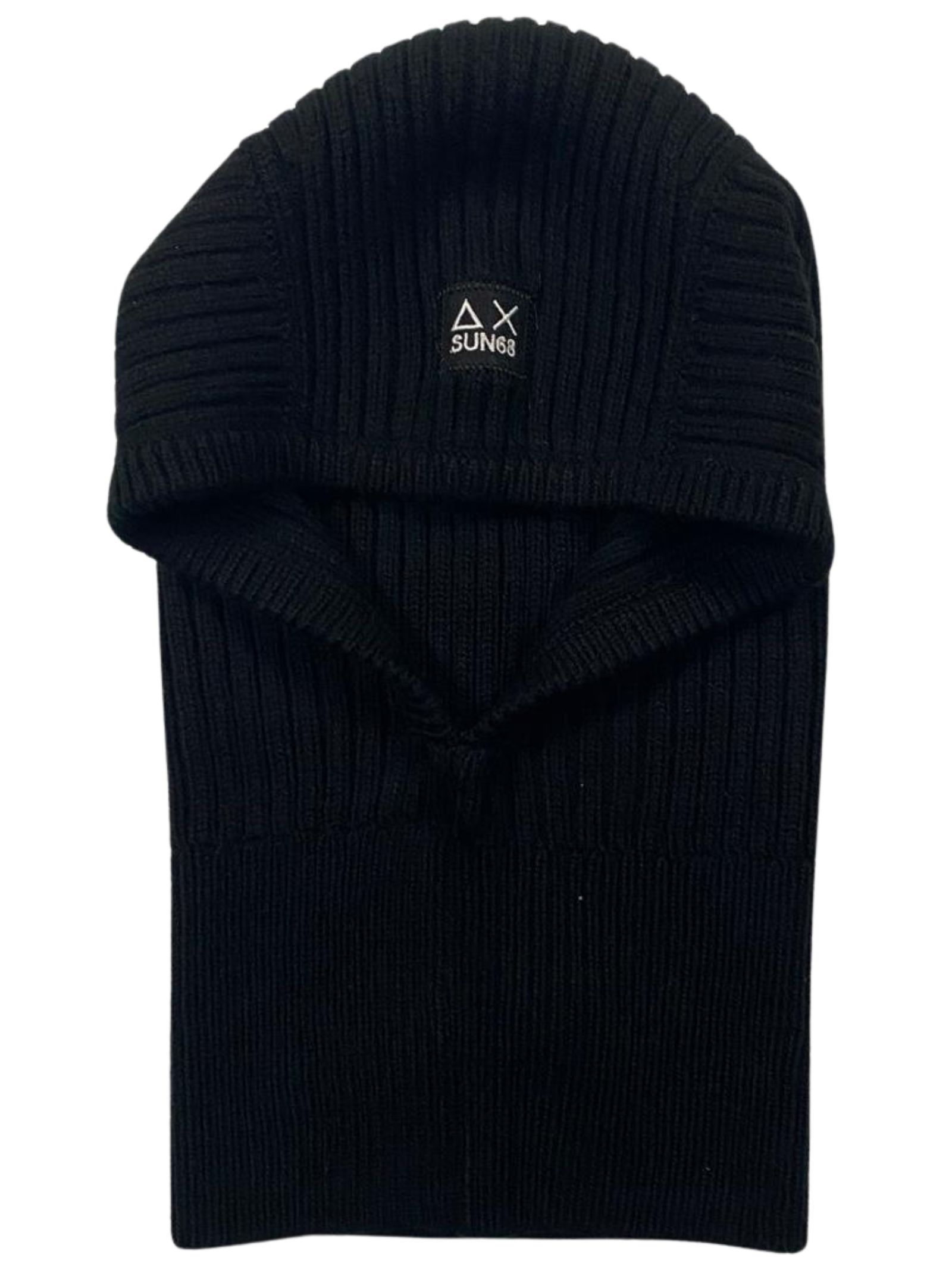 Sun68 Kids cappello di colore nero, realizzato a maglia, modello a cappuccio con collo, applicazione logo centrale a contrasto. Composizione: 50% lana merino 50% acrilica