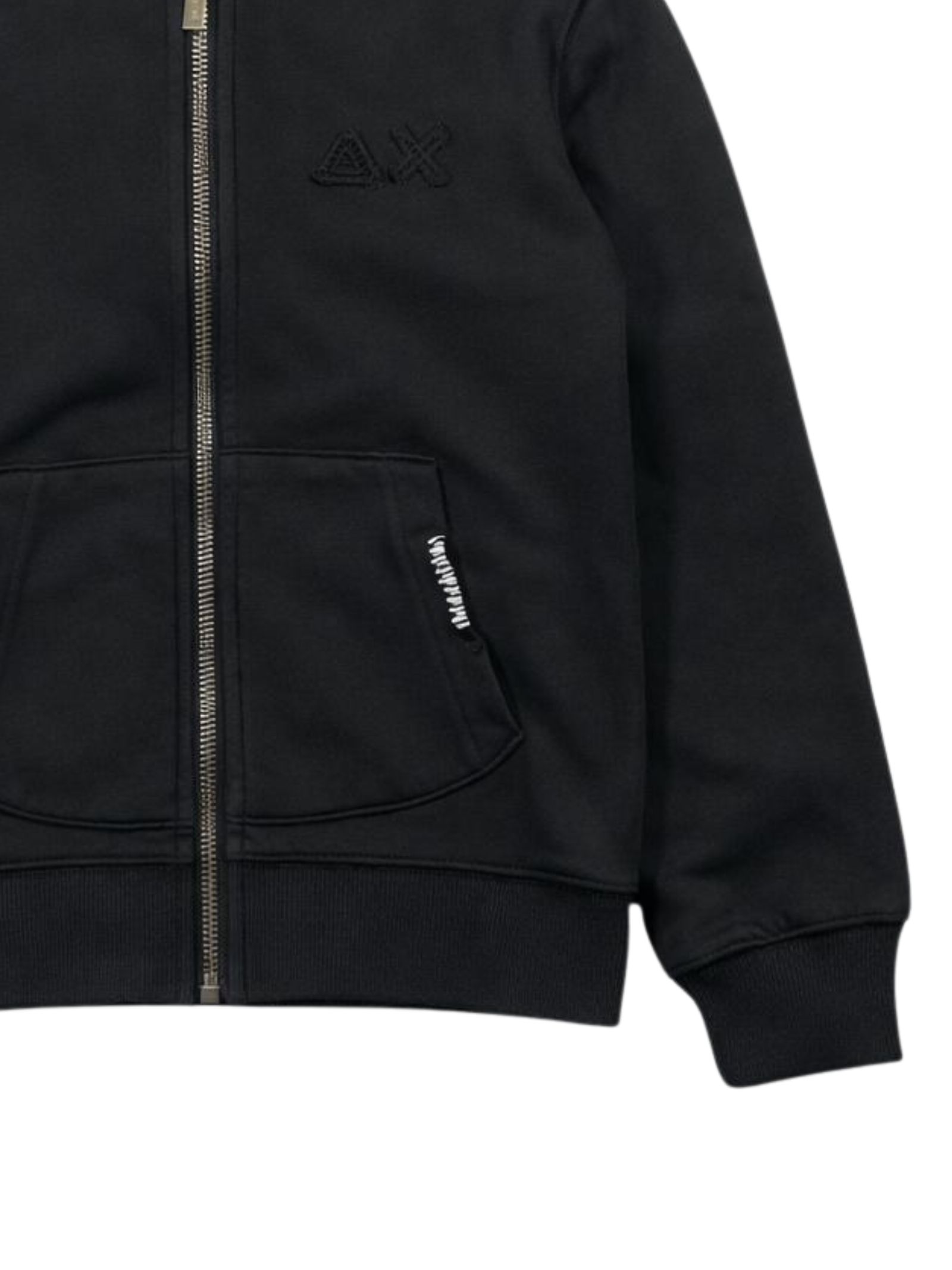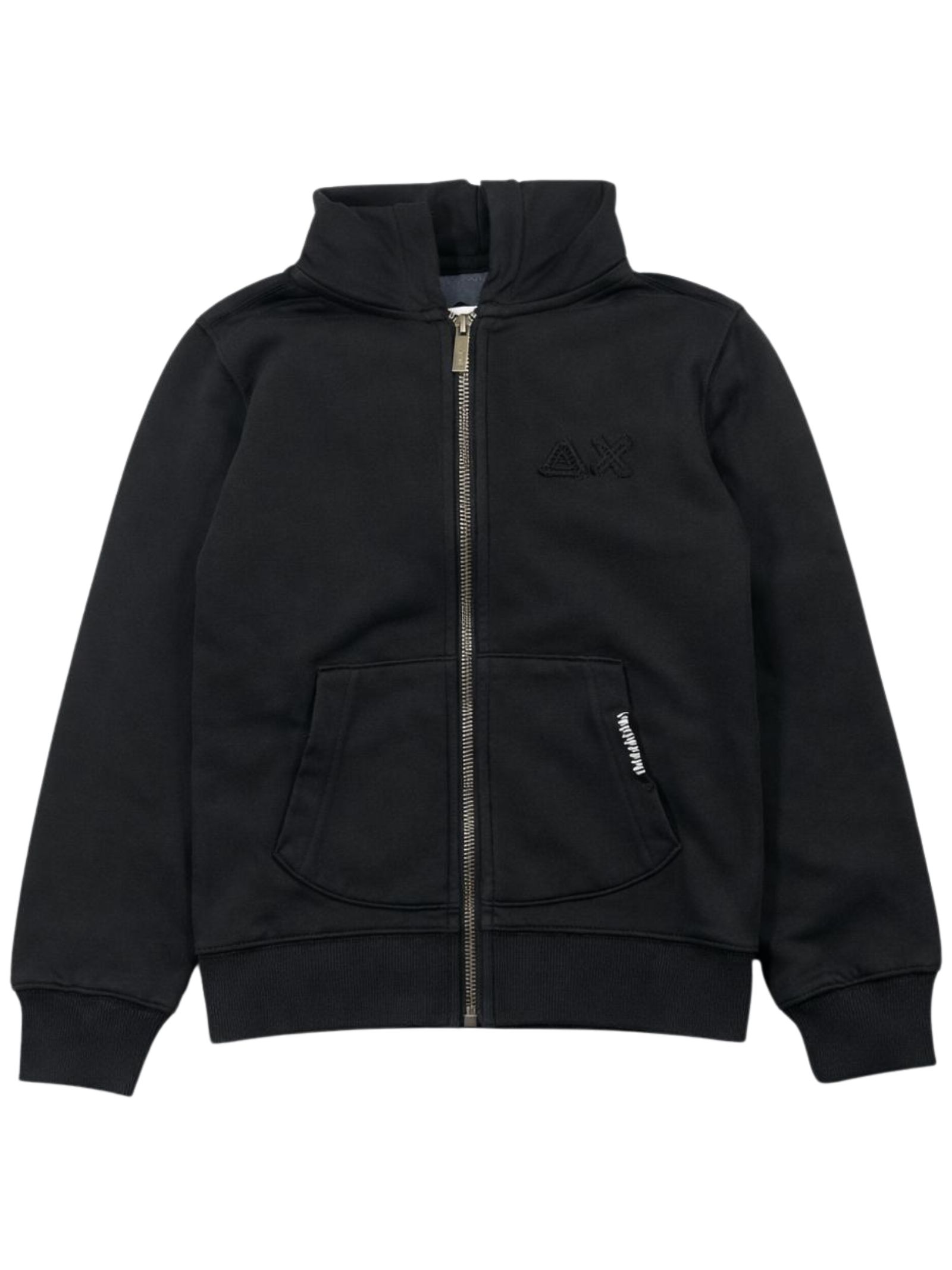 Sun68 Kids felpa di colore nero, modello con cappuccio, zip centrale, ricamo logo sul petto, due tasche laterali, vestibilità regolare. Composizione: 100% cotone
