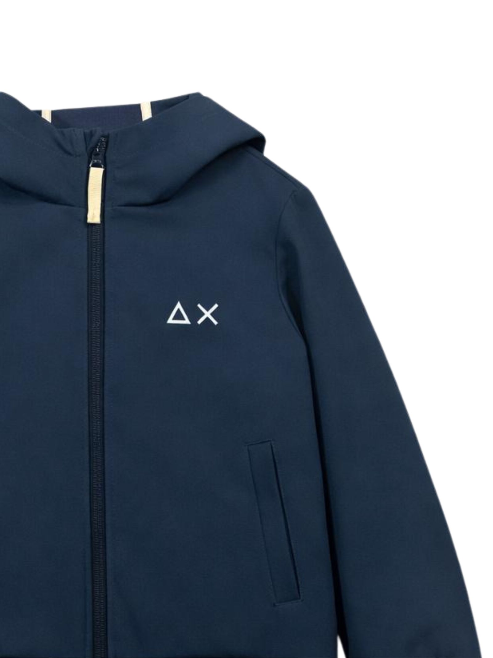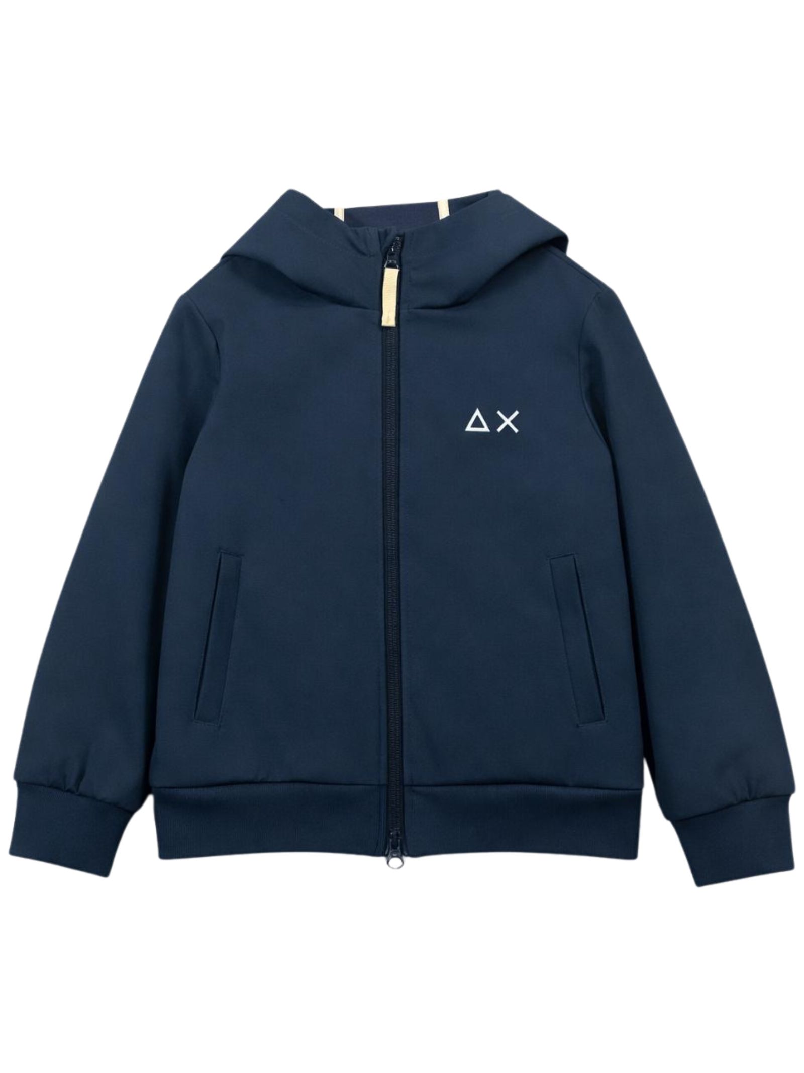 Sun68 Kids giubbino di colore blu, in tessuto liscio impermeabile, modello con cappuccio, stampa logo a contrasto sul petto, due tasche con zip, orli con fascia elastica, vesibilità regolare, modello richiudibile. Composizione: 92% Poliestere 8% elastan