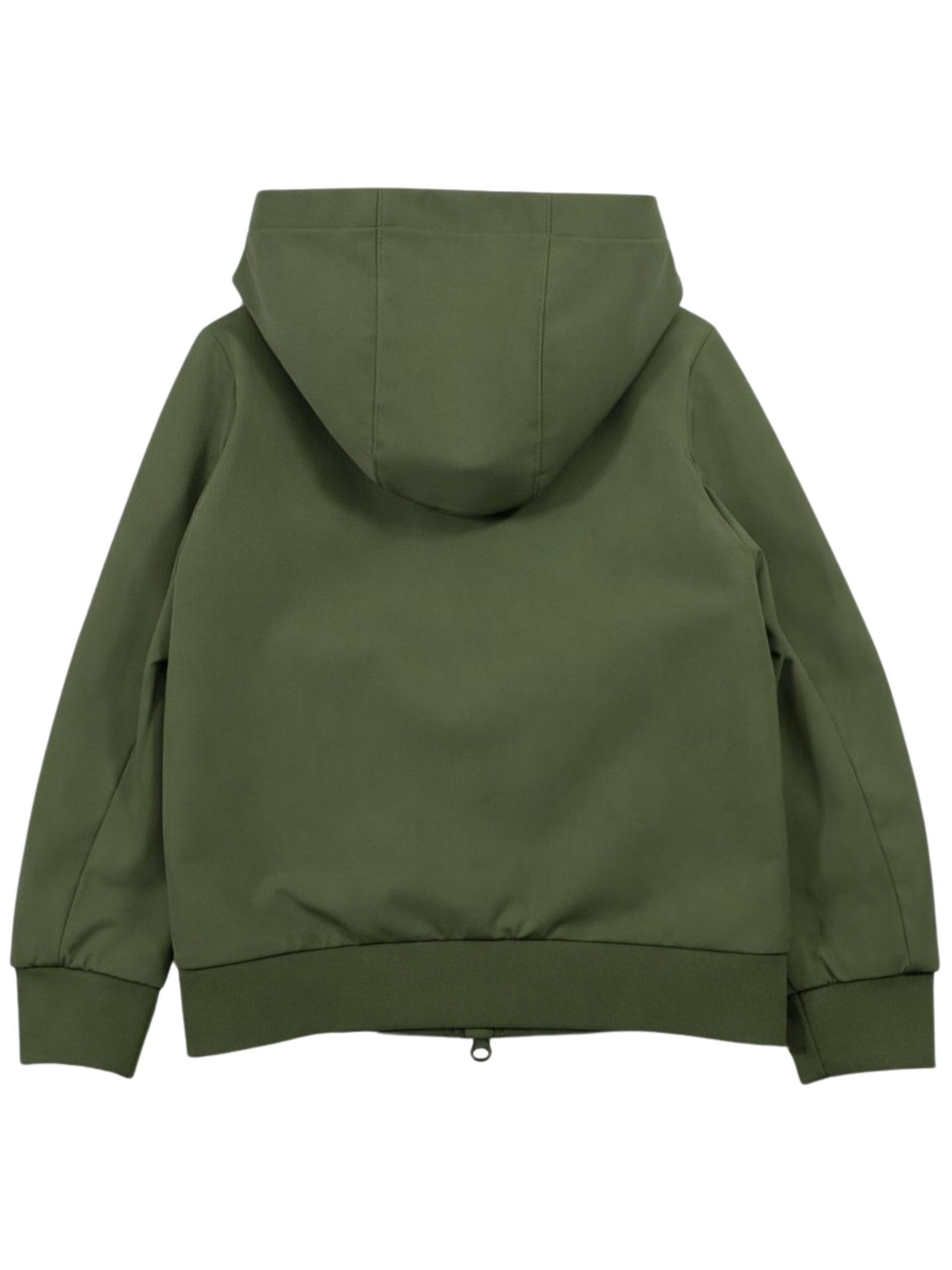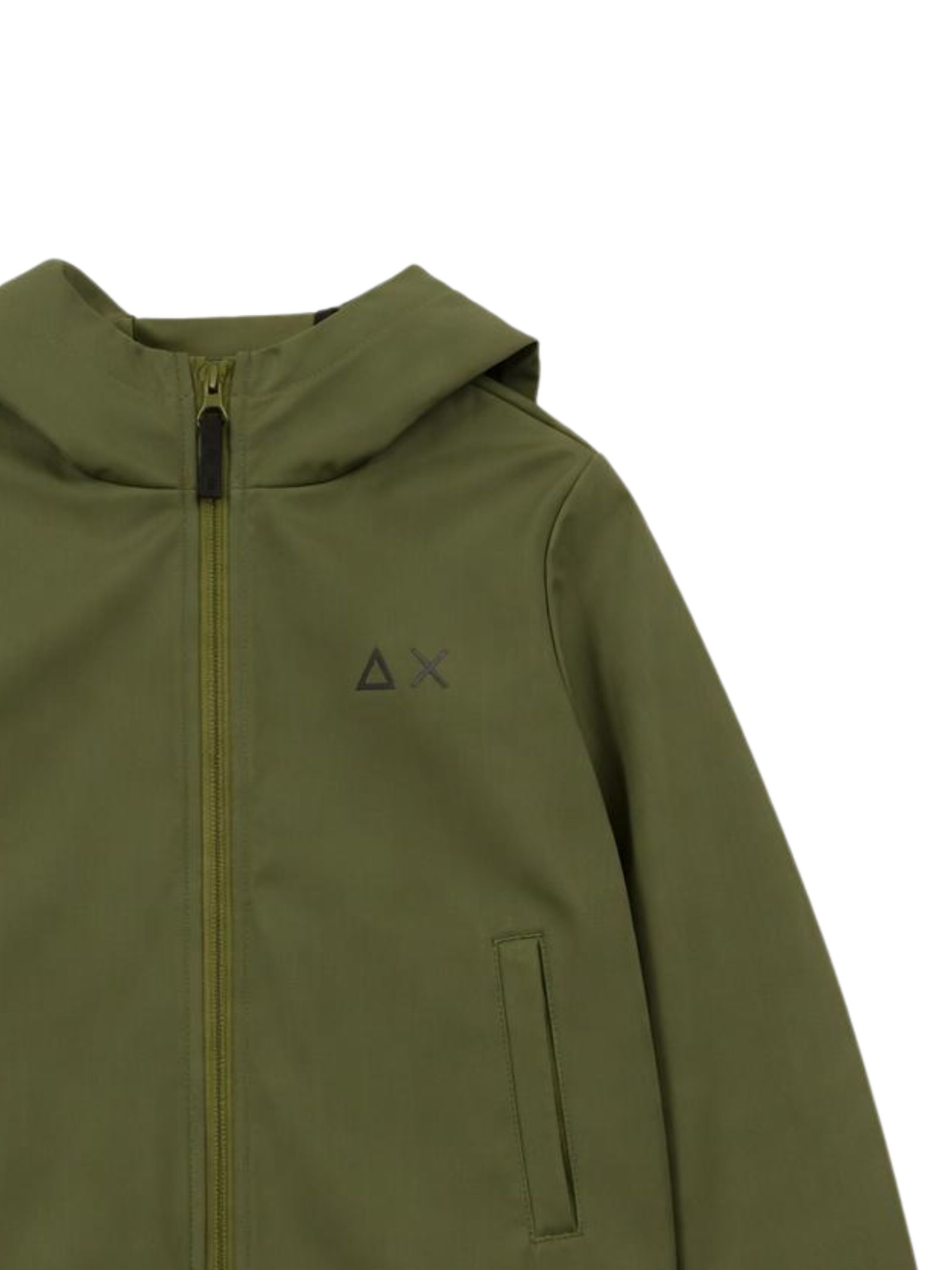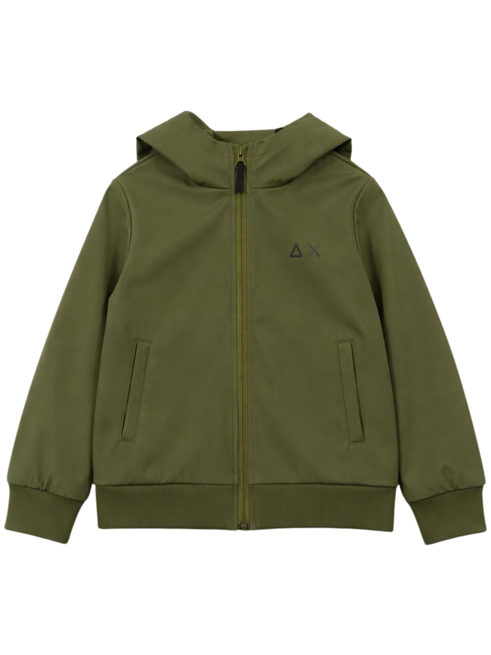 Sun68 Kids giubbino di colore verde, in tessuto liscio impermeabile, modello con cappuccio, stampa logo a contrasto sul petto, due tasche con zip, orli con fascia elastica, vesibilità regolare, modello richiudibile. Composizione: 92% Poliestere 8% elastan