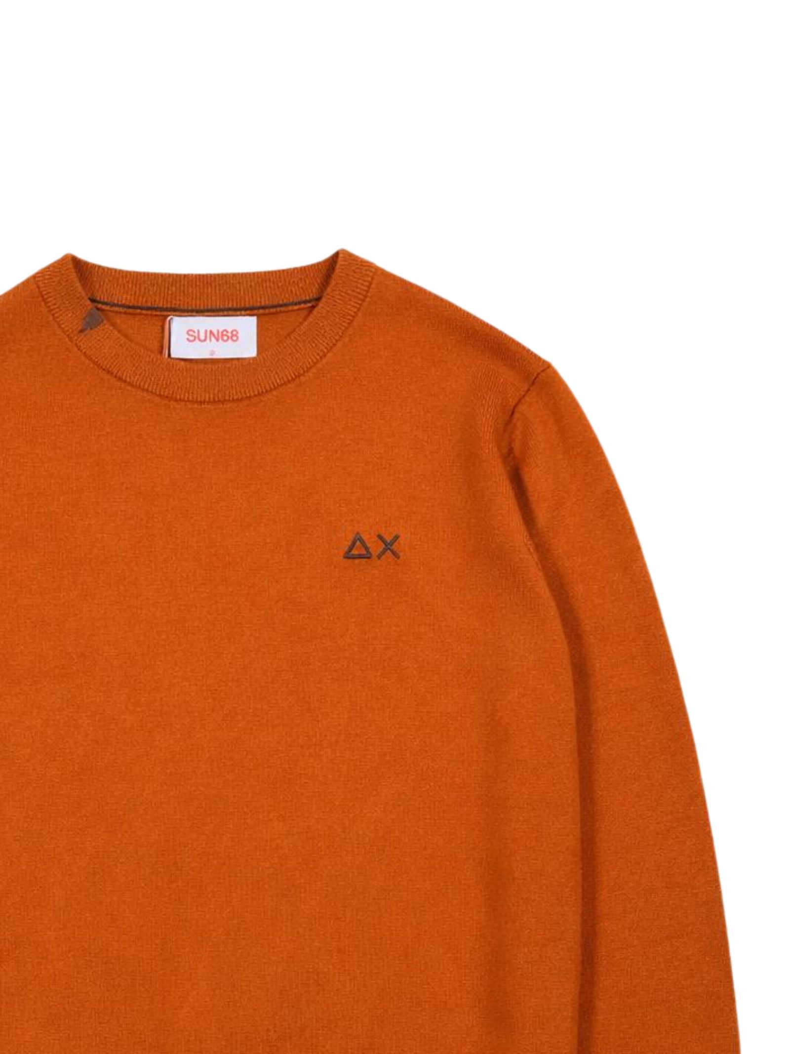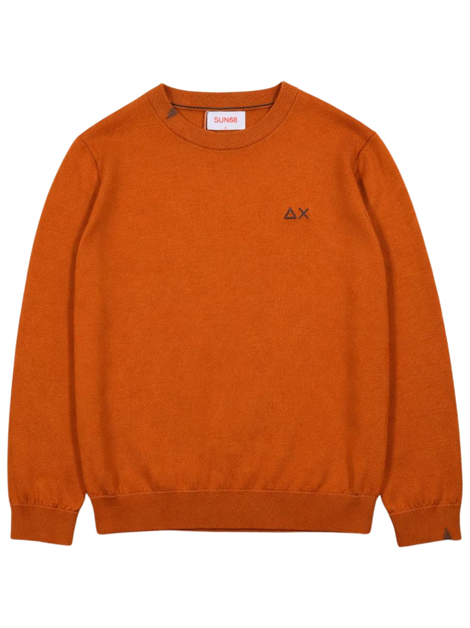 Sun68 Kids maglione di colore arancio, realizzato in maglia sottile, modello girocollo, manica lunga, caratterizzato da ricamo logo a contrasto sul petto, orli a costine, vestibilità regolare. Composizione: 100% cotone