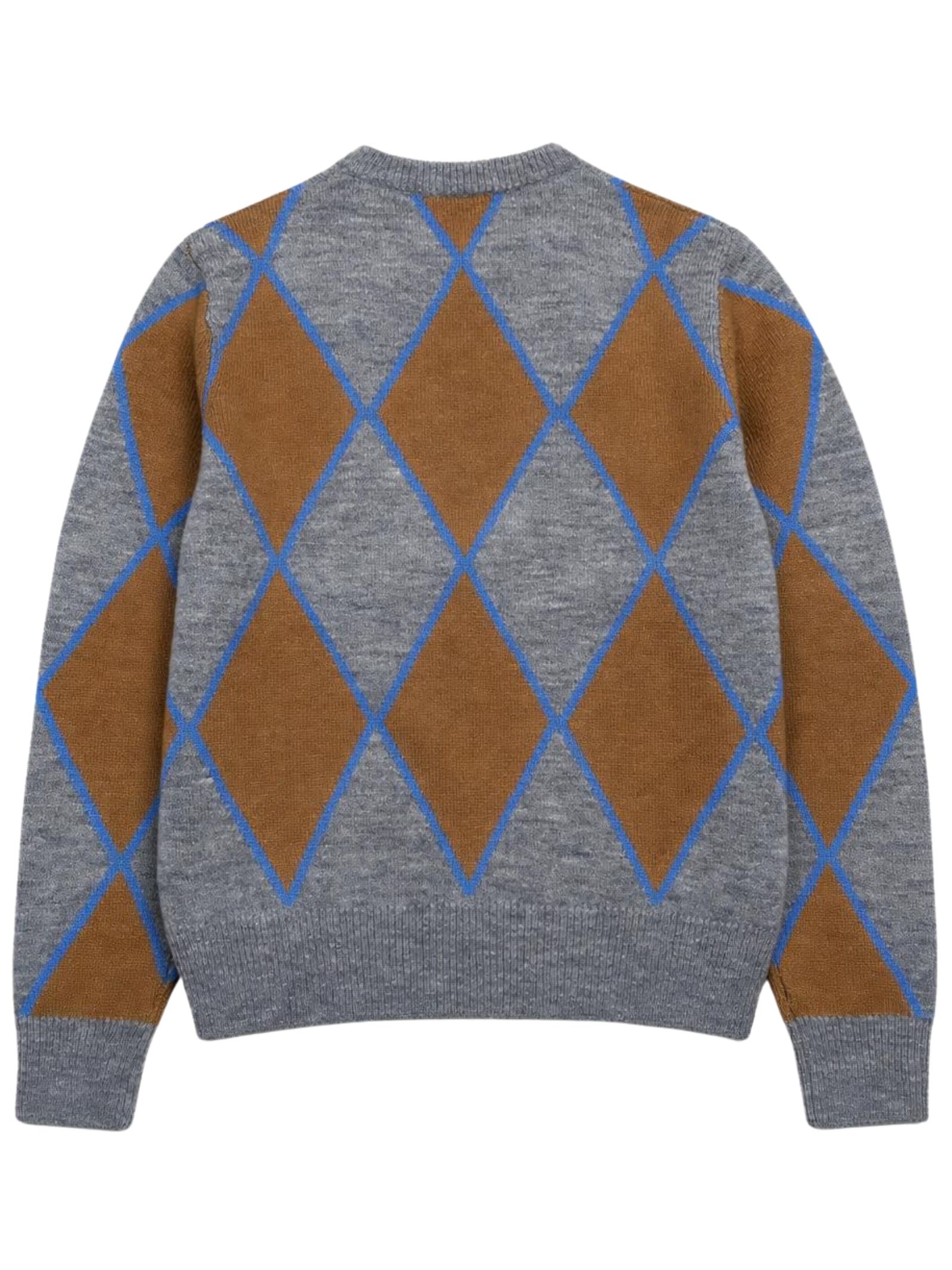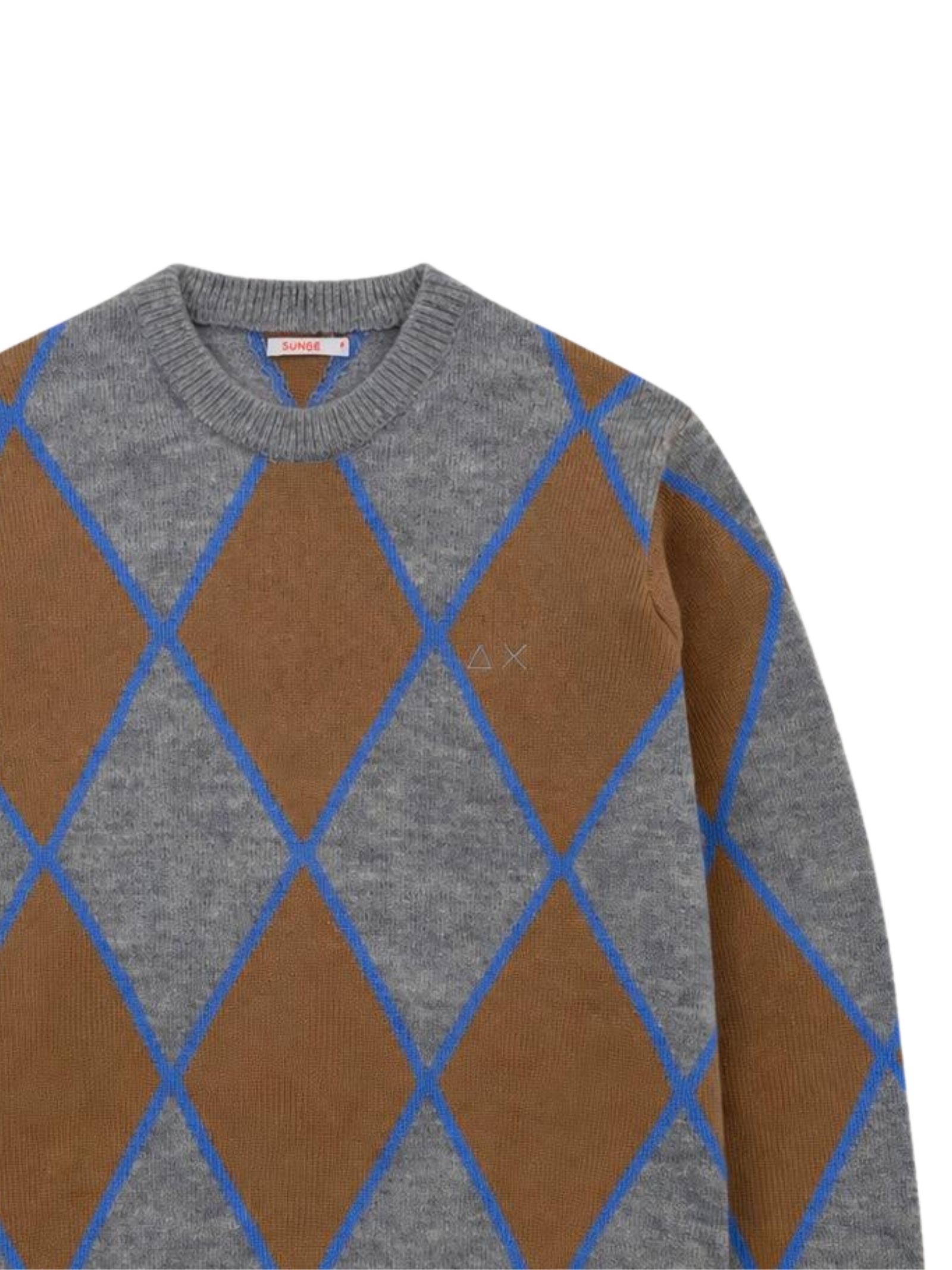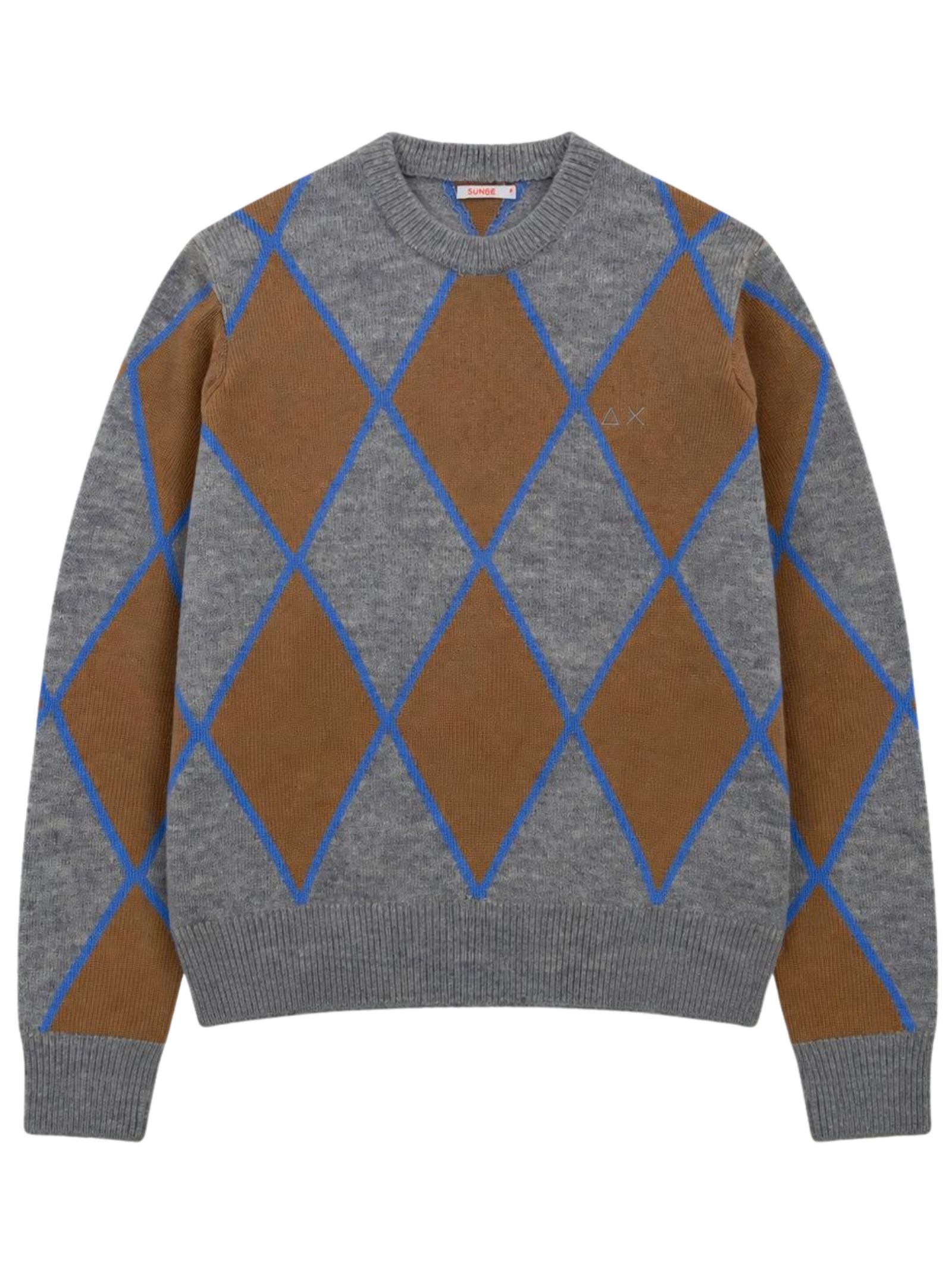Sun68 Kids maglione di colore grigio, fantasia rombi a contrasto, modello girocollo, manica lunga, ricamo logo a contrasto sul petto, orli a costine, vestibilità regolare. Composizione: 51% lana 20% poliammide 18% viscosa 8% alpaca 3% cashmere
