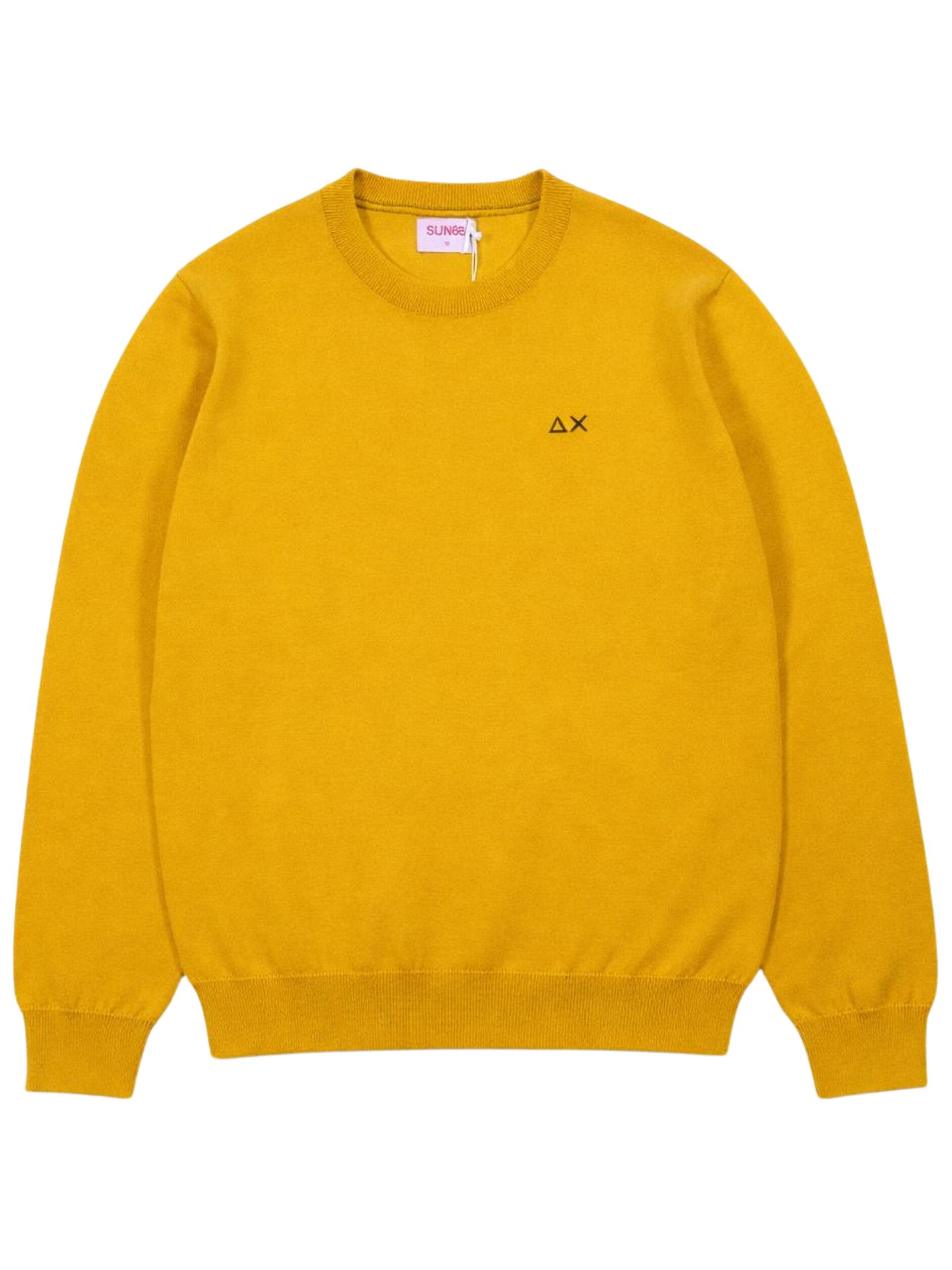Sun68 Kids maglione di colore giallo, modello girocollo, manica lunga, ricamo logo a contrasto sul petto, orli a costine, vestibilità regolare. Composizione: 50% lana merino 50% cotone