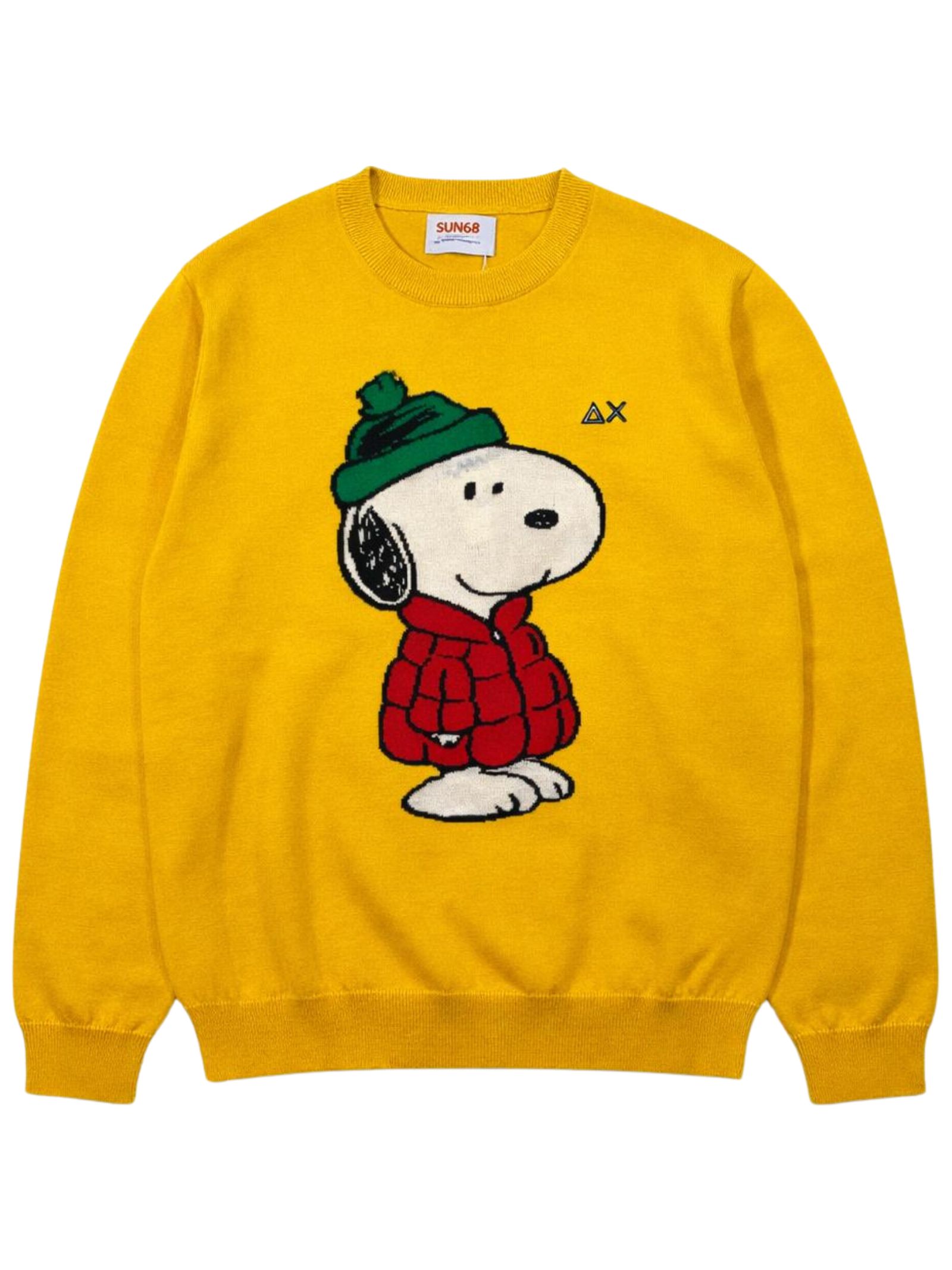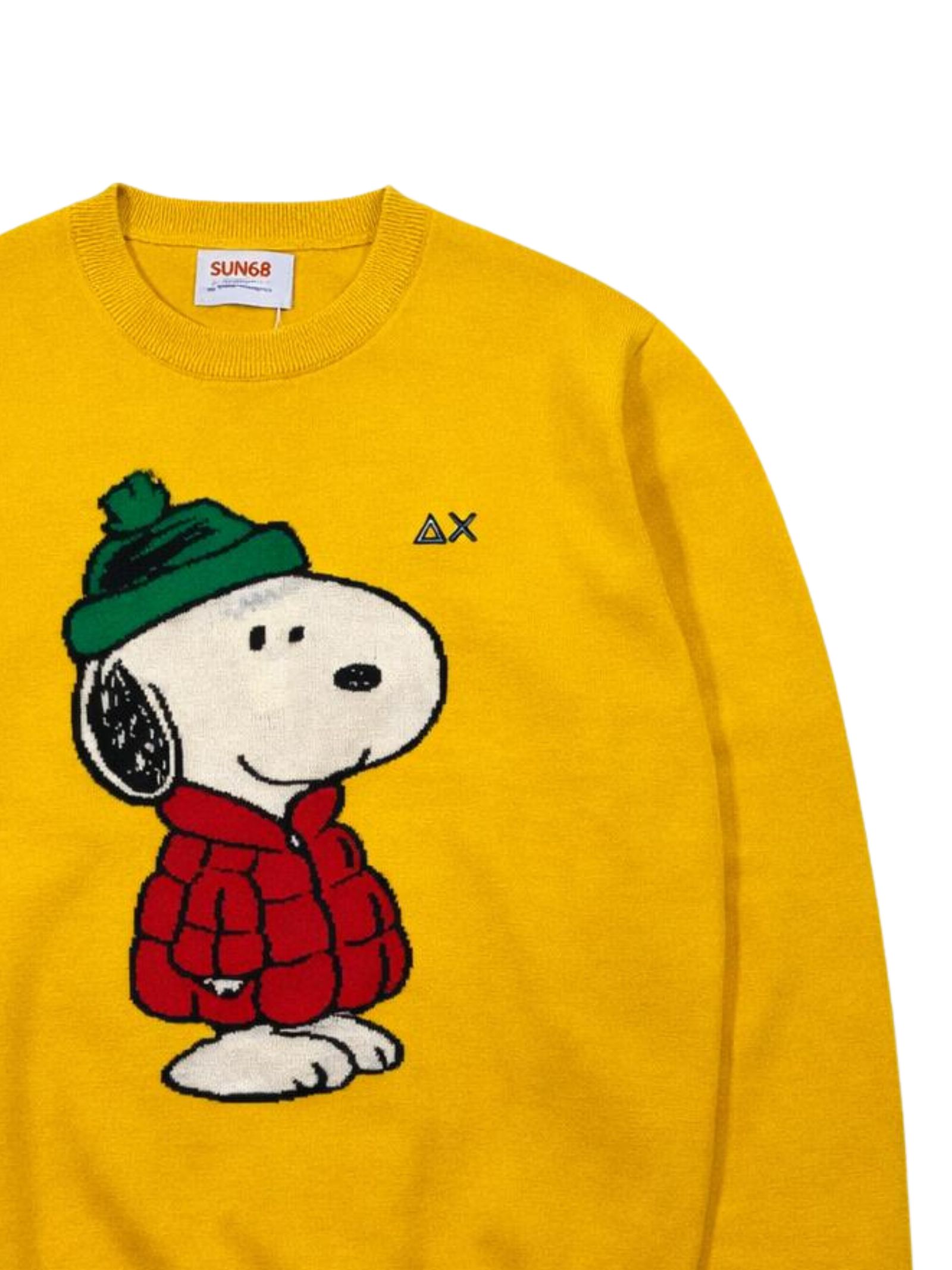 Sun68 Kids maglione di colore giallo, intarsio Snoopy centrale a contrasto, modello girocollo, manica lunga, ricamo logo a contrasto sul petto, orli a costine, vestibilità regolare. Composizione: 50% lana merino 50% cotone
