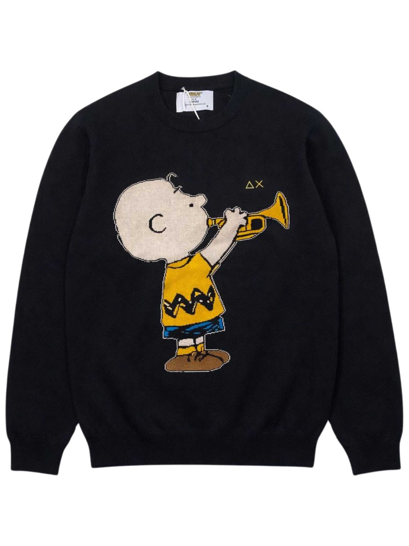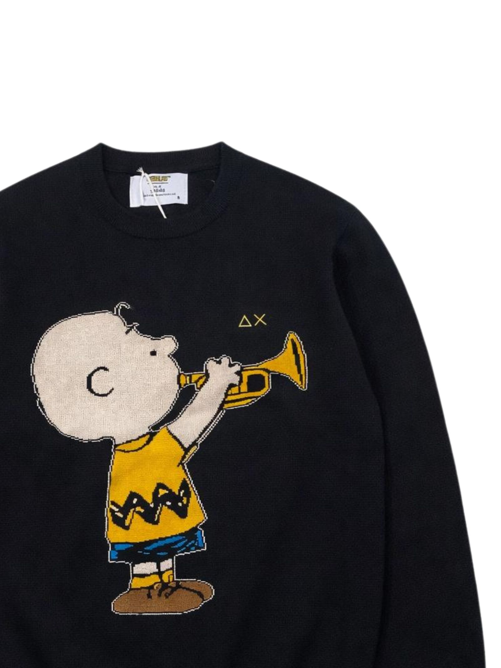 Sun68 Kids maglione di colore nero, intarsio personaggio di Snoopy centrale a contrasto, modello girocollo, manica lunga, ricamo logo a contrasto sul petto, orli a costine, vestibilità regolare. Composizione: 50% lana merino 50% cotone