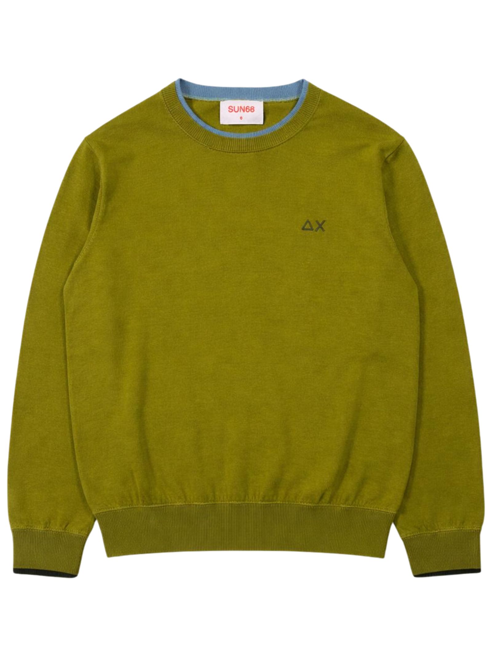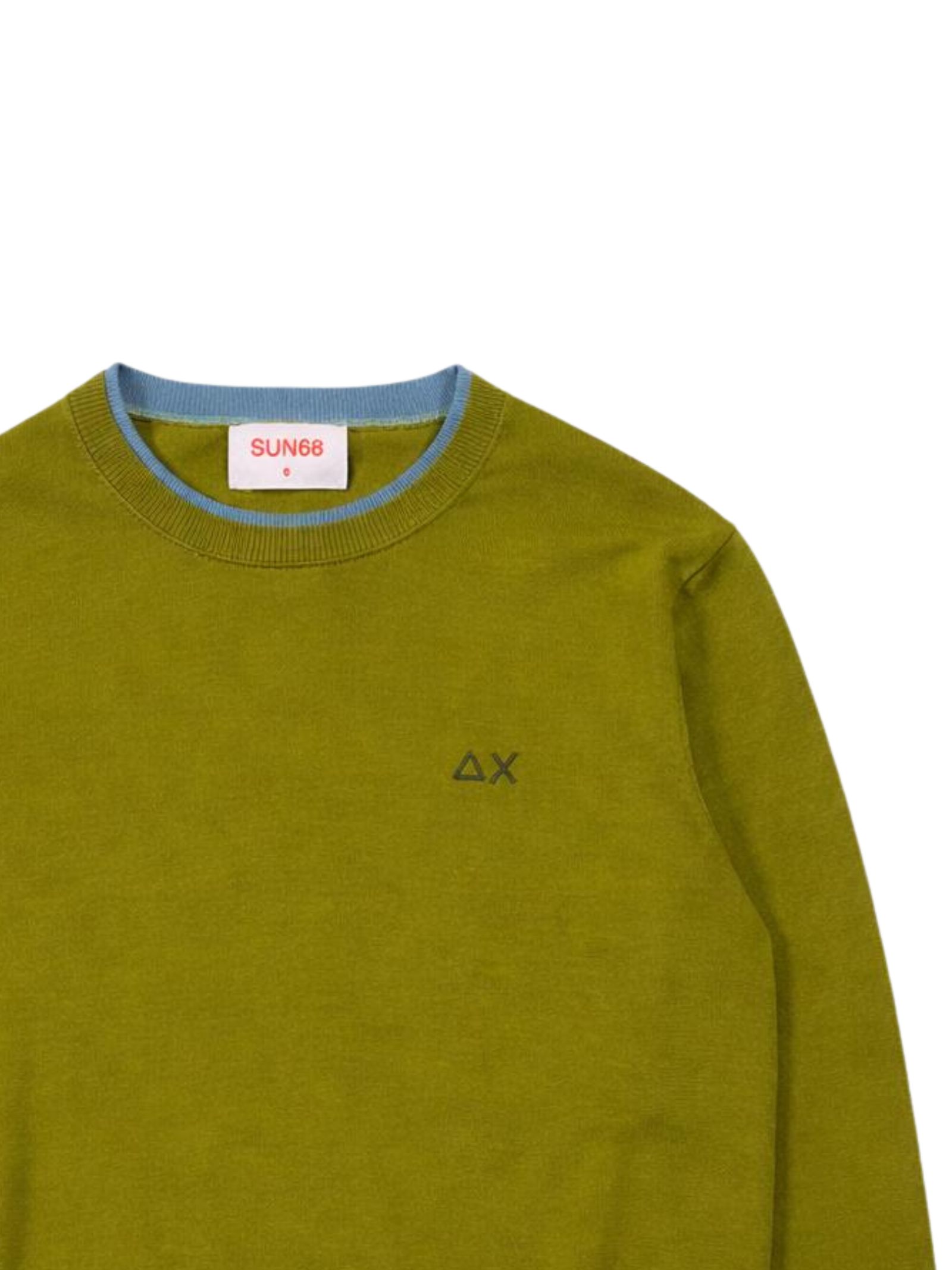 Sun68 Kids maglione di colore verde chiaro, dettagli a contrasto, realizzato in maglia sottile, modello girocollo, manica lunga, caratterizzato da ricamo logo a contrasto sul petto, orli a costine, vestibilità regolare. Composizione: 100% cotone