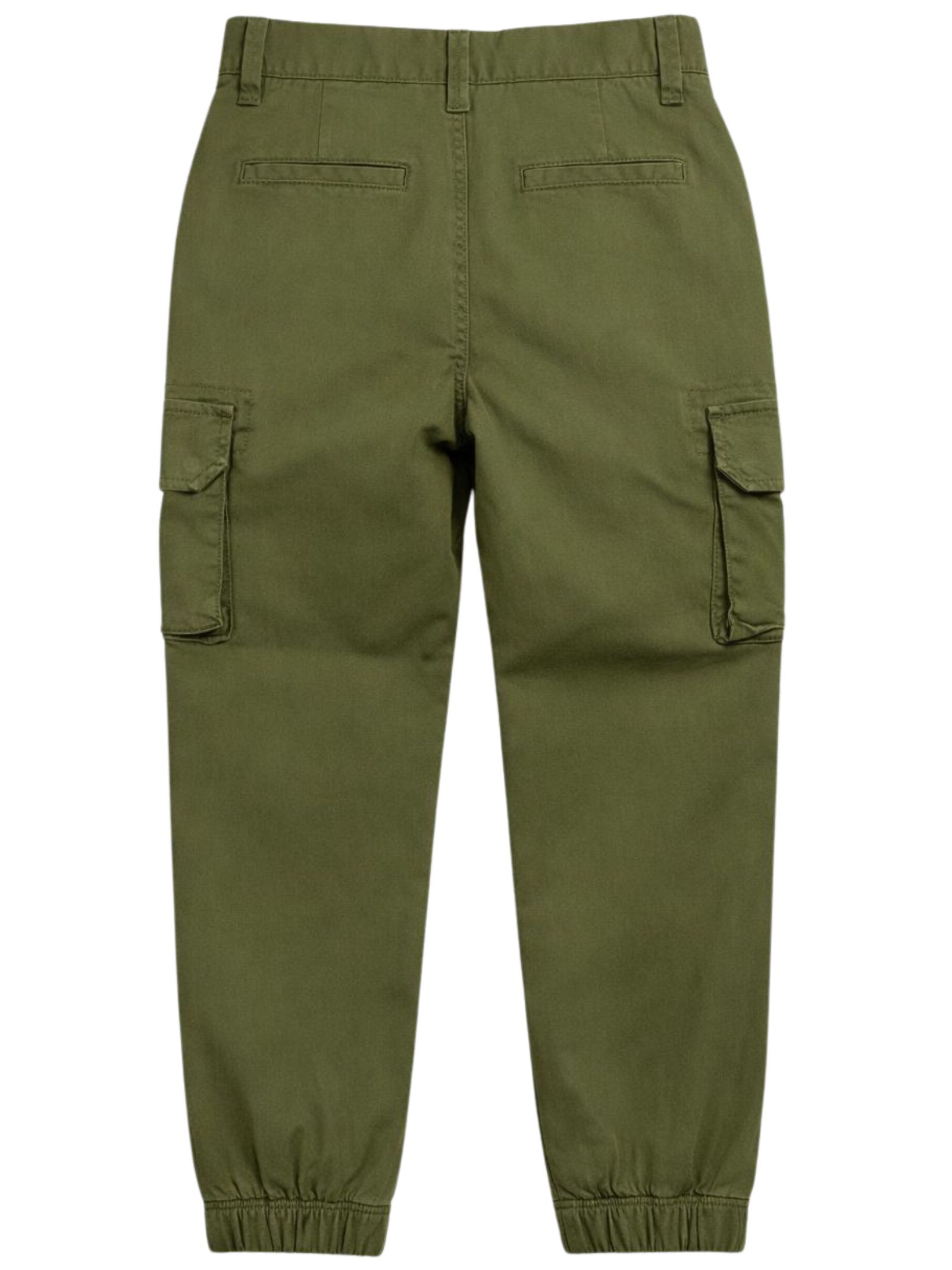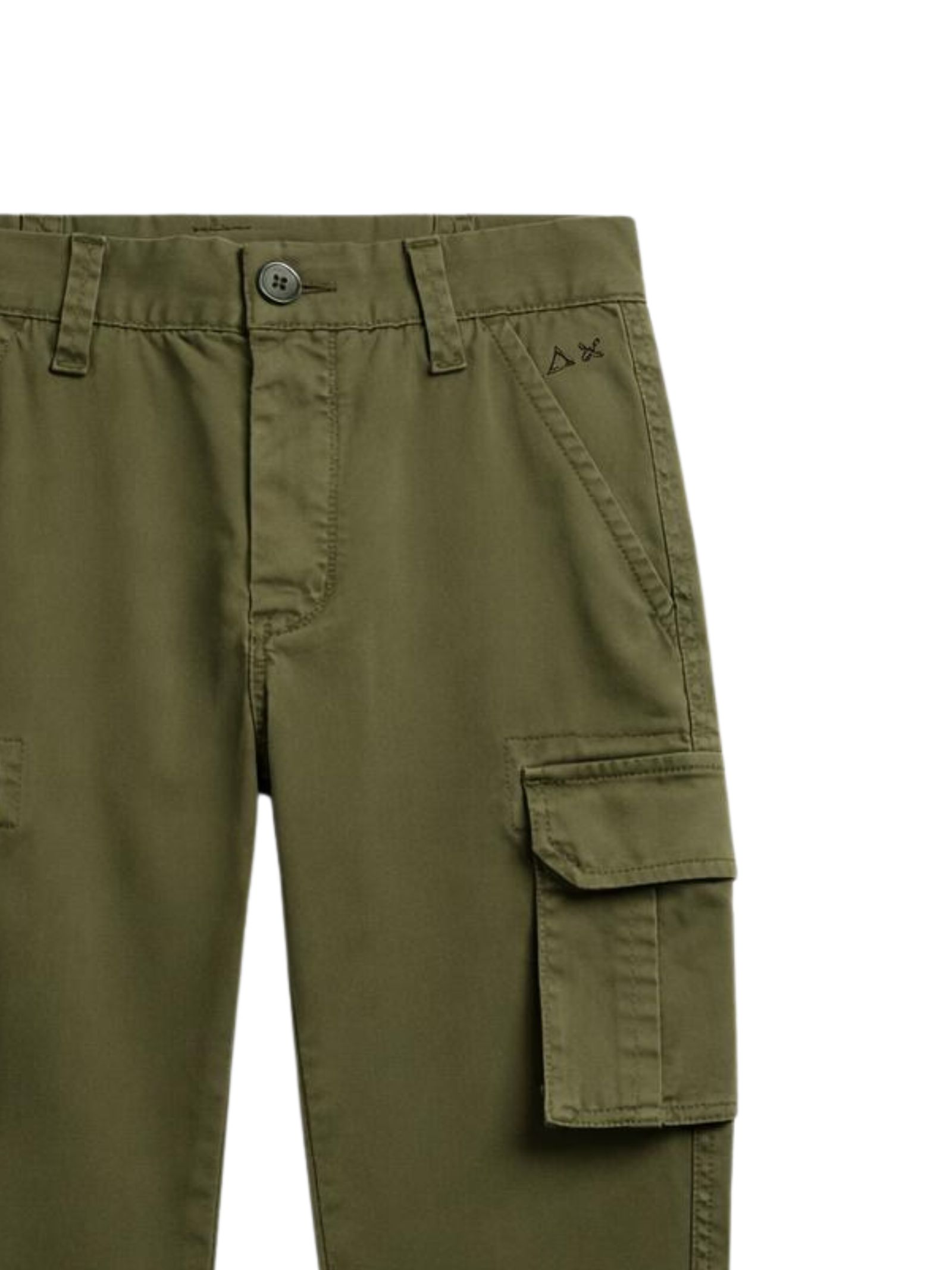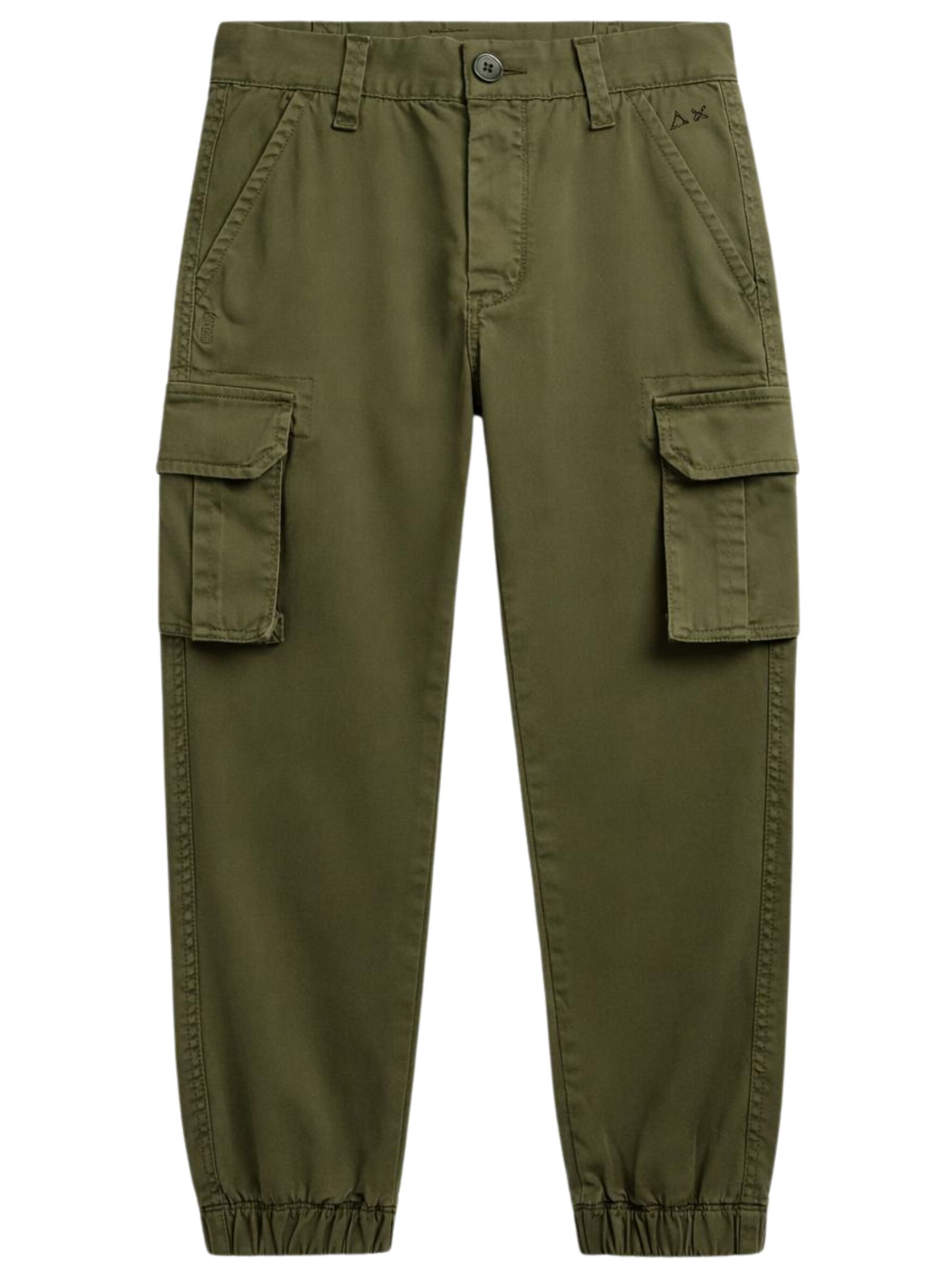 Sun68 Kids pantalone di colore verde, modello con vita regolare, passanti, due tasche laterali, due tasche a fessura sul retro, ricamo logo, due tasche cargo applicate, caviglie con elastici, vestibilità regolare. Composizione: 97% cotone 3% elastan