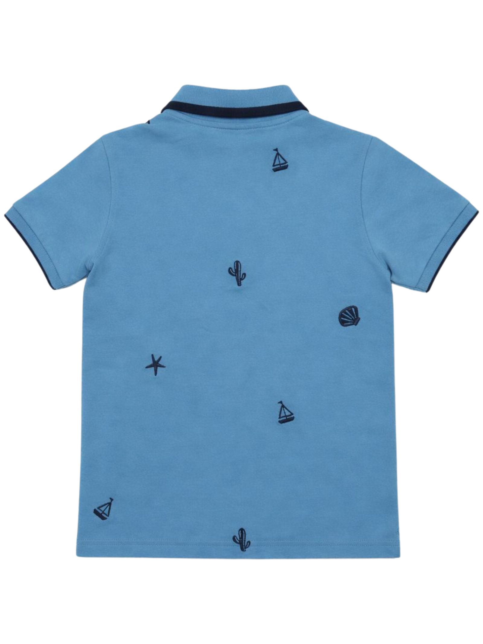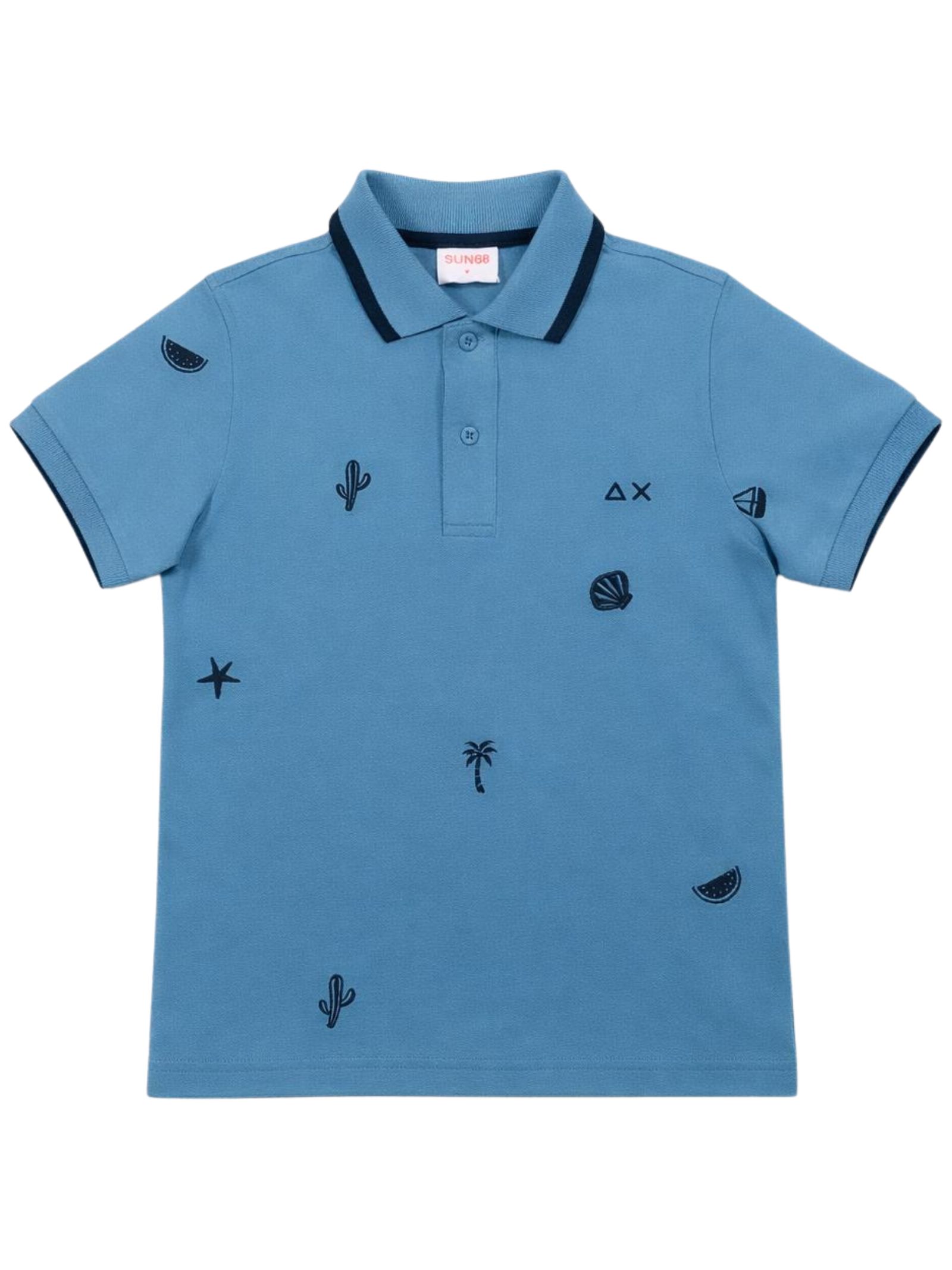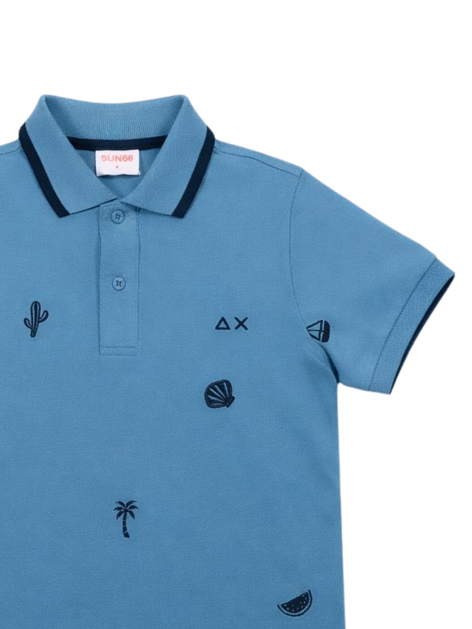 Sun68 Kids polo di colore avio, realizzata in cotone piquet, ricami sparsi a contrasto su tutta la superficie, mezza manica, logo ricamato sul petto, orlo dritto, vestibilità regolare. Composizione: 95% cotone 5% elastan