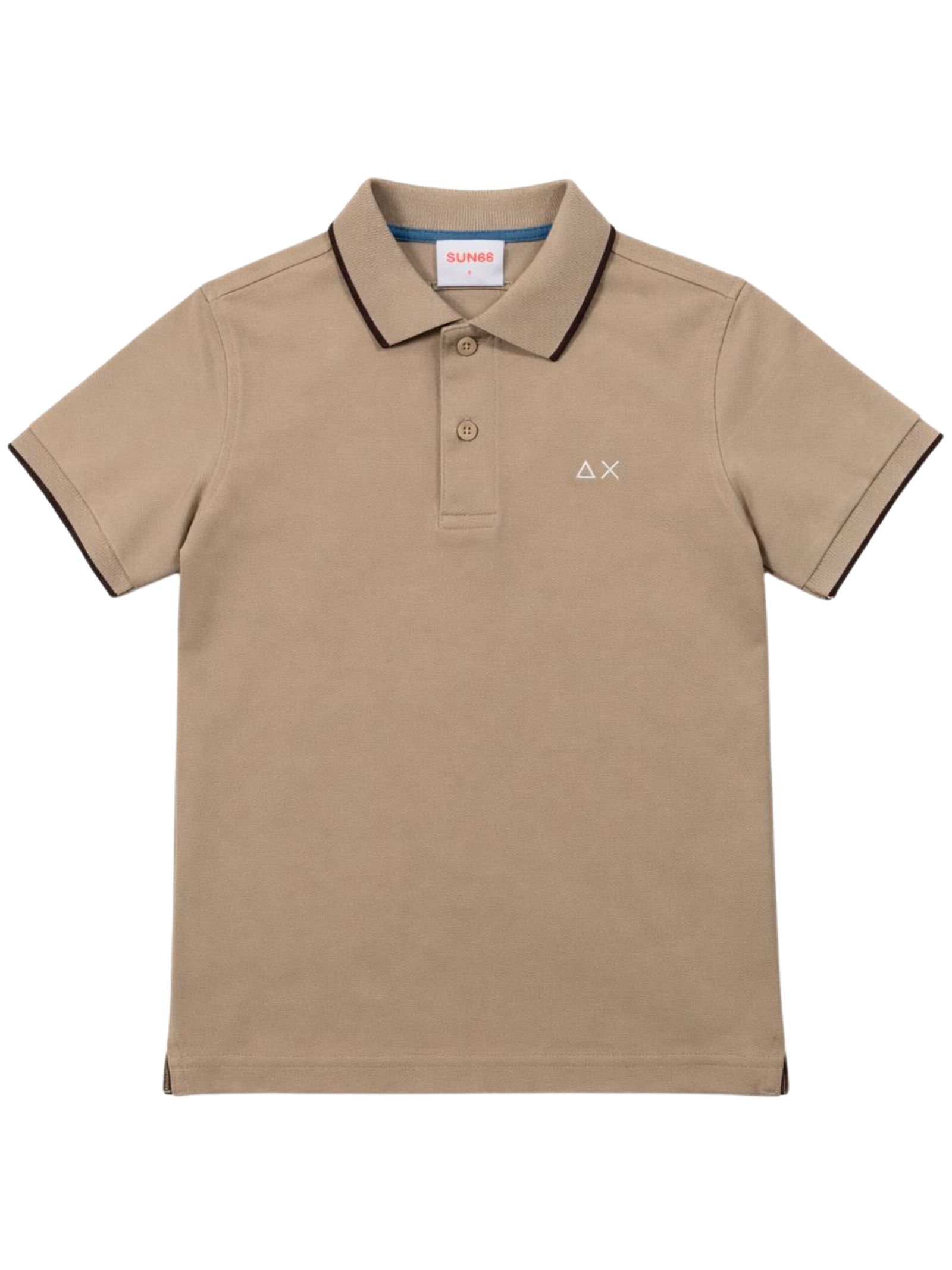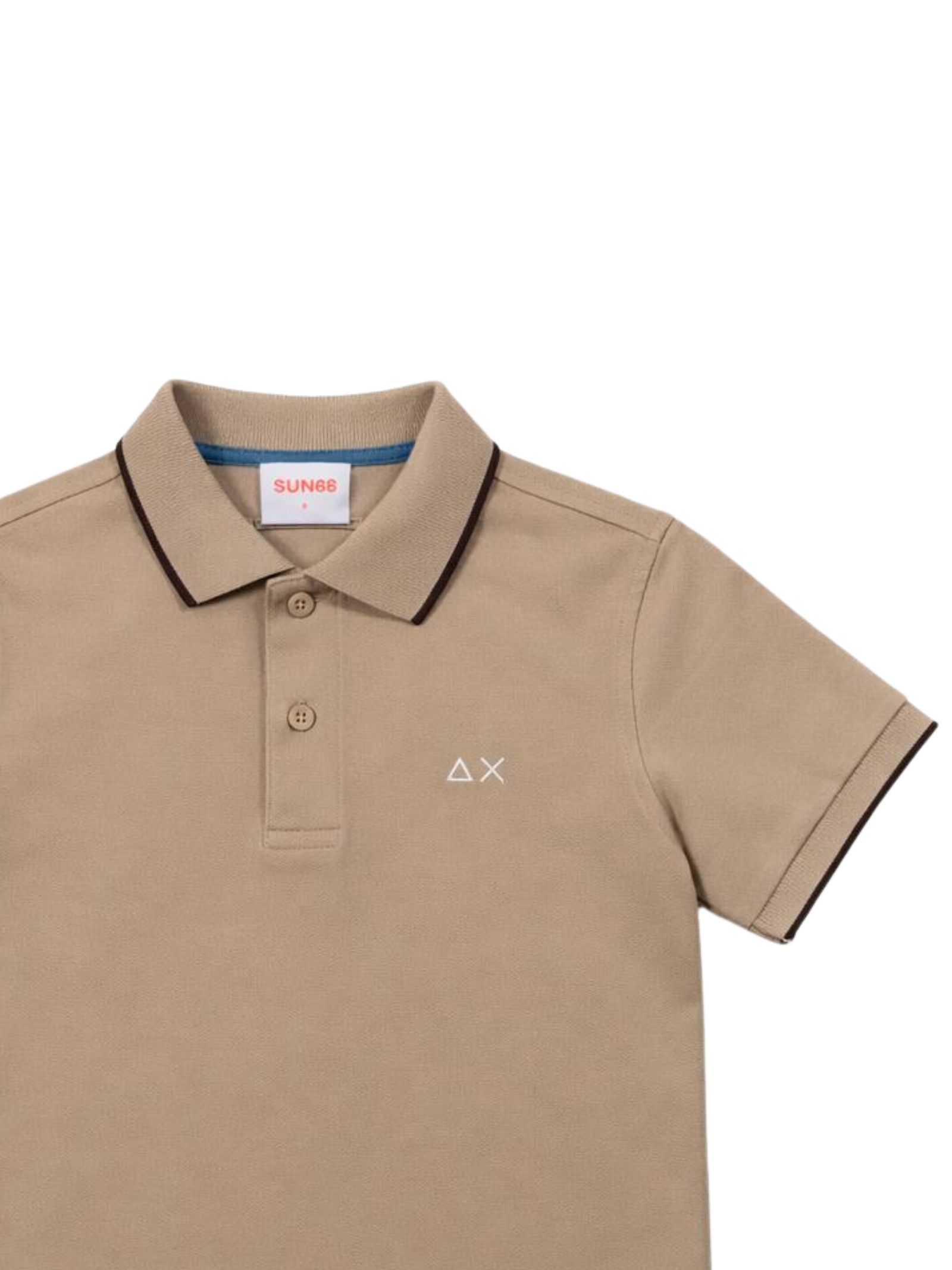 Sun68 Kids polo di colore beige, realizzata in cotone piquet, dettagli a contrasto, mezza manica, logo ricamato sul petto, orlo dritto, vestibilità regolare. Composizione: 95% cotone 5% elastan
