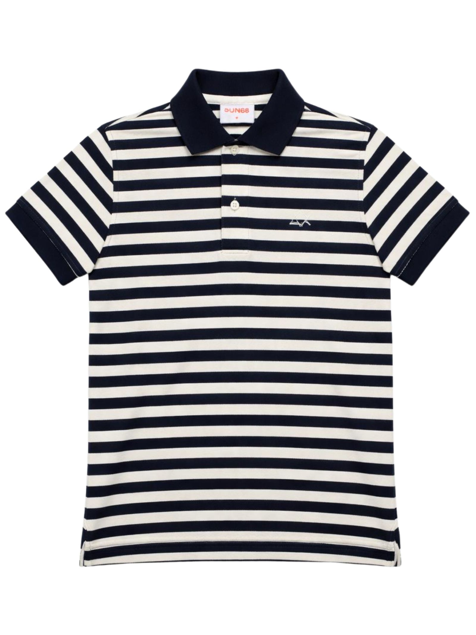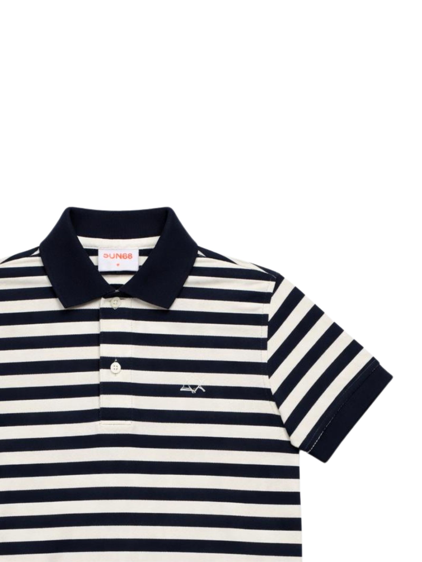 Sun68 Kids polo in fantasia a righe di colore blu/panna, realizzata in cotone piquet, mezza manica, logo ricamato sul petto, orlo dritto, vestibilità regolare. Composizione: 100% cotone