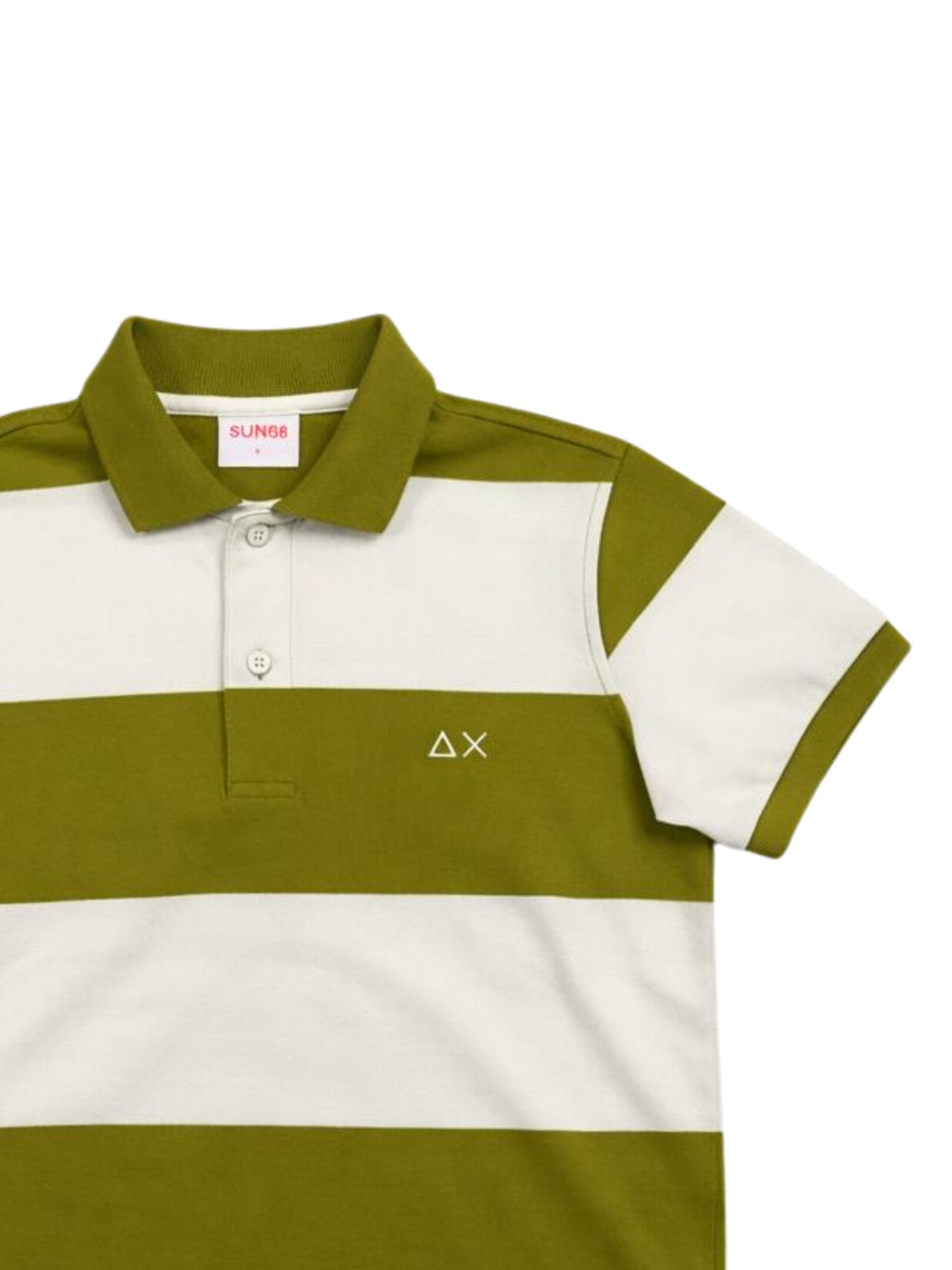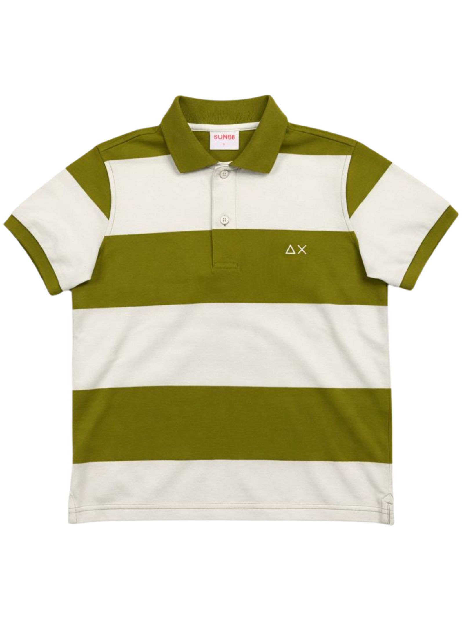 Sun68 Kids polo in fantasia a fascie di colore verde/panna, realizzata in cotone piquet, mezza manica, logo ricamato sul petto, orlo dritto, vestibilità regolare. Composizione: 100% cotone
