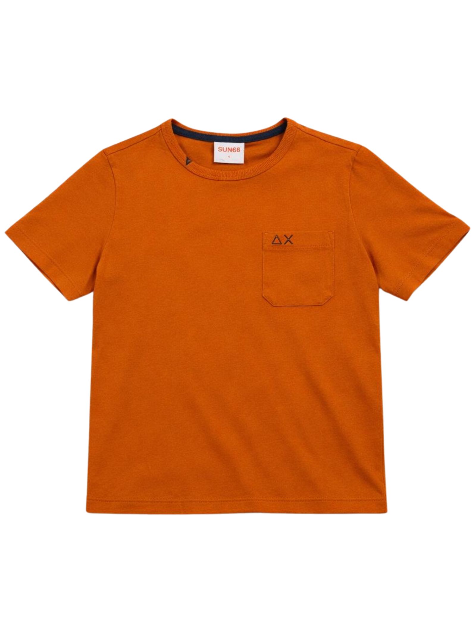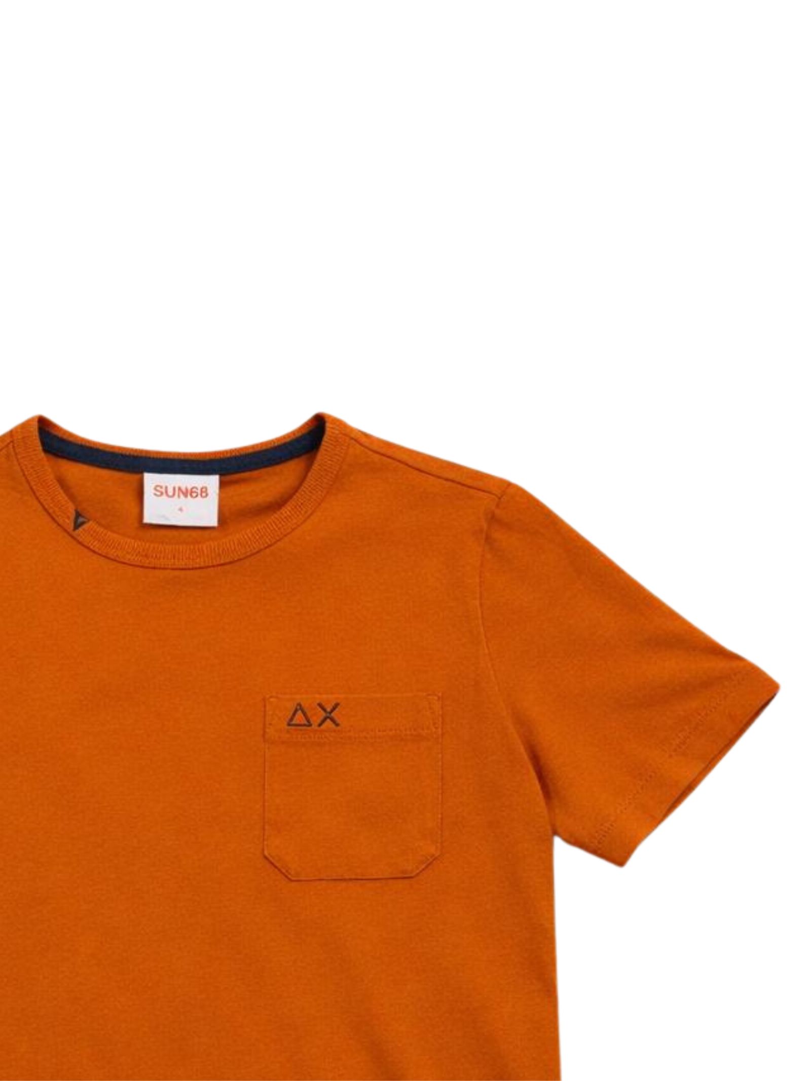 Sun68 Kids t-shirt di colore arancio, modello girocollo, mezza manica, taschino sul petto con ricamo logo a contrasto, orlo dritto, vestibilità regolare. Composizione: 100% cotone