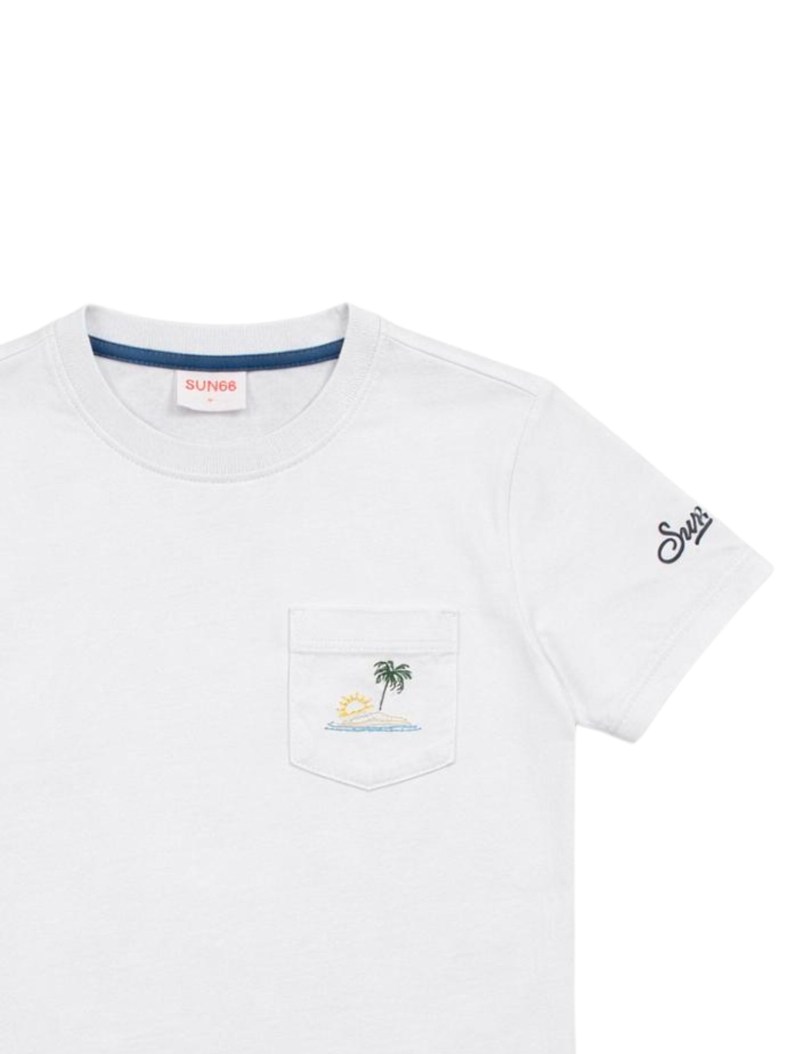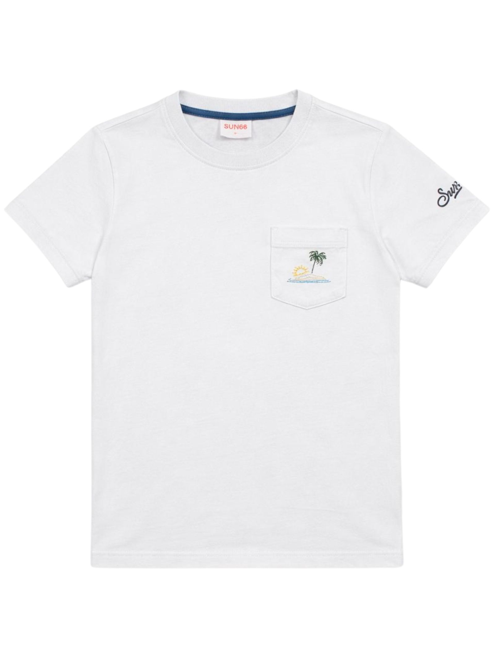 Sun68 Kids t-shirt di colore bianco, modello girocollo, mezza manica, taschino sul petto con ricamo multicolor, ricamo logo sul braccio a contrasto, orlo dritto, vestibilità regolare. Composizione: 100% cotone